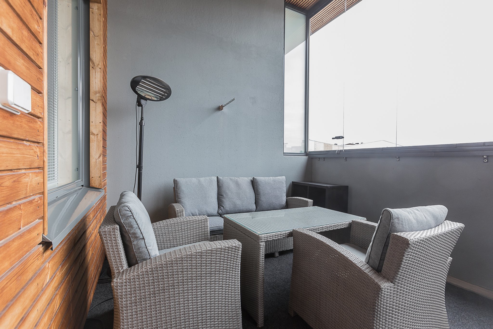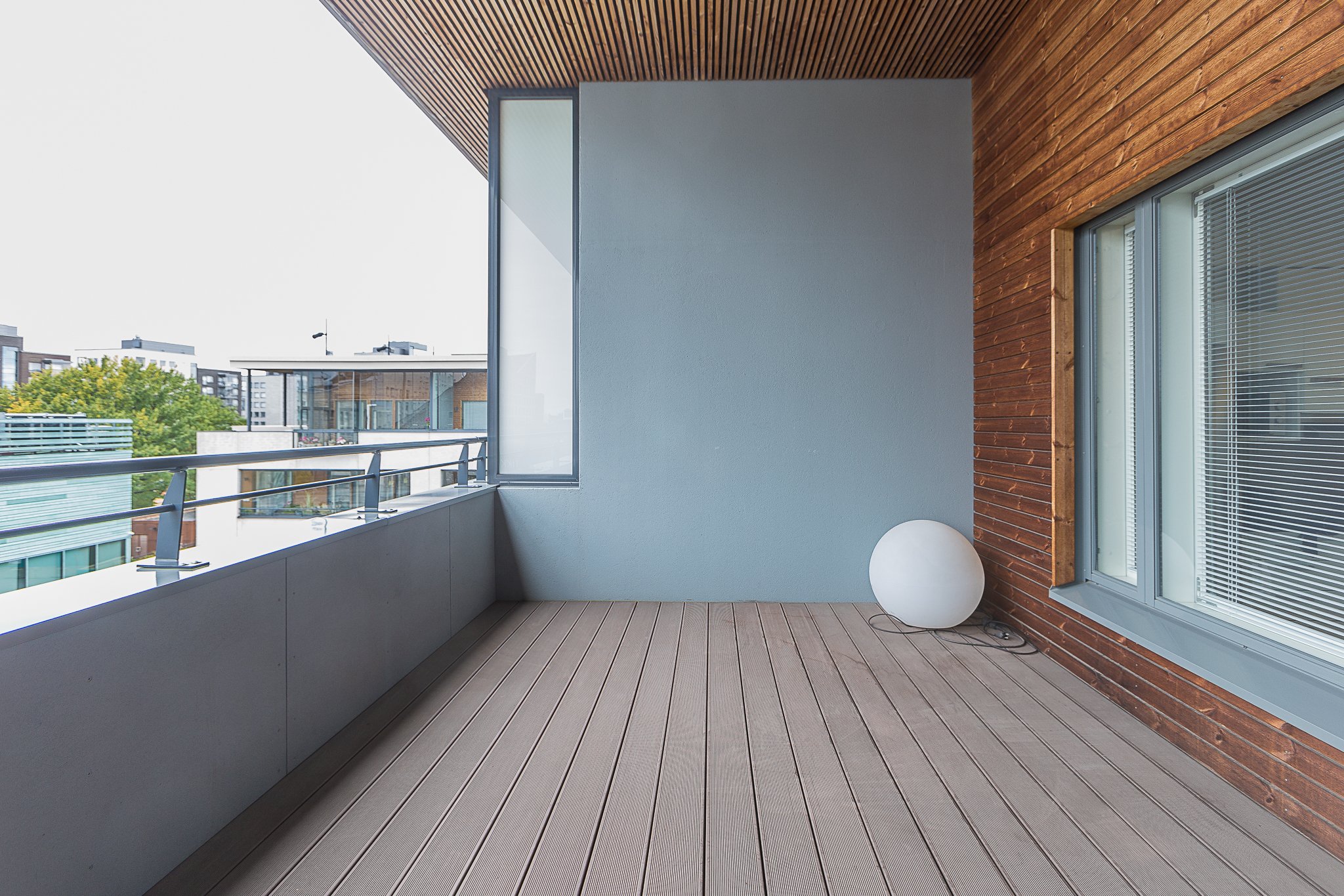 Olohuoneesta avautuu upea, tilava ja kaksiosainen parveke, joka on kivasti kahdessa tasossa. Toinen osa on lasitettu, ja tilan jakavat -tyylikkäät lasiovet. Parvekkeelta aukeavat upeat lännen suuntaiset näkymät Tikkurilantorille ja tämän kaltaisia parvekkeita löytyy vain ylimmän kerroksen asunnoista.