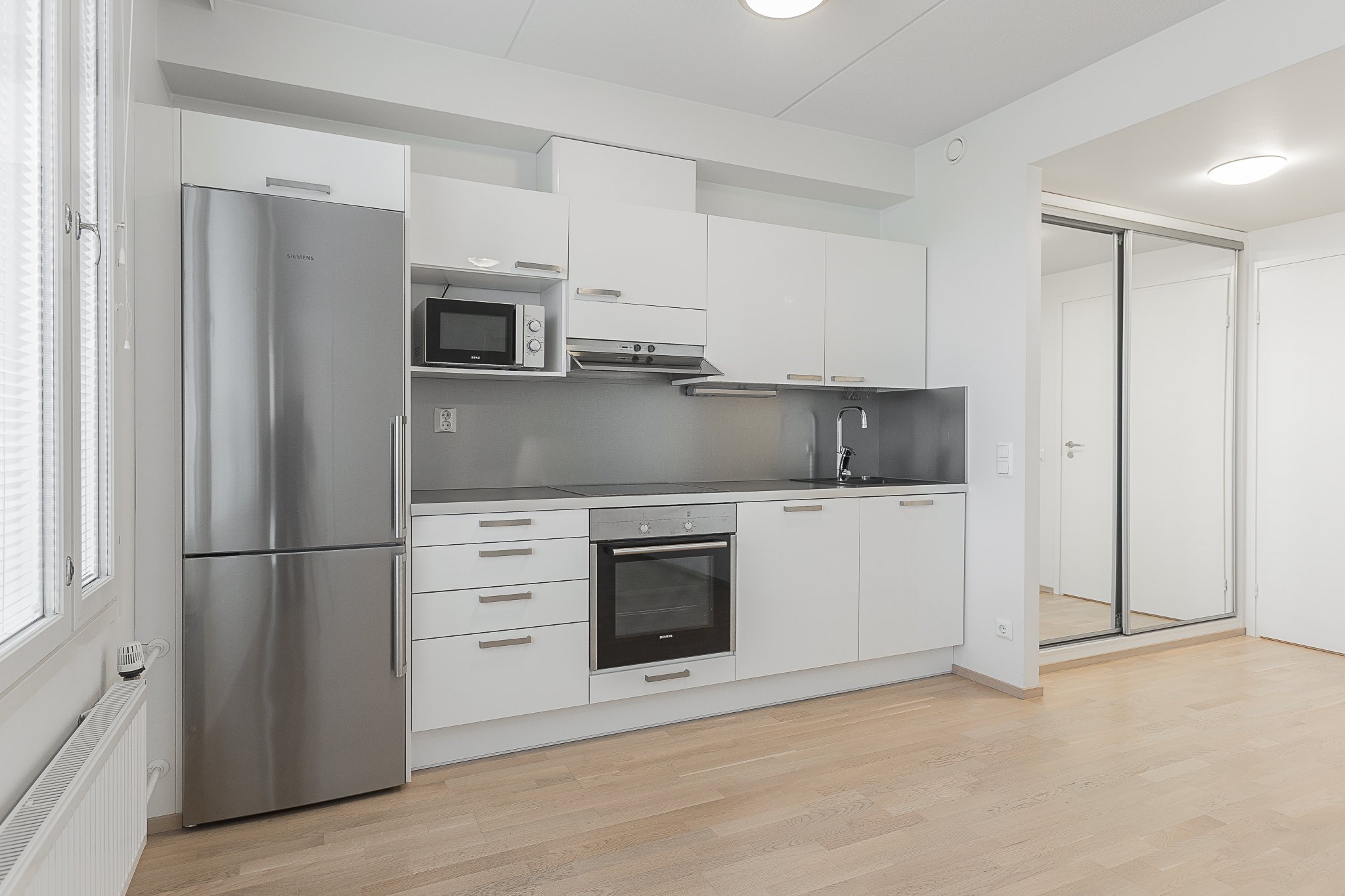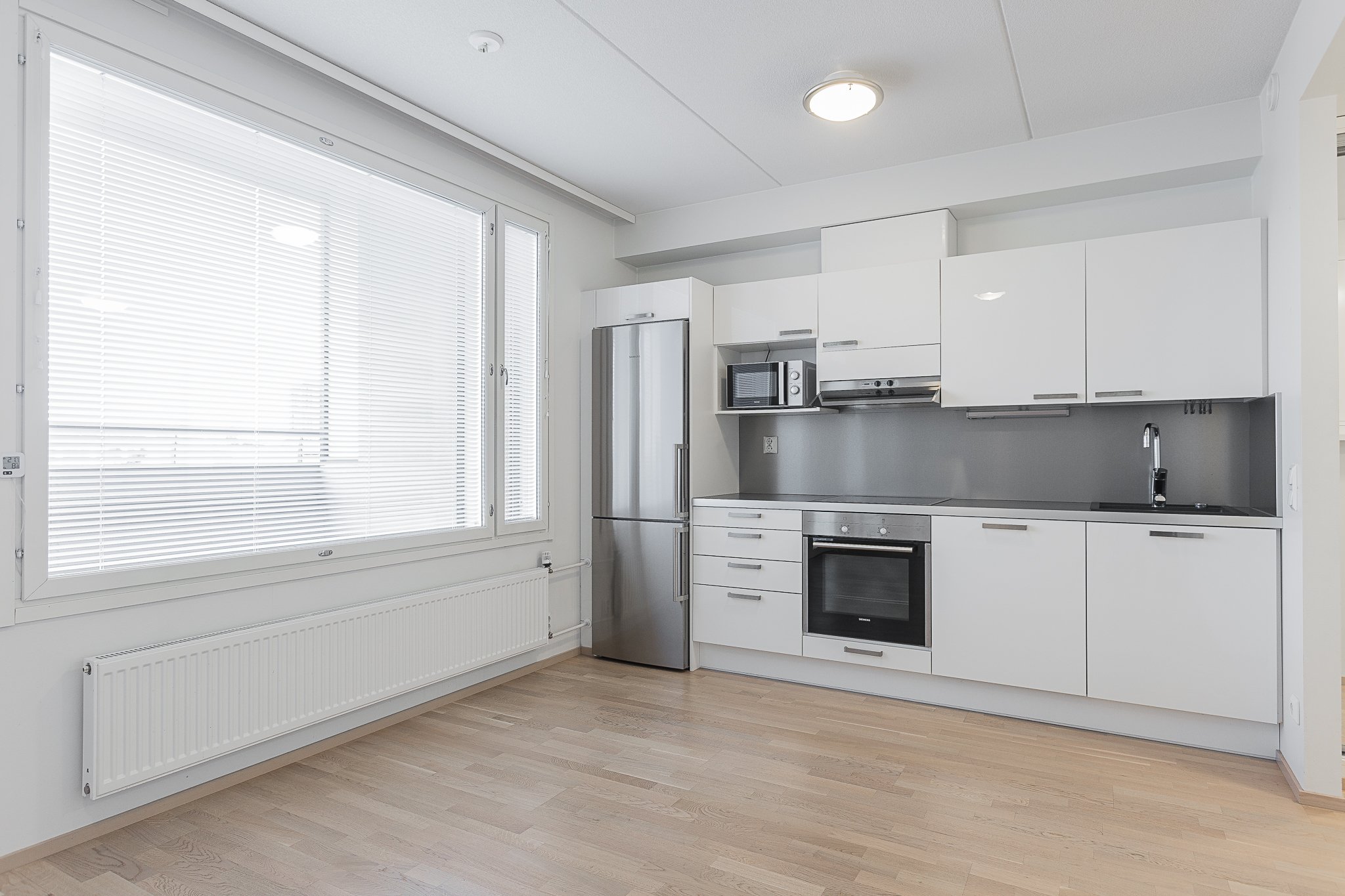 Kaapistot, tasot, integroitu jääkaappi/pakastin, keraaminen liesitaso, erillisuuni, liesituuletin, integroitu astianpesukone. Välitila: Levy.