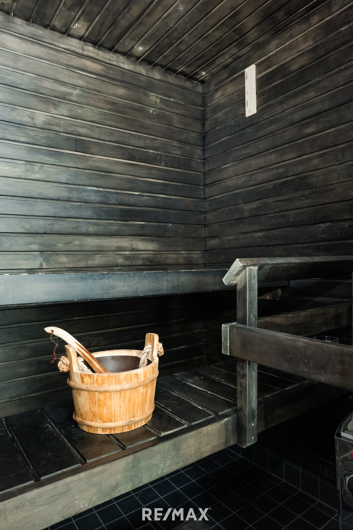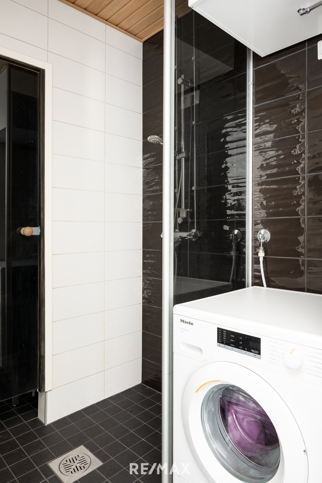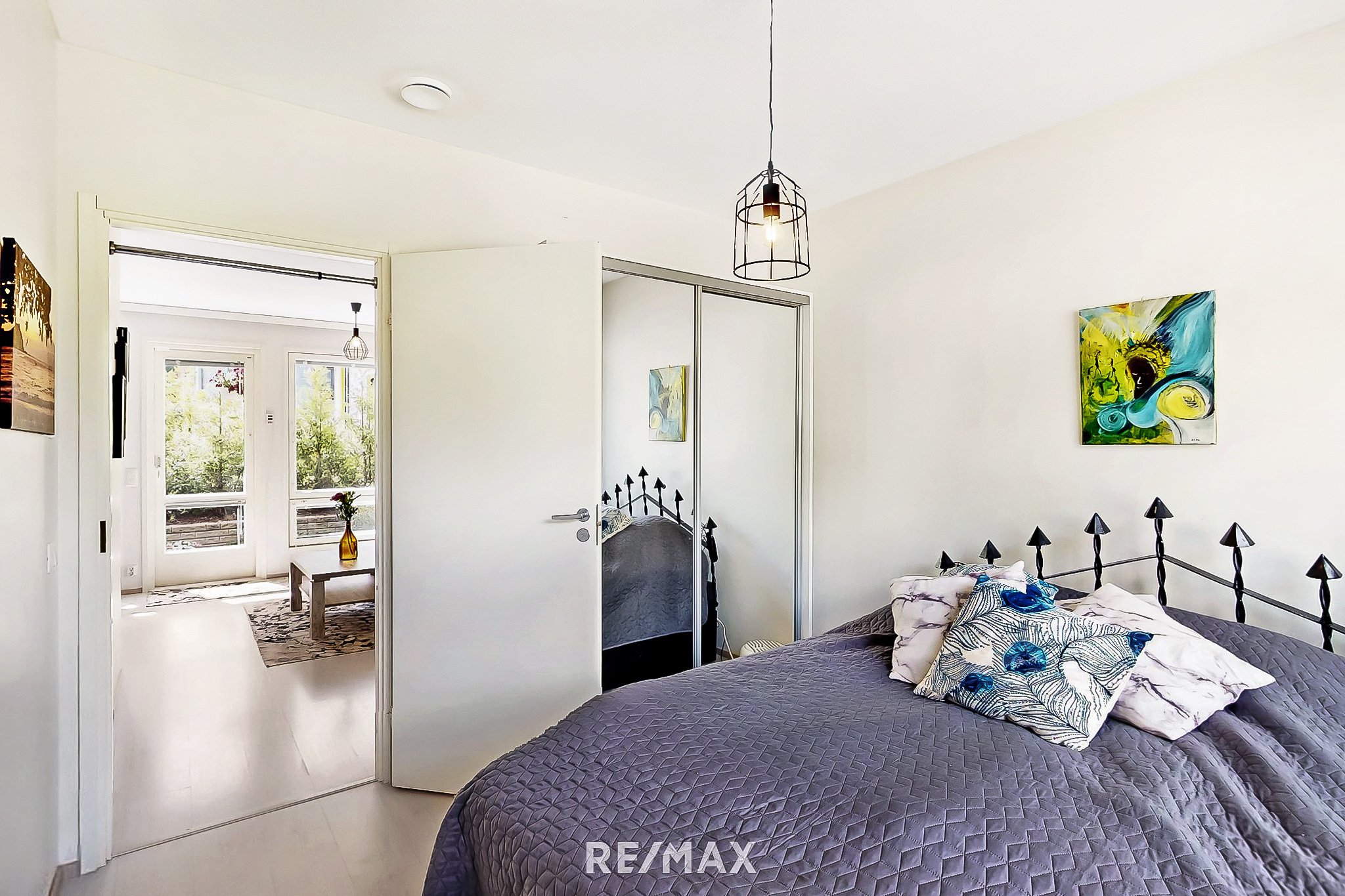 Asunnossa on tilava makuuhuone, jossa on hyvin tilaa niin levolliselle unelle kuin säilytykselle. Olohuone on avara ja valoisa, ja se yhdistyy saumattomasti hyvin varusteltuun avokeittiöön, jossa on runsaasti kaappitilaa ja modernit kodinkoneet. Kodin kylpyhuone on tyylikäs ja käytännöllinen, ja oma sauna tuo arkeen ripauksen luksusta. Eteisessä on tilaa ulkovaatteille, ja kokonaisuus on selkeä ja viihtyisä.