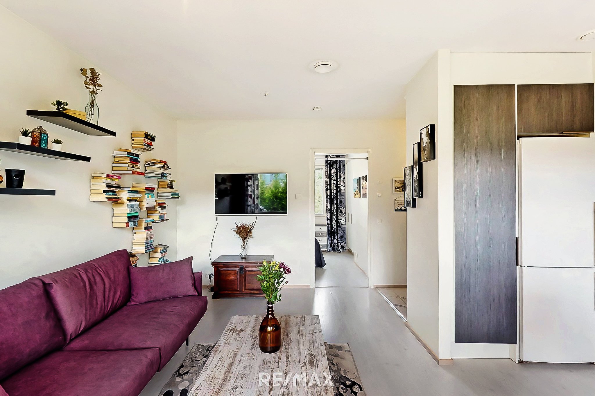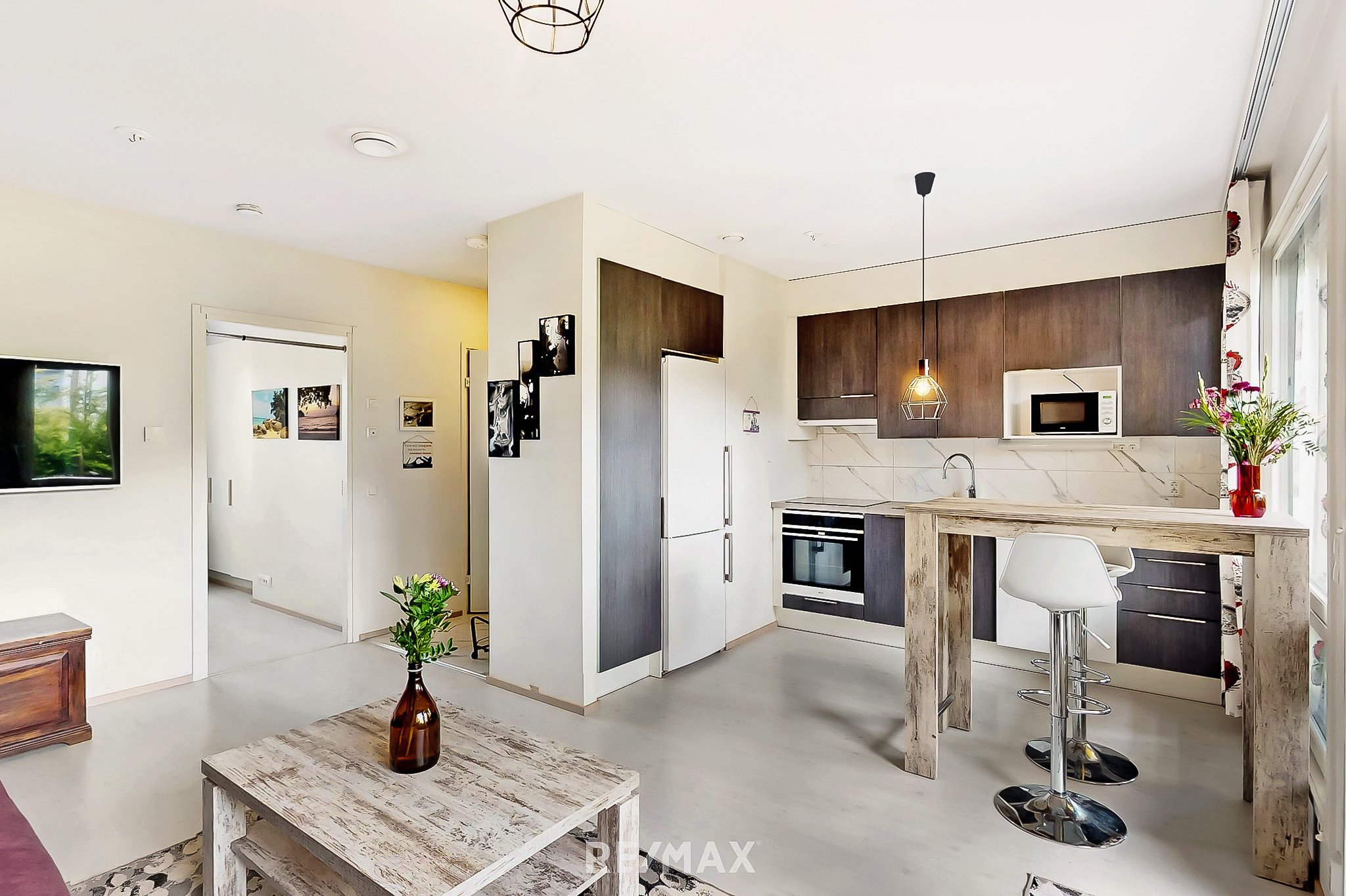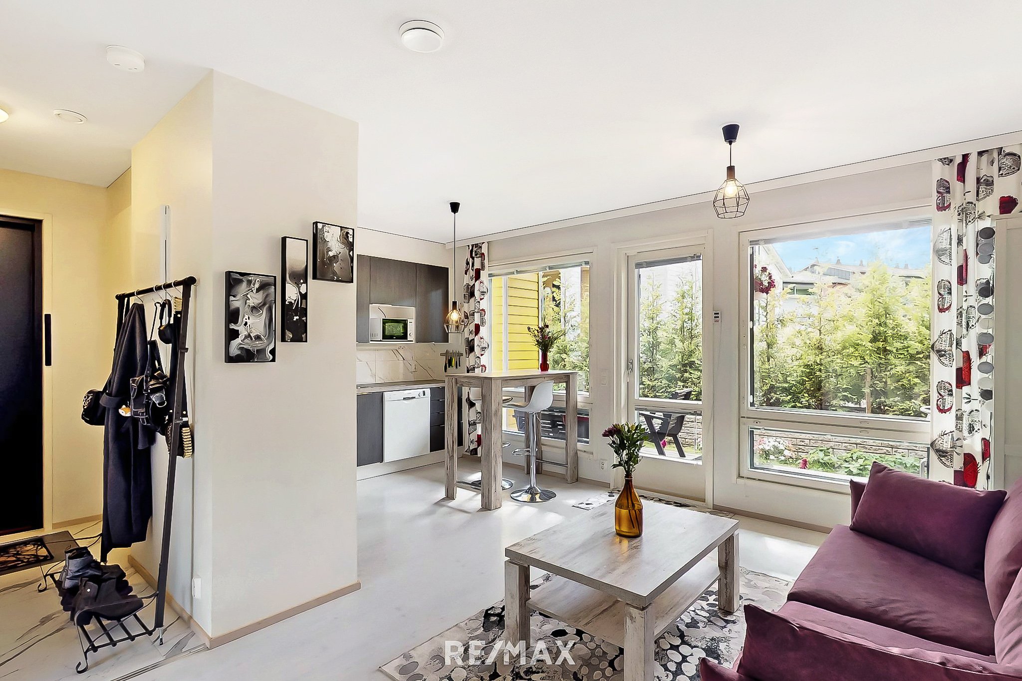 Asunnossa on tilava makuuhuone, jossa on hyvin tilaa niin levolliselle unelle kuin säilytykselle. Olohuone on avara ja valoisa, ja se yhdistyy saumattomasti hyvin varusteltuun avokeittiöön, jossa on runsaasti kaappitilaa ja modernit kodinkoneet. Kodin kylpyhuone on tyylikäs ja käytännöllinen, ja oma sauna tuo arkeen ripauksen luksusta. Eteisessä on tilaa ulkovaatteille, ja kokonaisuus on selkeä ja viihtyisä.