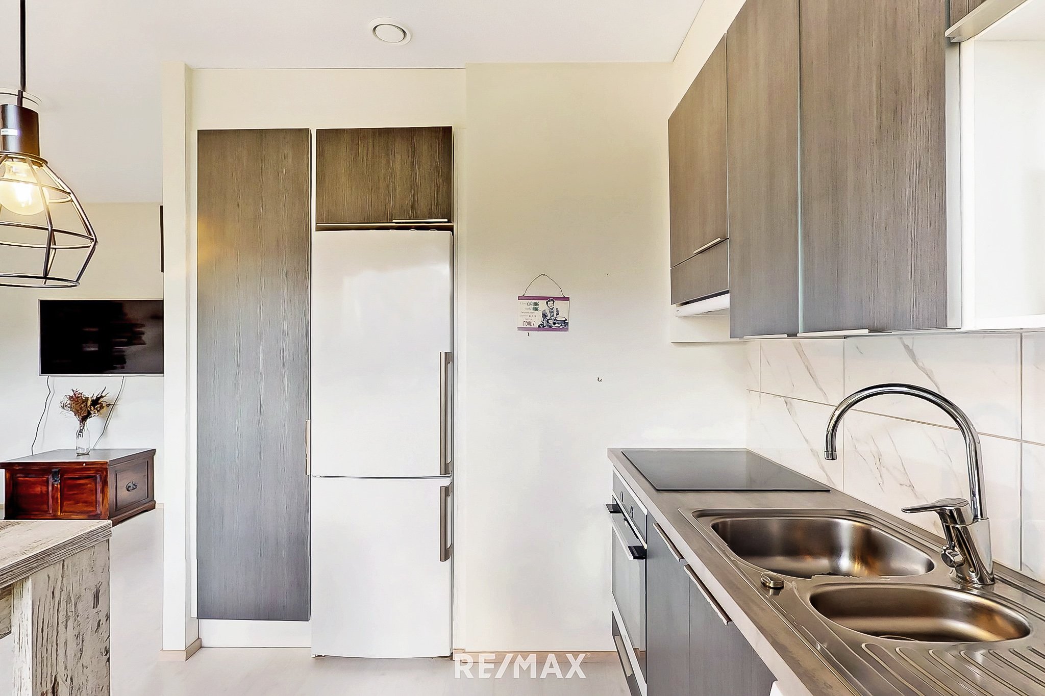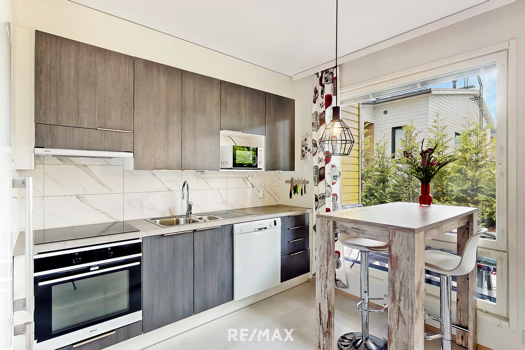 Tyylikäs avokeittiö, jonka varustuksiin kuuluu kalusteuuni, keittotaso, liesituuletin ja jääkaappipakastin sekä astianpesukone. Keittiön tasot ja lattia ovat laminaattia. Välitila on laatoitettu ja seinät ovat maalatut.