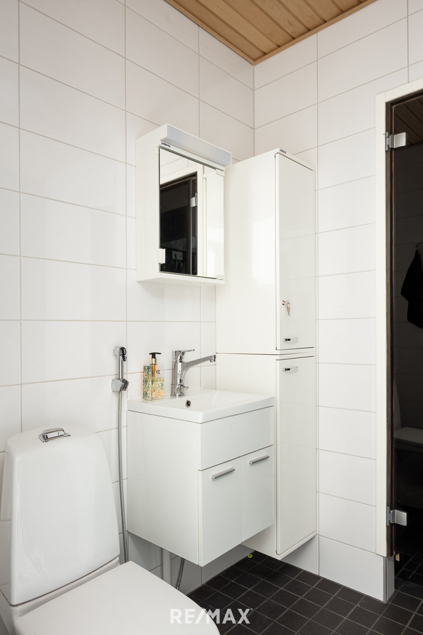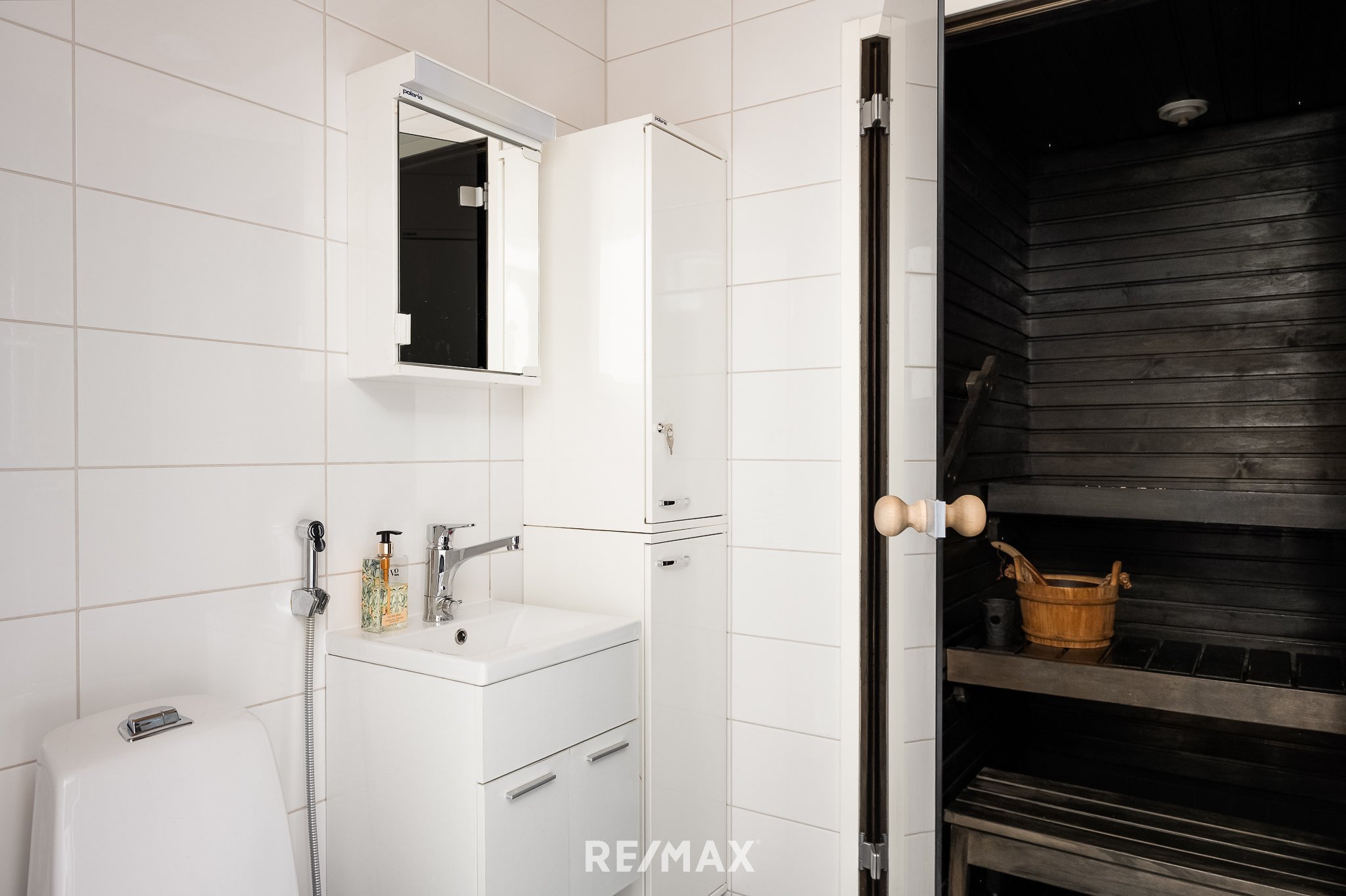 Laatoitetun kylpyhuoneen varustuksiin kuuluu wc-istuin, suihku, suihkuseinä, lavuaari, peili- ja allaskaappi, käsisuihku ja pk-liitäntä. Kylpyhuoneesta käynti huoneiston saunaan.