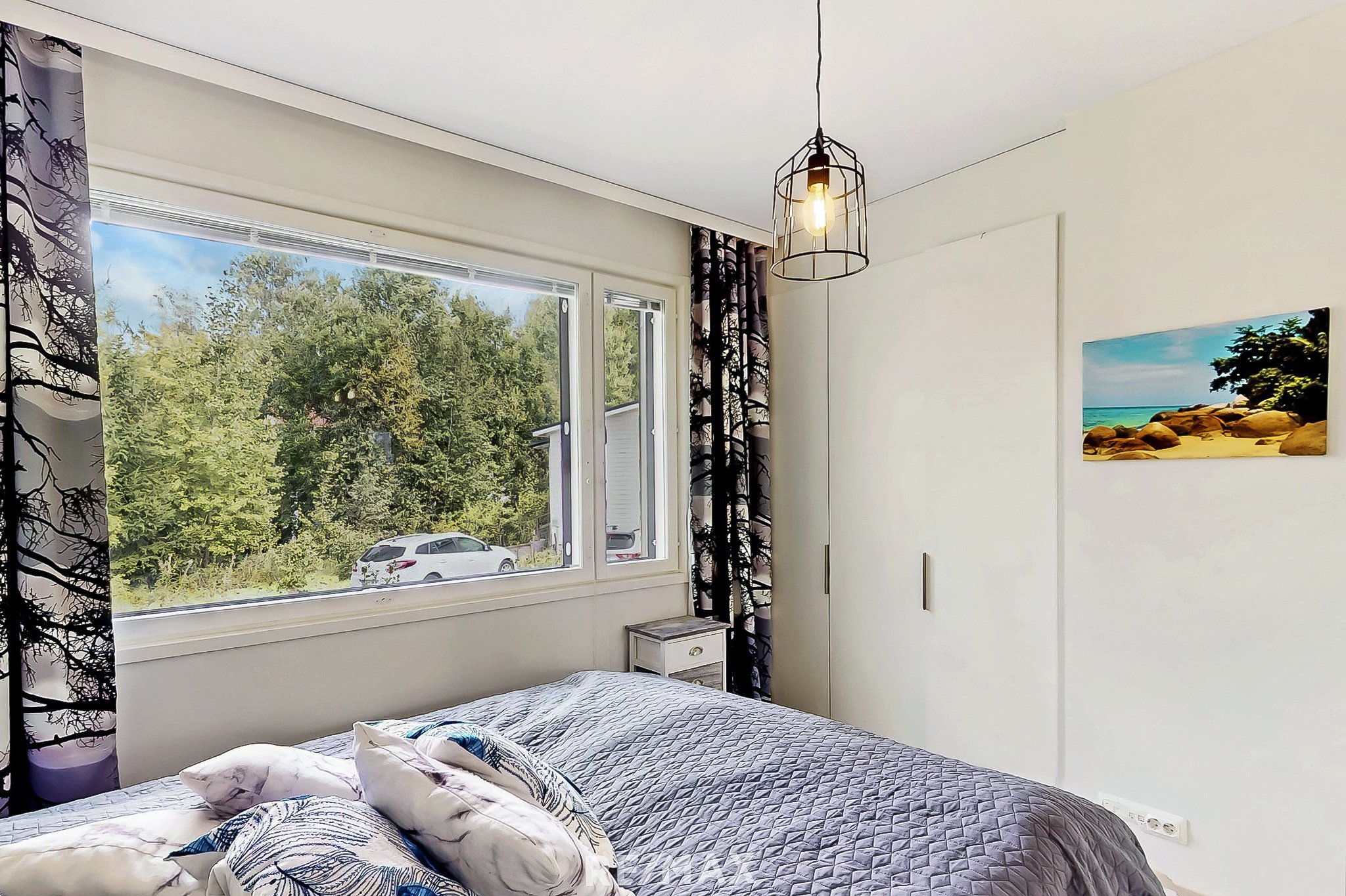 Valoisassa makuuhuoneessa on maalatut seinät ja laminaattilattia. Makuuhuoneen kaapisto ei kuulu kauppaan.