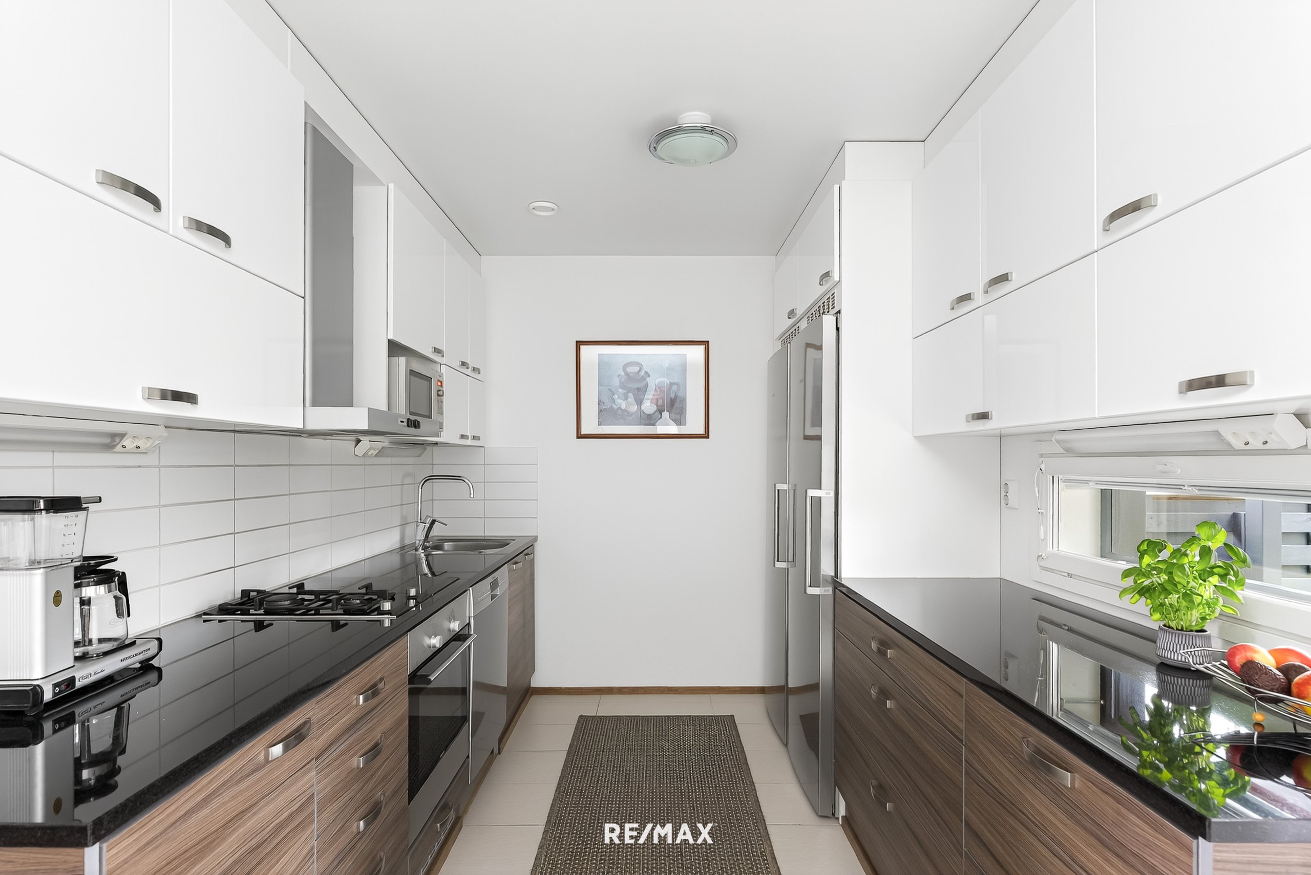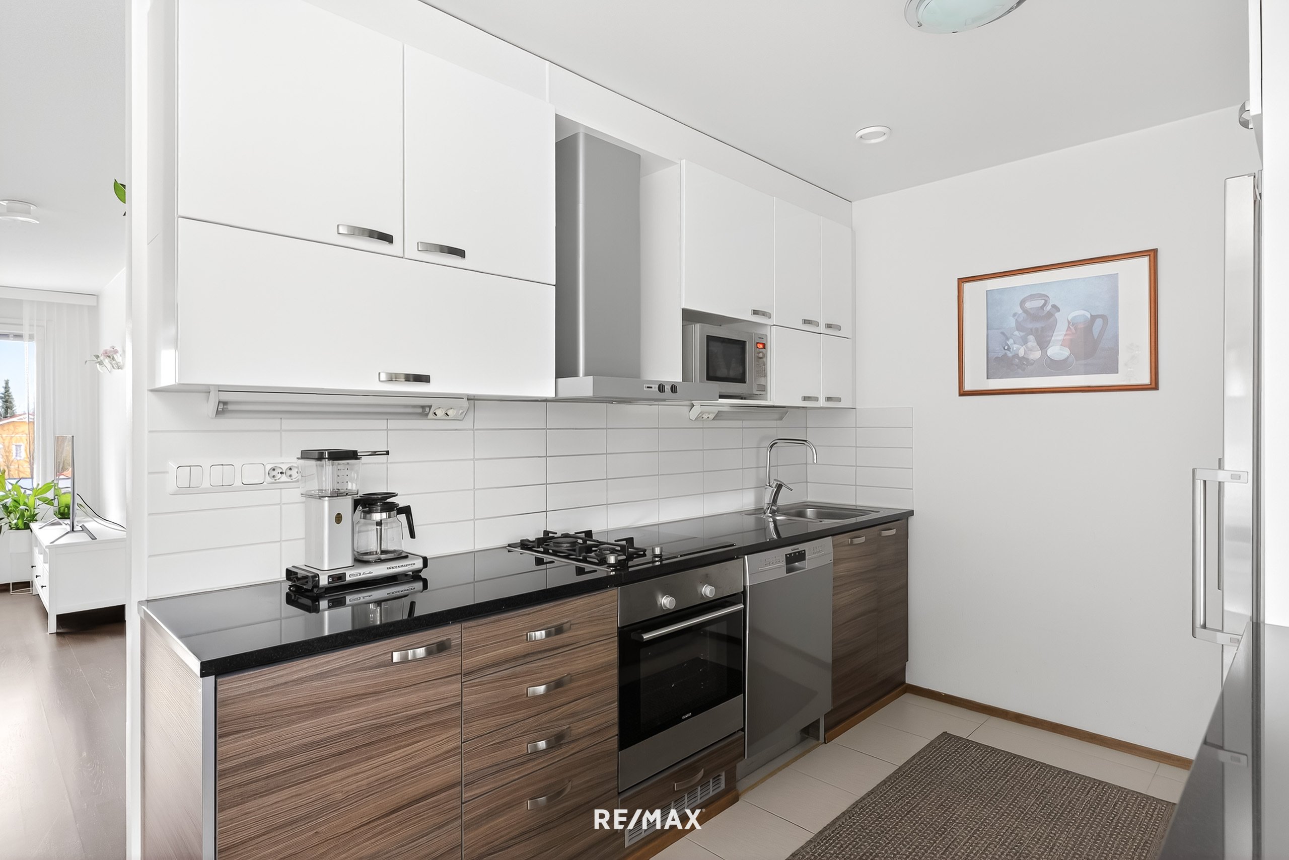 Olohuone, keittiö ja ruokailutila muodostavat yhtenäisen ja avaran tilan. Olohuoneesta on kulku pariovien kautta makuuhuoneeseen, joka soveltuu myös kirjastoksi tai työhuoneeksi. Keittiössä on laadukkaat Siemensin kodinkoneet, tyylikkäät kivitasot sekä induktiolieden lisäksi myös kaasuliesi.