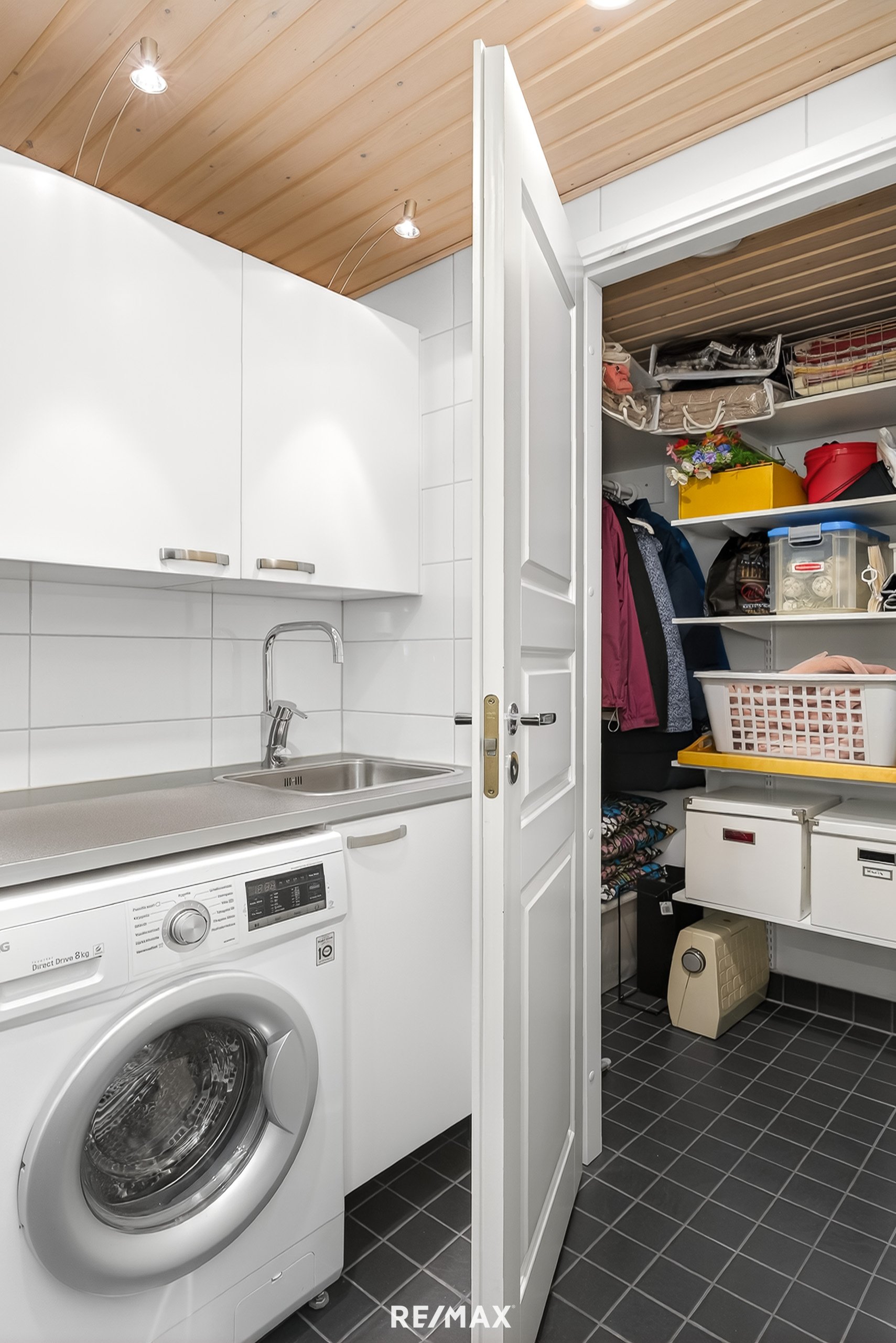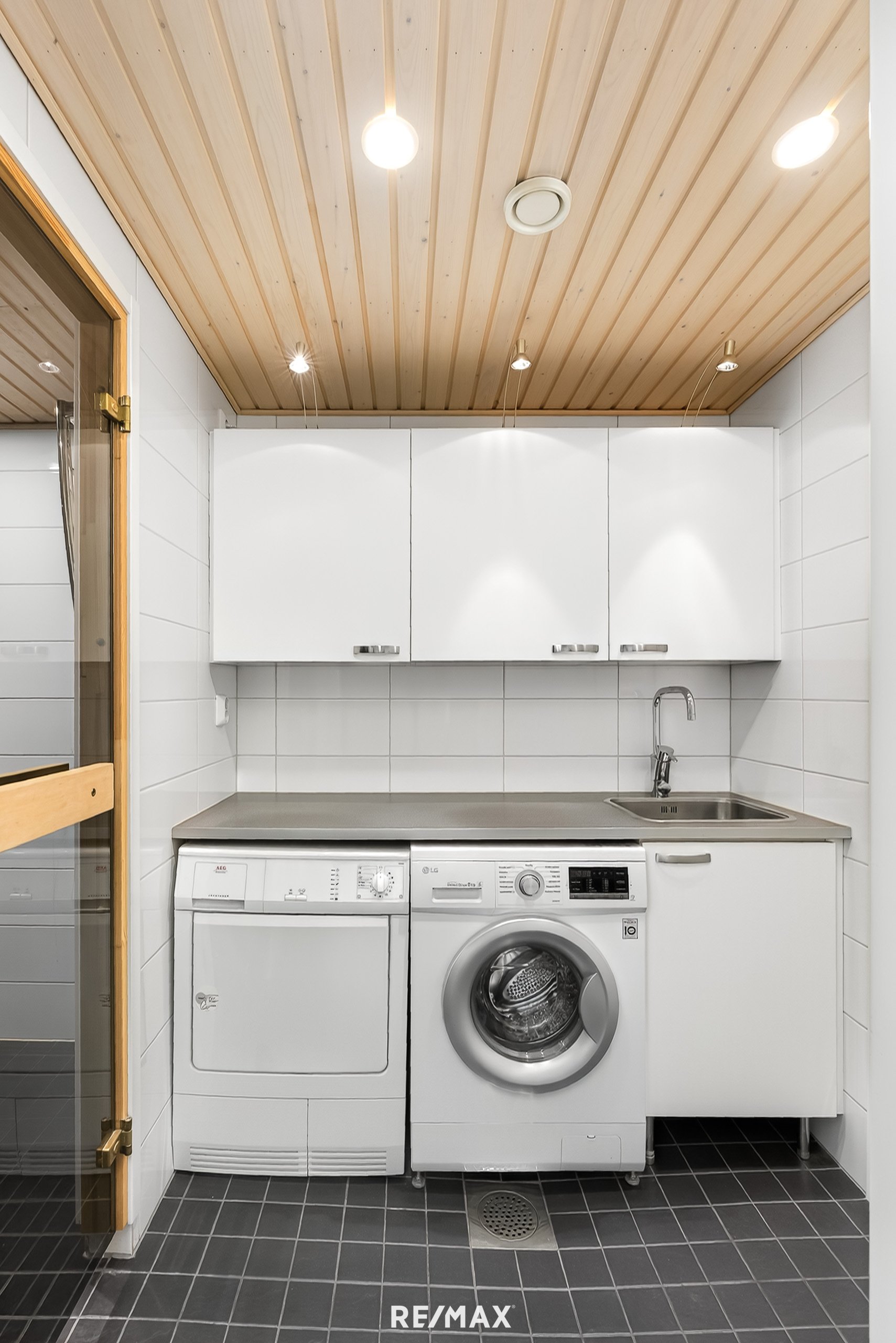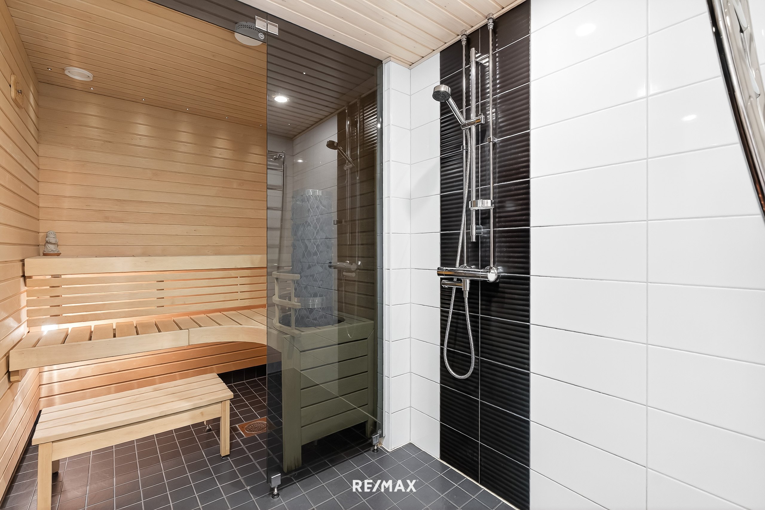 Kaksi kylpyhuonetta tuo kiireiseen arkeen helpotusta ja lisänä on vielä alakerran erillinen wc. Saunan lasiseinä antaa tilaan avaruutta. Erillinen kodinhoitohuone on todellista arjen luksusta. Tässä kodissa on hyvin säilytystilaa: kodinhoitohuoneessa on reilusti kaappeja ja sen jatkeena on vielä vaatehuone. Portaikon alatila on hyödynnetty ja eteisessä on liukuovikaapisto. Asunnon katetun autopaikan yhteydessä on myös kylmä ulkovarasto.