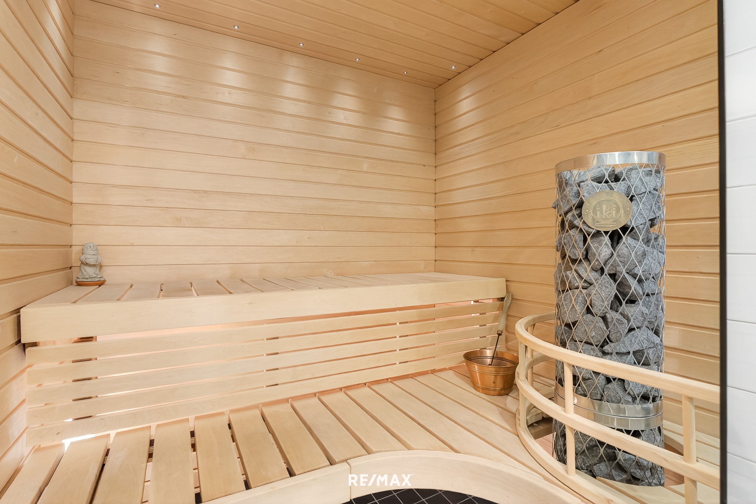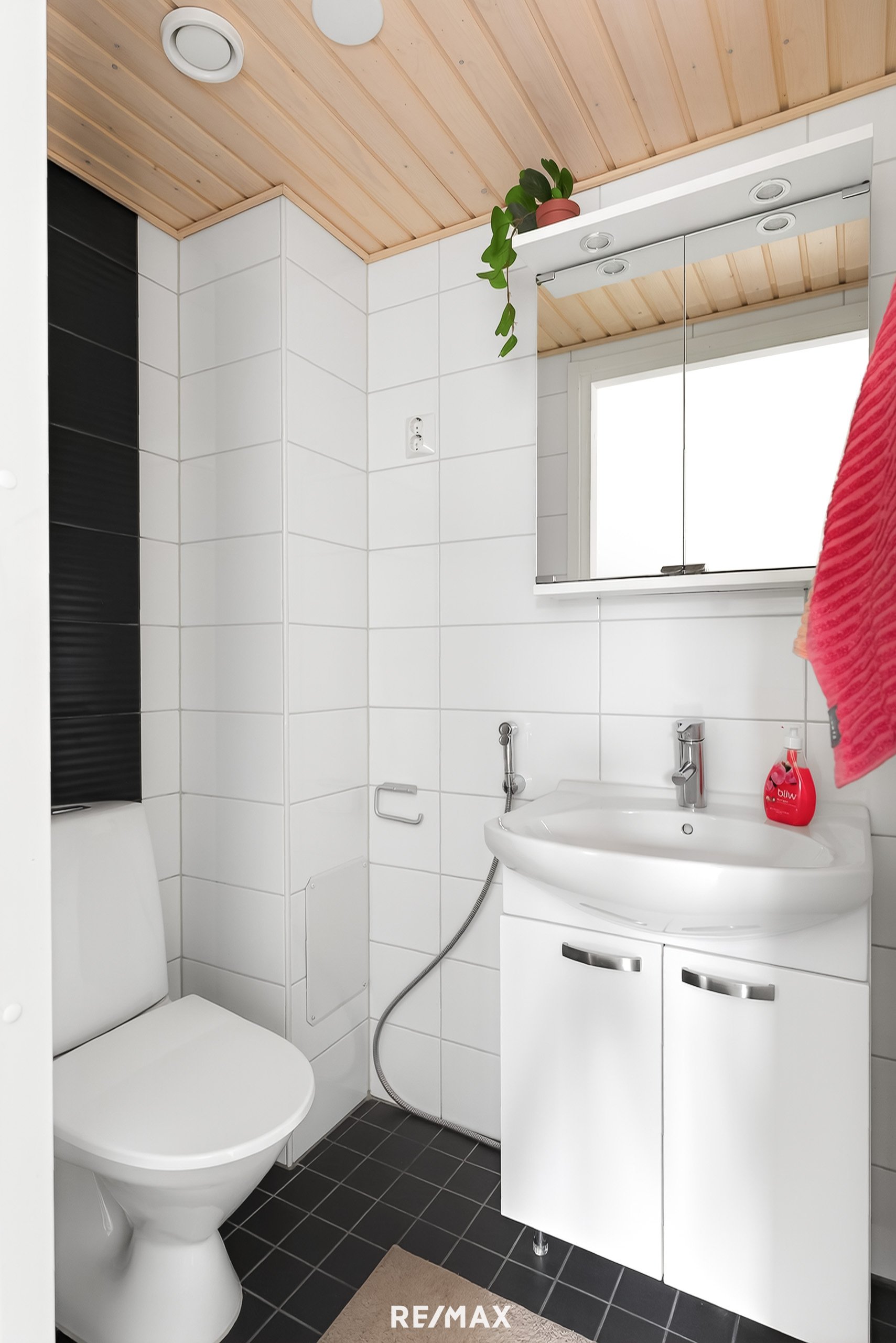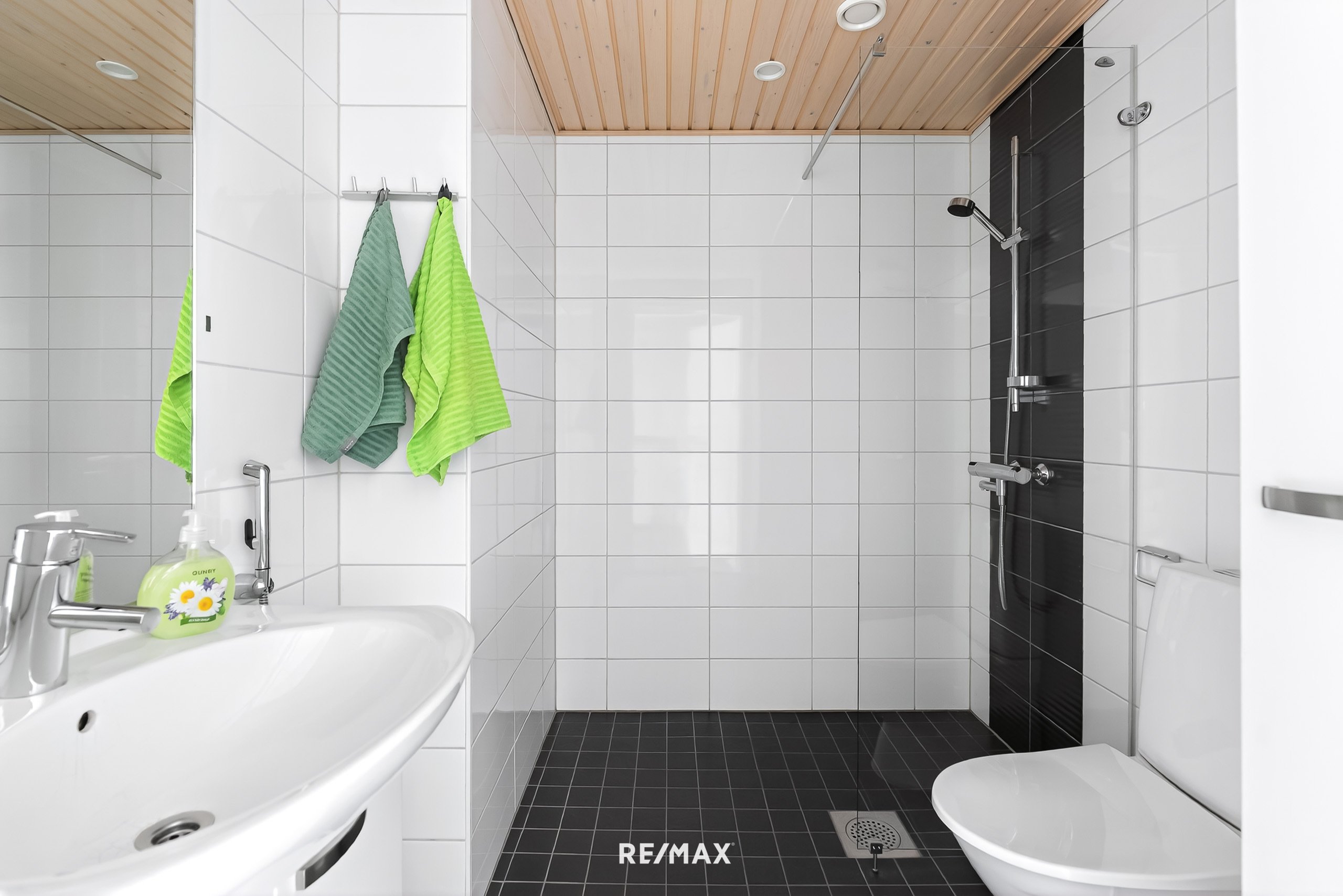 Kaksi kylpyhuonetta tuo kiireiseen arkeen helpotusta ja lisänä on vielä alakerran erillinen wc. Saunan lasiseinä antaa tilaan avaruutta. Erillinen kodinhoitohuone on todellista arjen luksusta. Tässä kodissa on hyvin säilytystilaa: kodinhoitohuoneessa on reilusti kaappeja ja sen jatkeena on vielä vaatehuone. Portaikon alatila on hyödynnetty ja eteisessä on liukuovikaapisto. Asunnon katetun autopaikan yhteydessä on myös kylmä ulkovarasto.