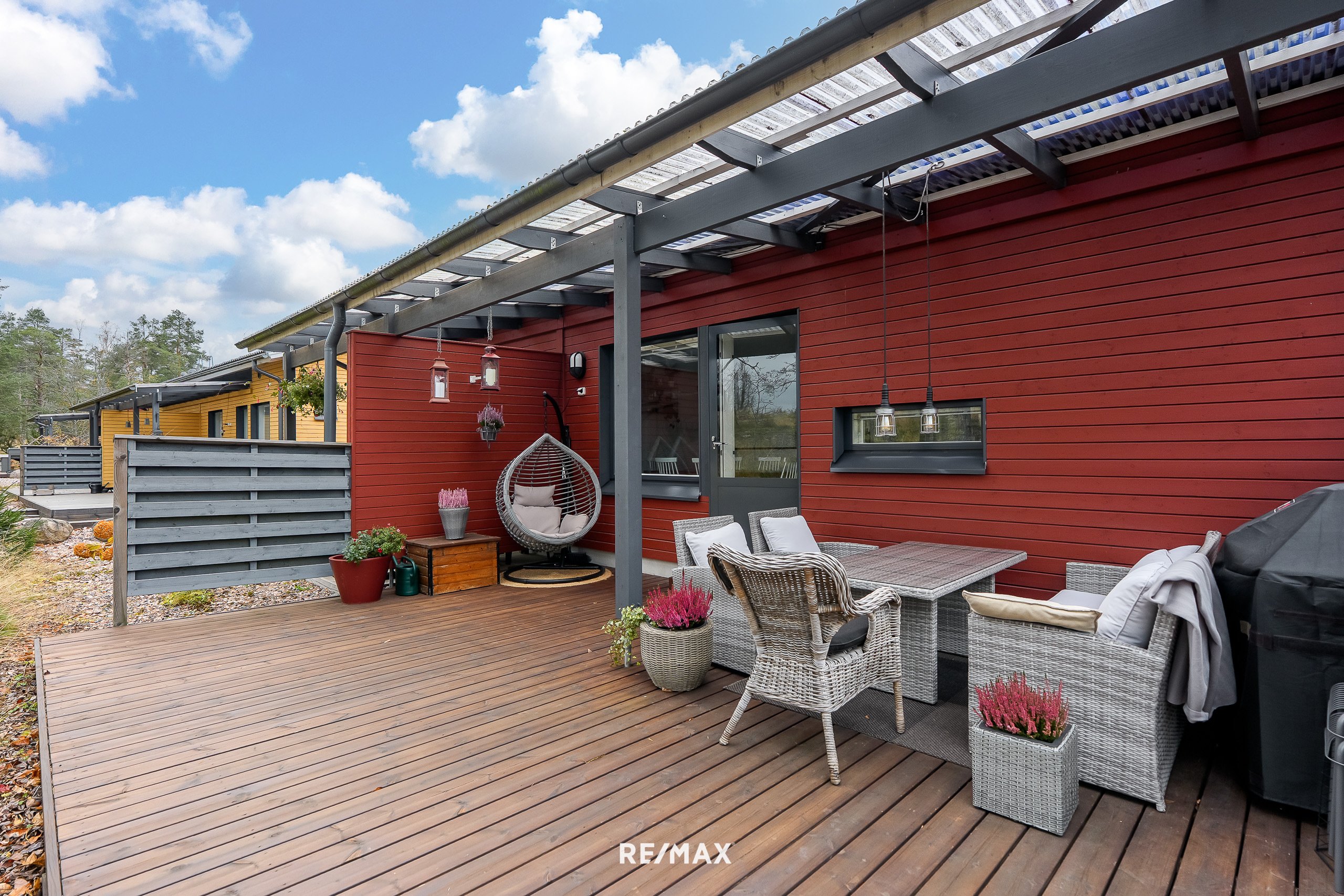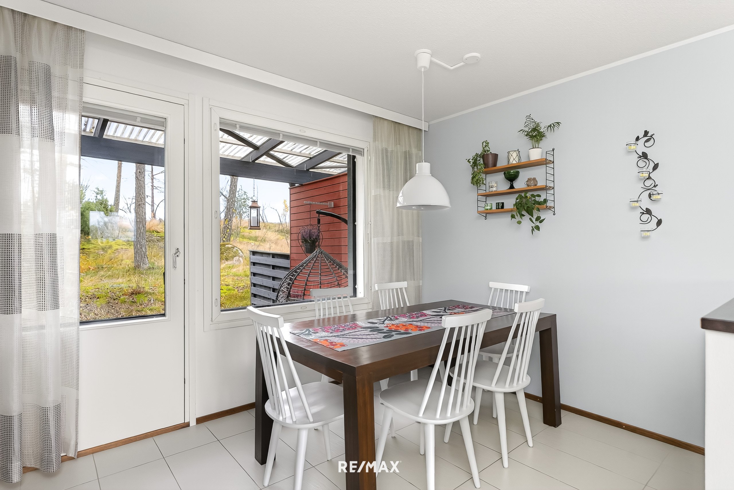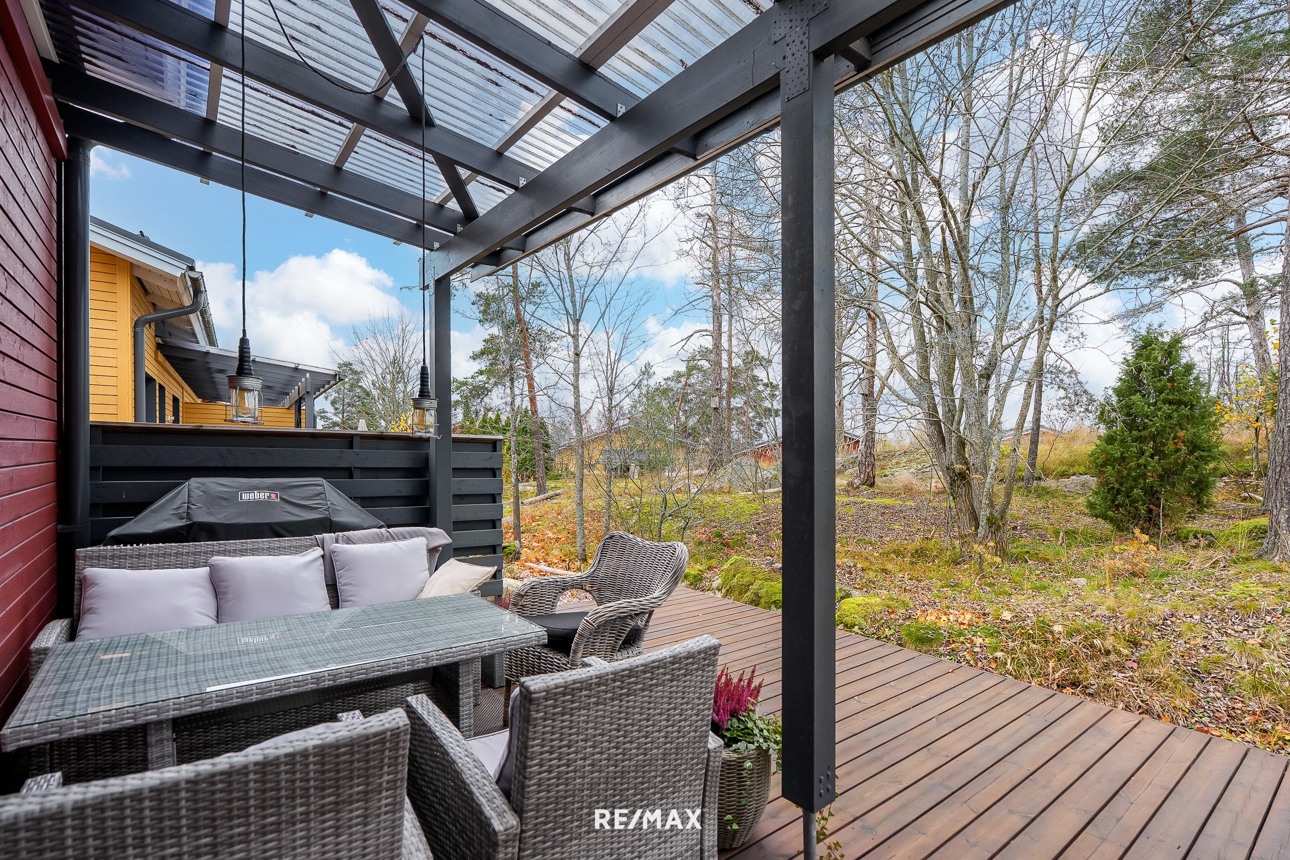 Kaiken kruunaa asunnon puolittain katettu iso terassi, jonne on kulku ruokailutilasta. Terassilta aukeaa rauhoittava metsämaisema ilta-auringon suuntaan.