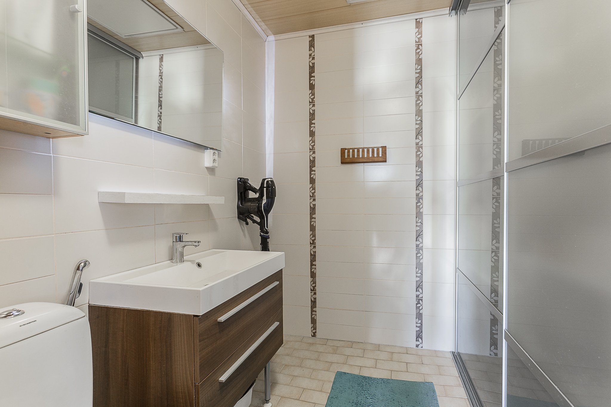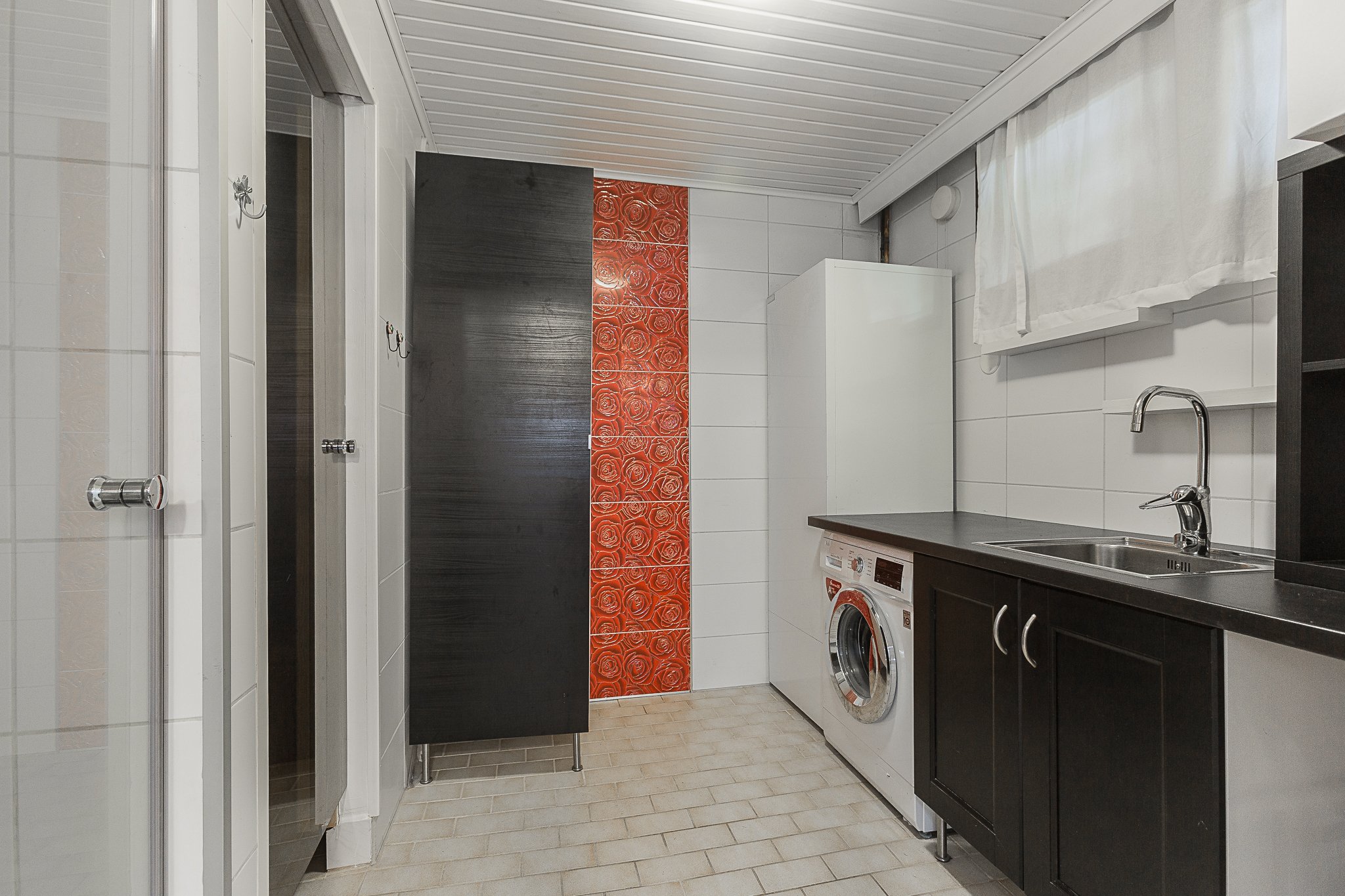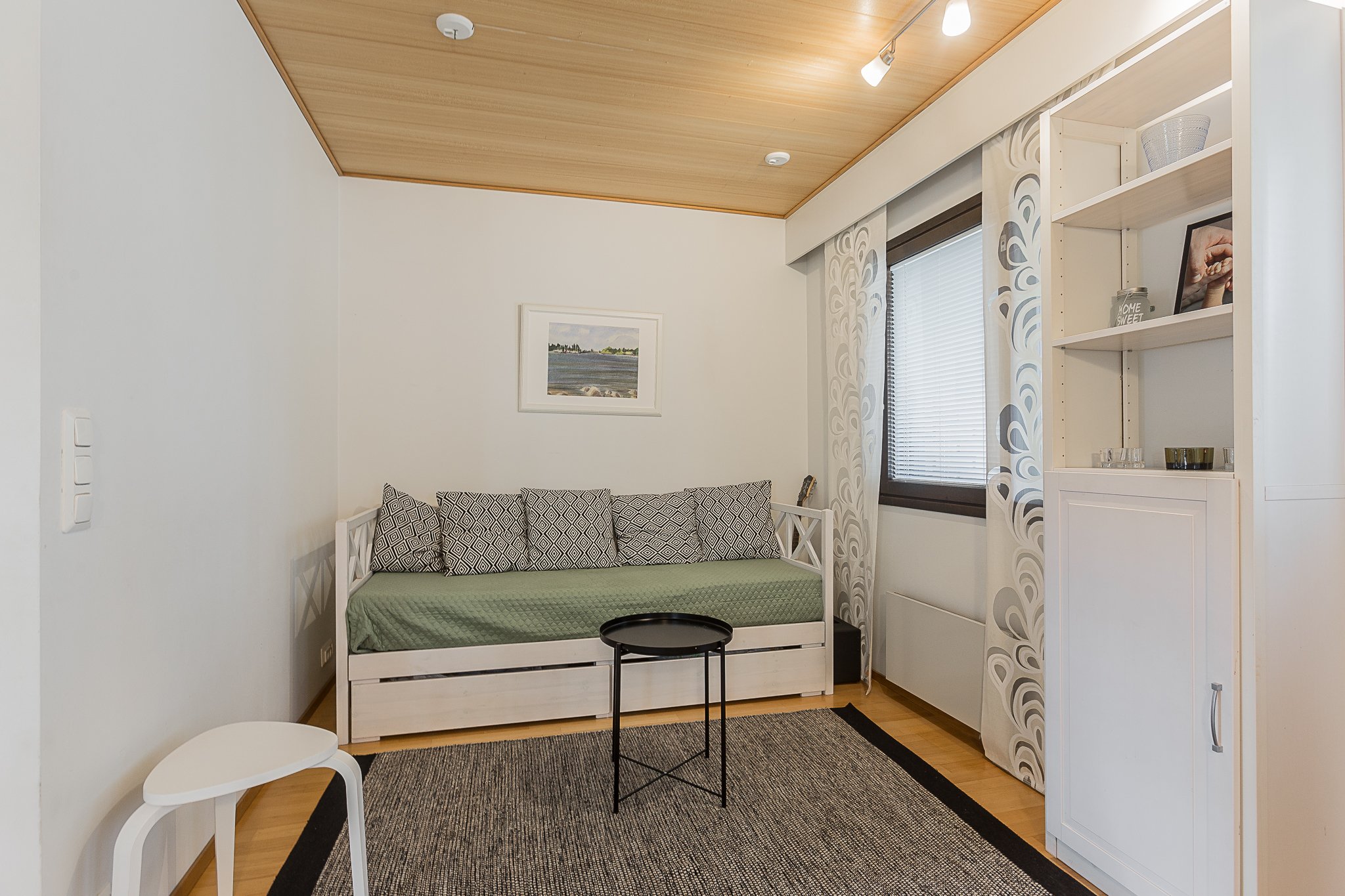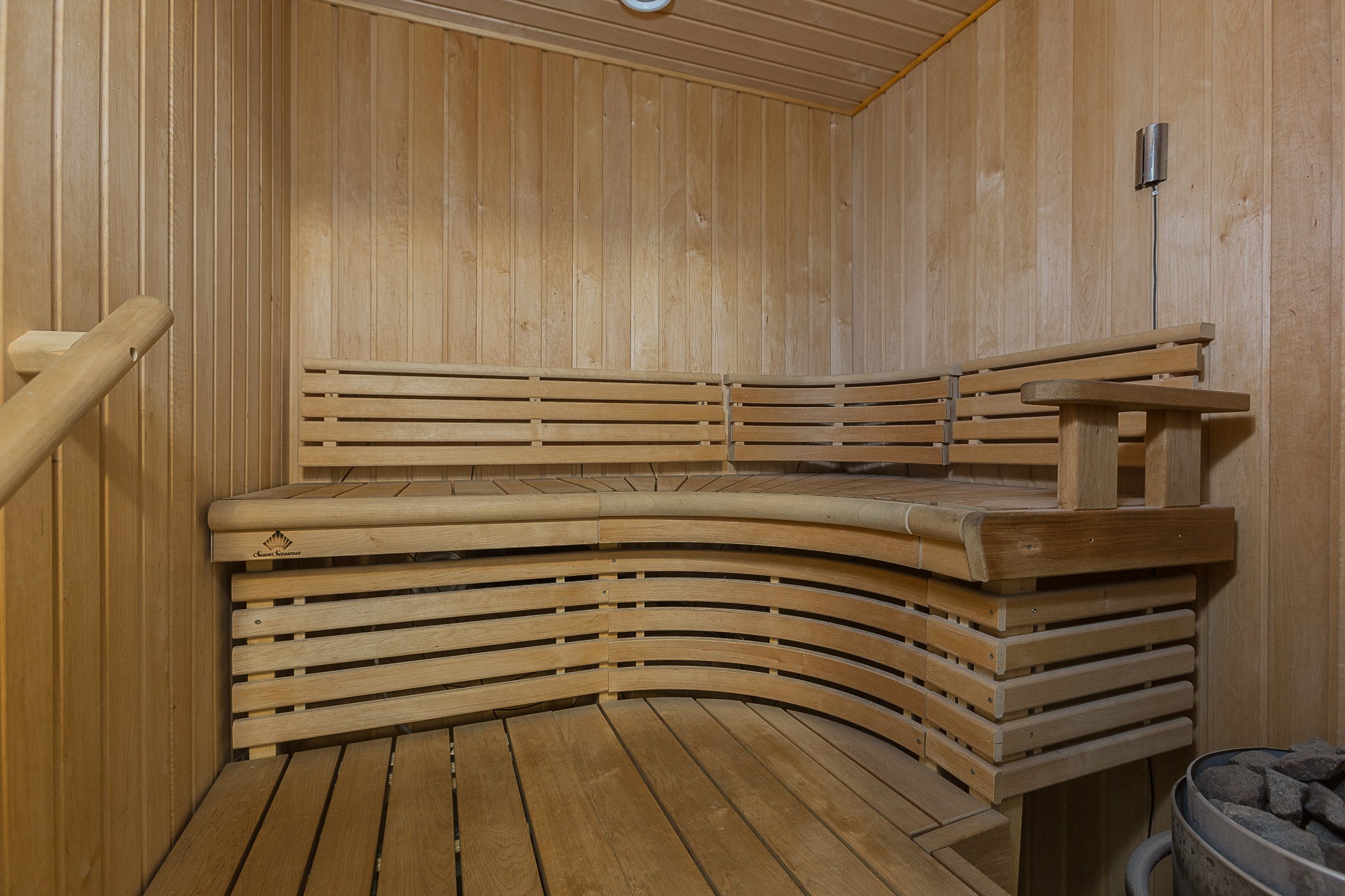 Alakerrasta löytyvät kaksi makuuhuonetta, erillinen wc, pesuhuone, kodinhoitotila sekä sauna, jonka Sun Saunan valmistamat muotolauteet viimeistelevät rentouttavat saunahetket.