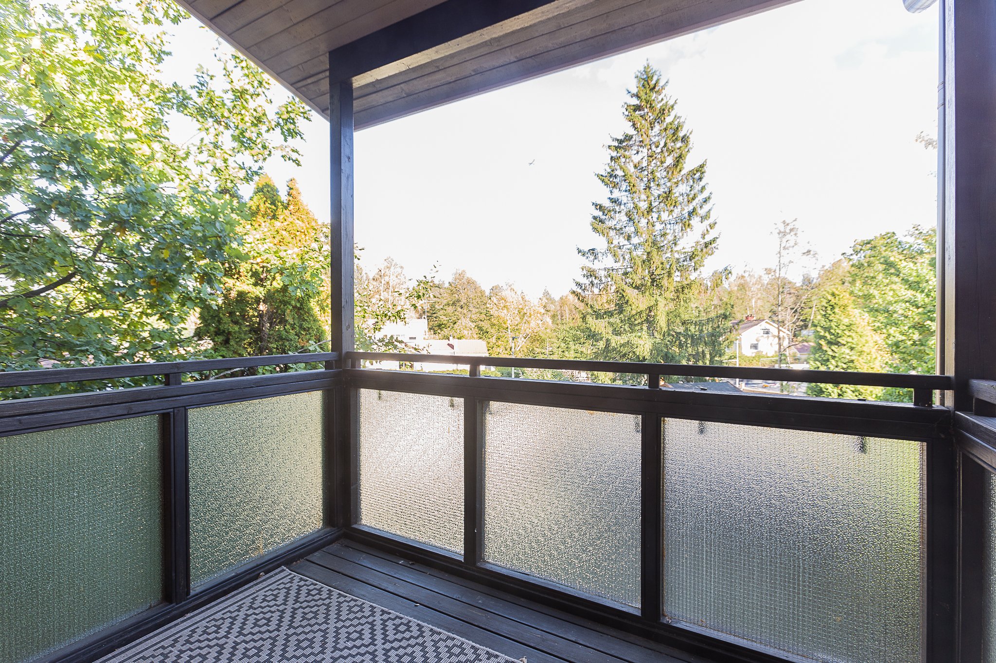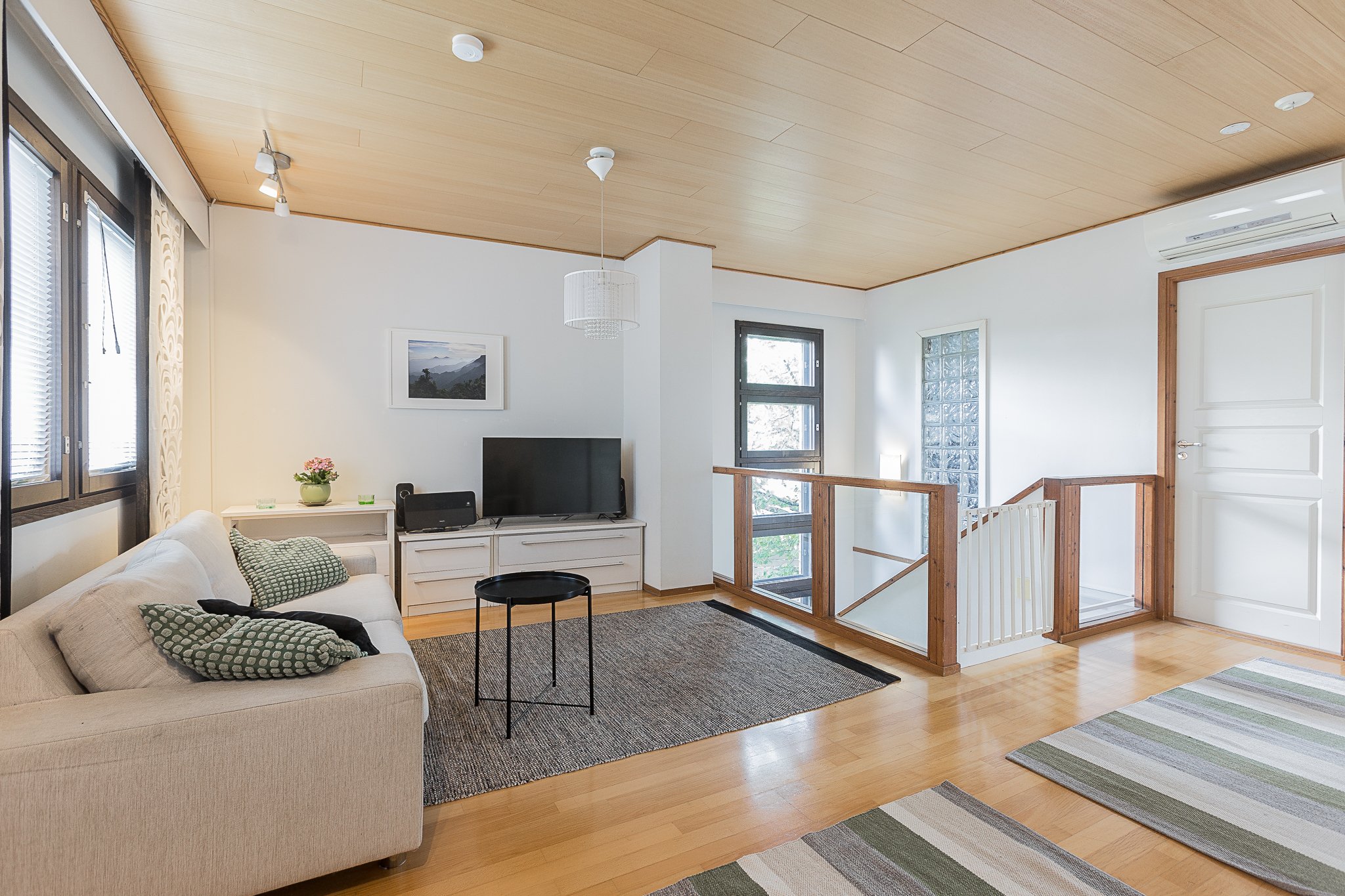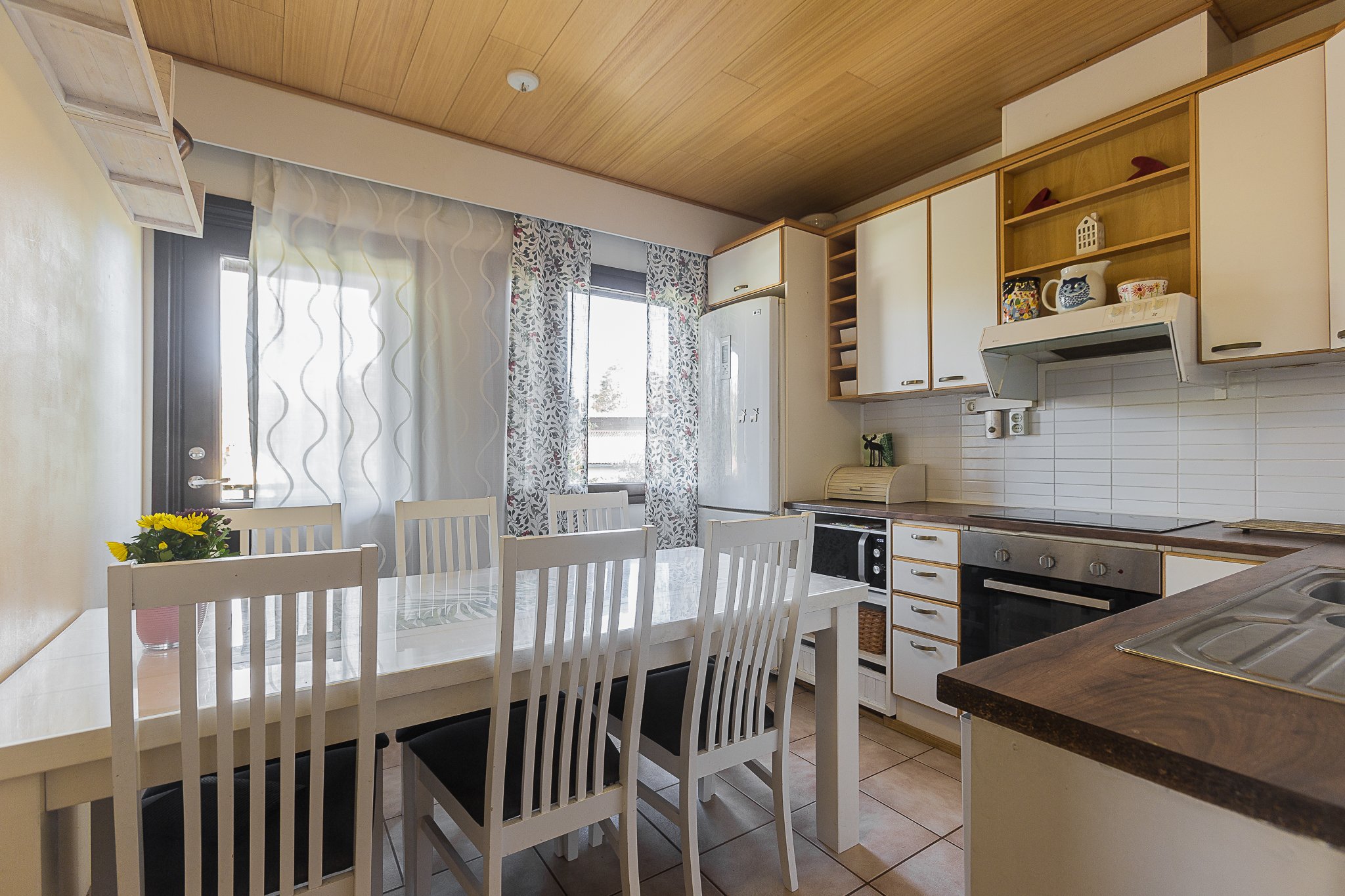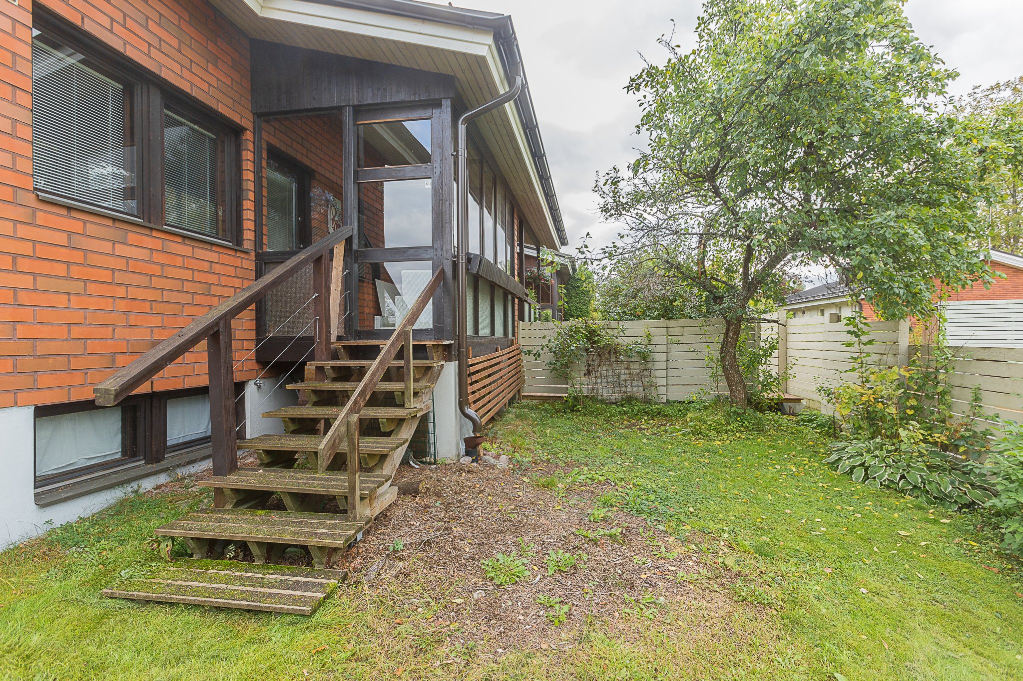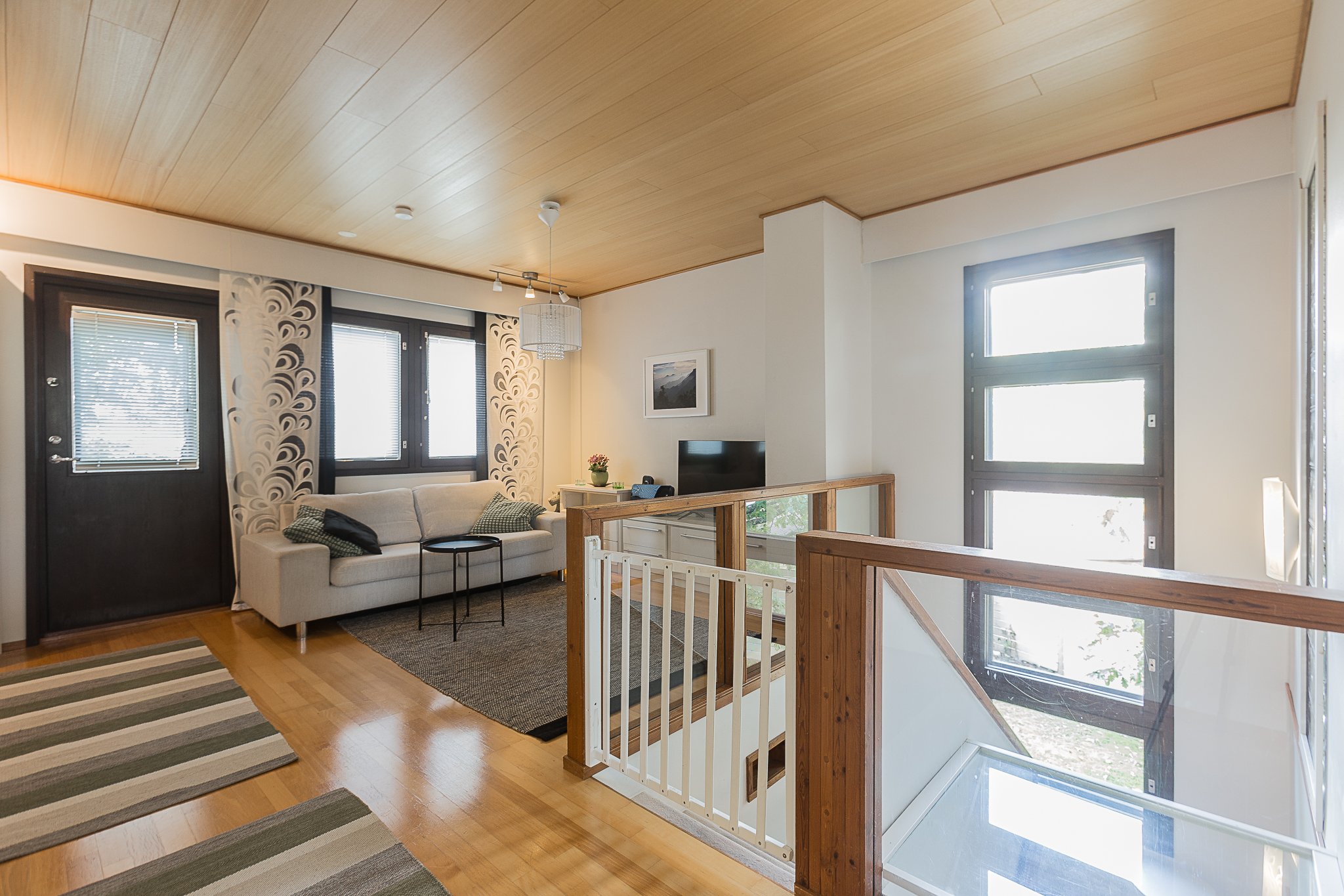 Yläkerran avara ja valoisa olohuone kutsuu viihtymään – sieltä on käynti aurinkoiselle, katetulle terassille ja suojaisalle, isolle pihalle, jossa viihtyy koko perhe. Keittiöön mahtuu hyvin ruokailuryhmä, ja yläkerrassa on myös erillinen wc, josta kulku käyttöullakolle, sekä yksi makuuhuoneista.