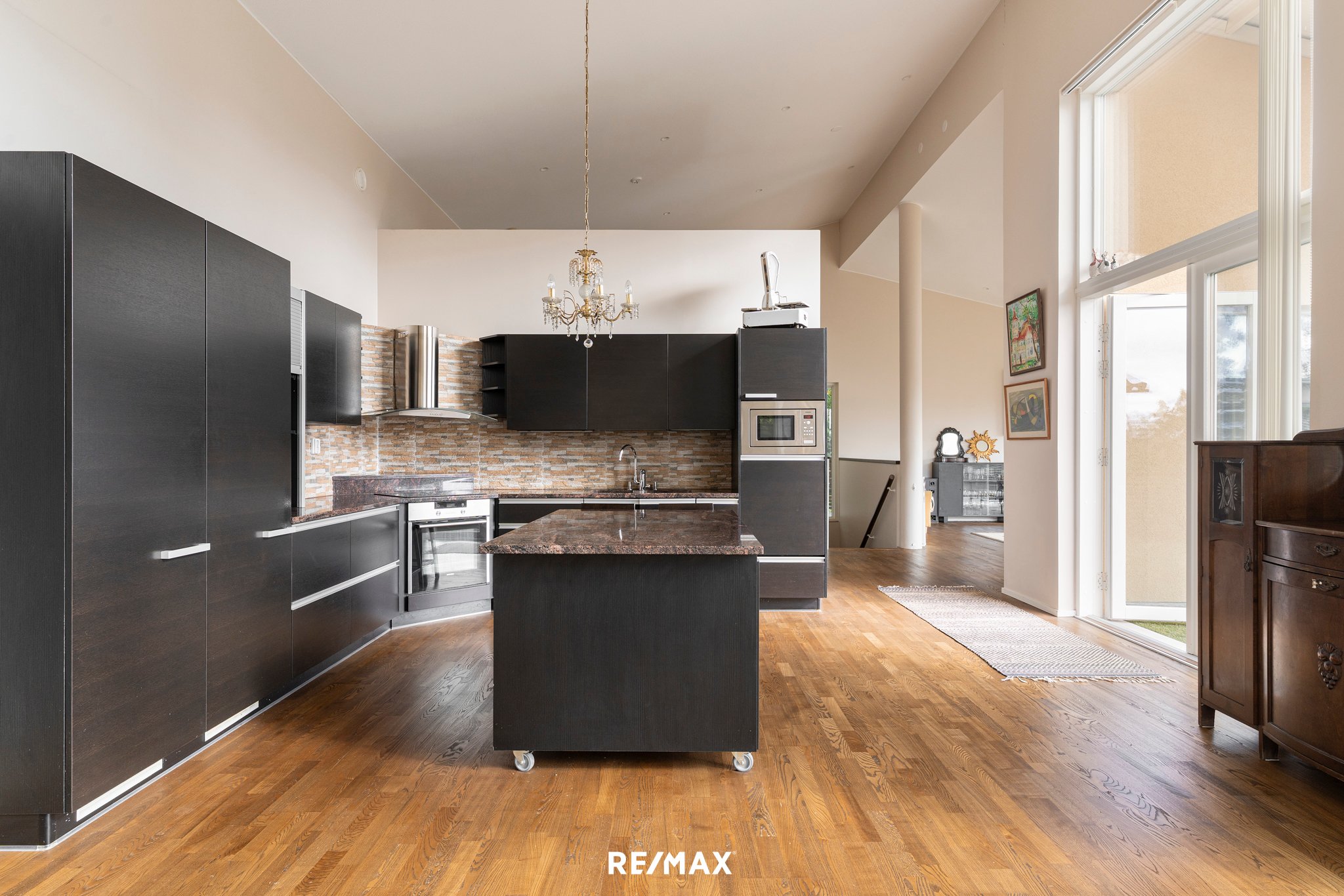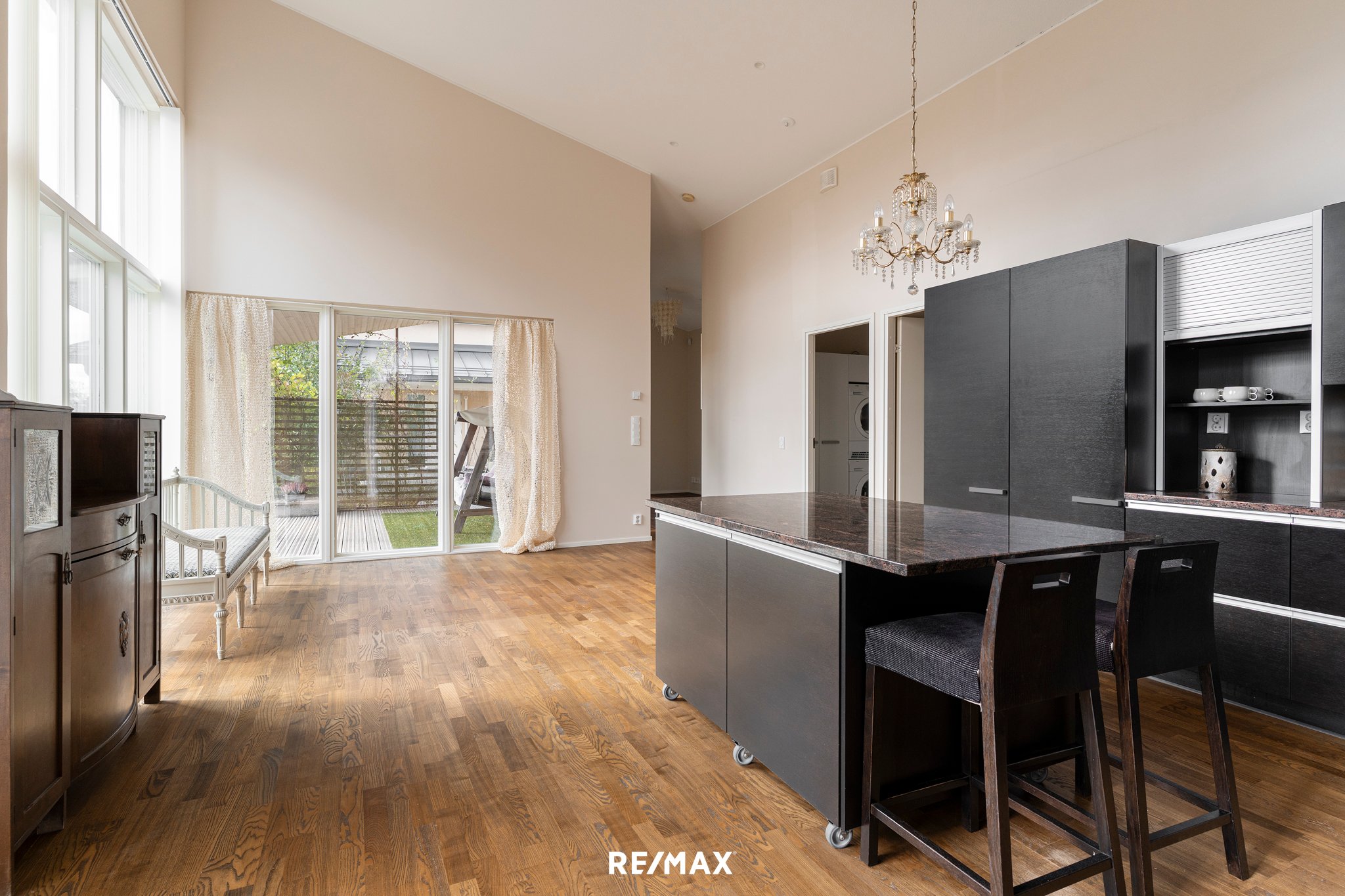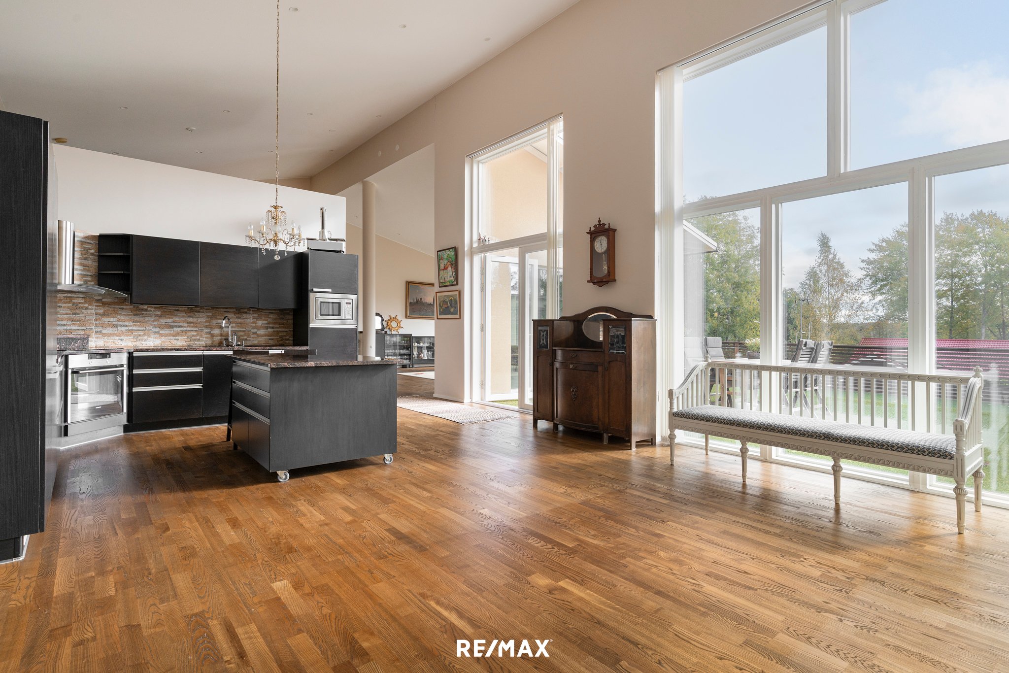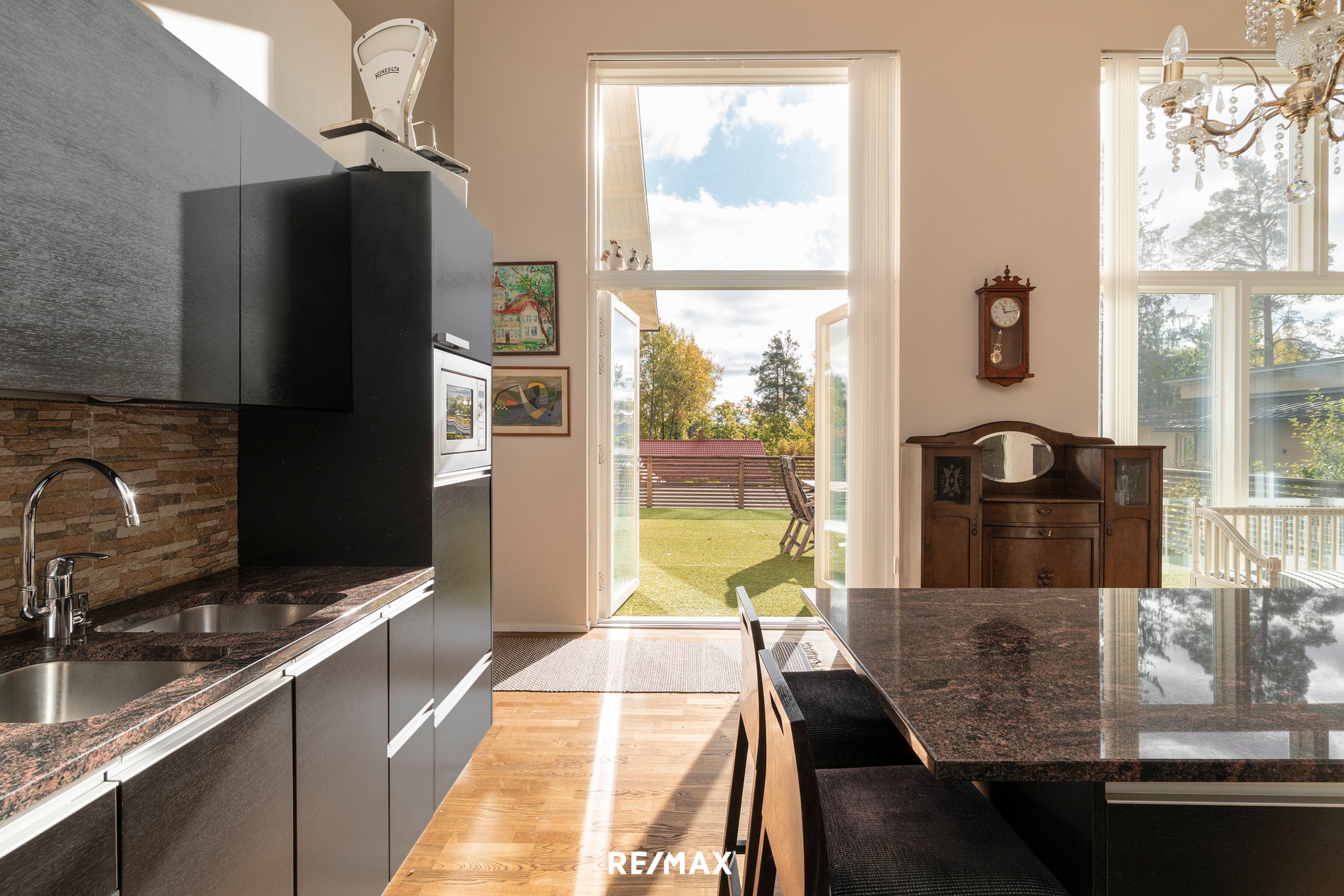 Talo sijaitsee kadun korkeimmalla kohdalla ja sieltä avautuvat avarat ja vehreät maisemat. Iso olohuone huokuu ylellisyyttä lattiasta asti alkavien ikkunoiden ja korkean katon ansiosta. Keittiö ja ruokailutila ovat olohuoneesta erikseen, mutta avautuvat vinosti olohuoneen puolelle. Tyylikkäässä keittiössä on Puustellin kaapistot ja kestävät kivitasot. Keittiön saareke on siirrettävä ja tilassa hoituu niin arjen ruokailut kuin suuremmatkin juhlat. Keittiöstä aukeavat pariovet terassille.