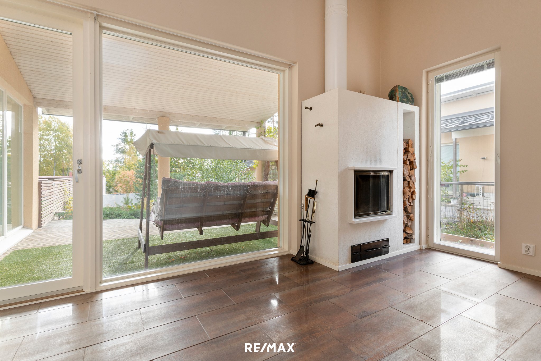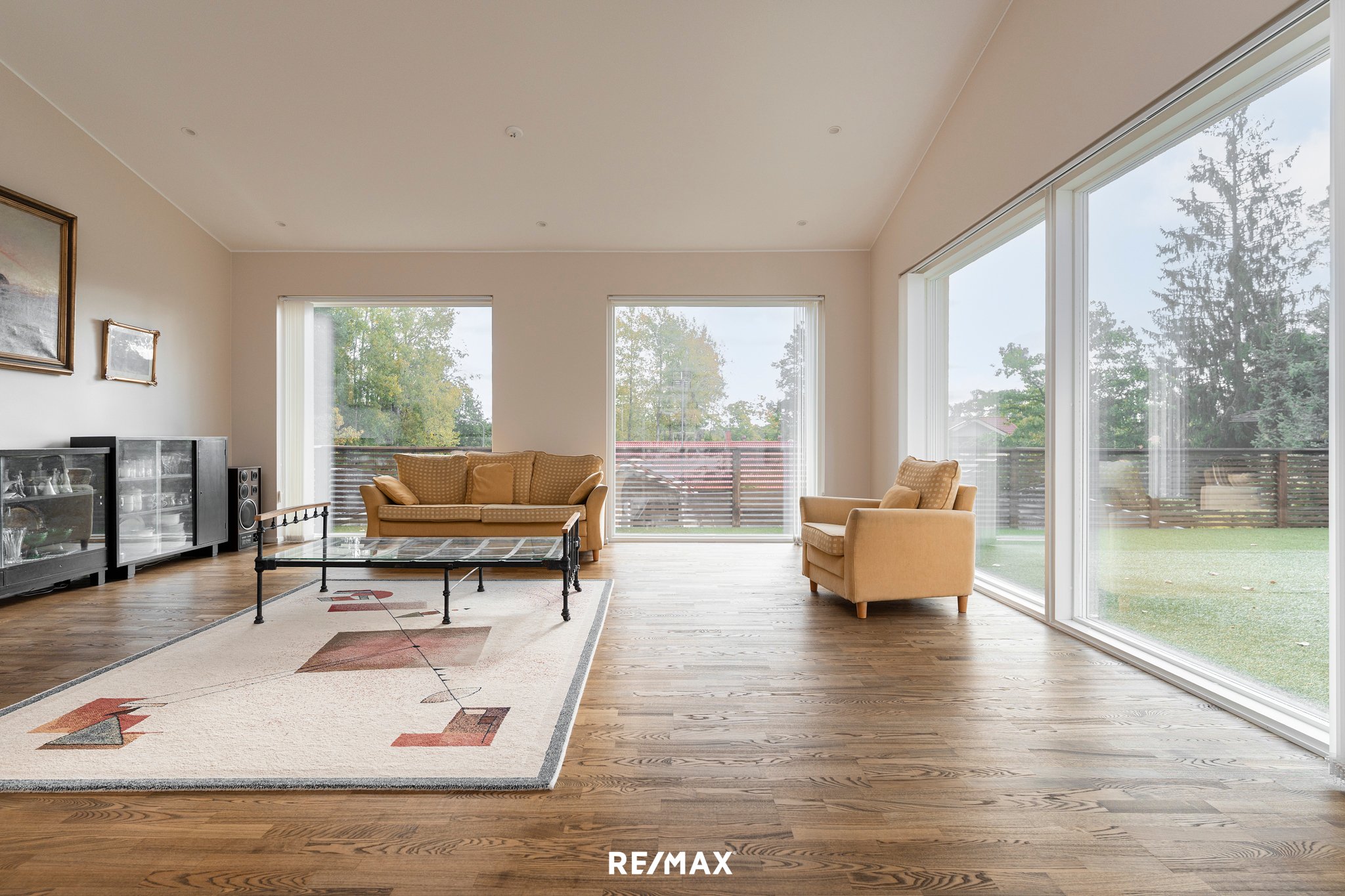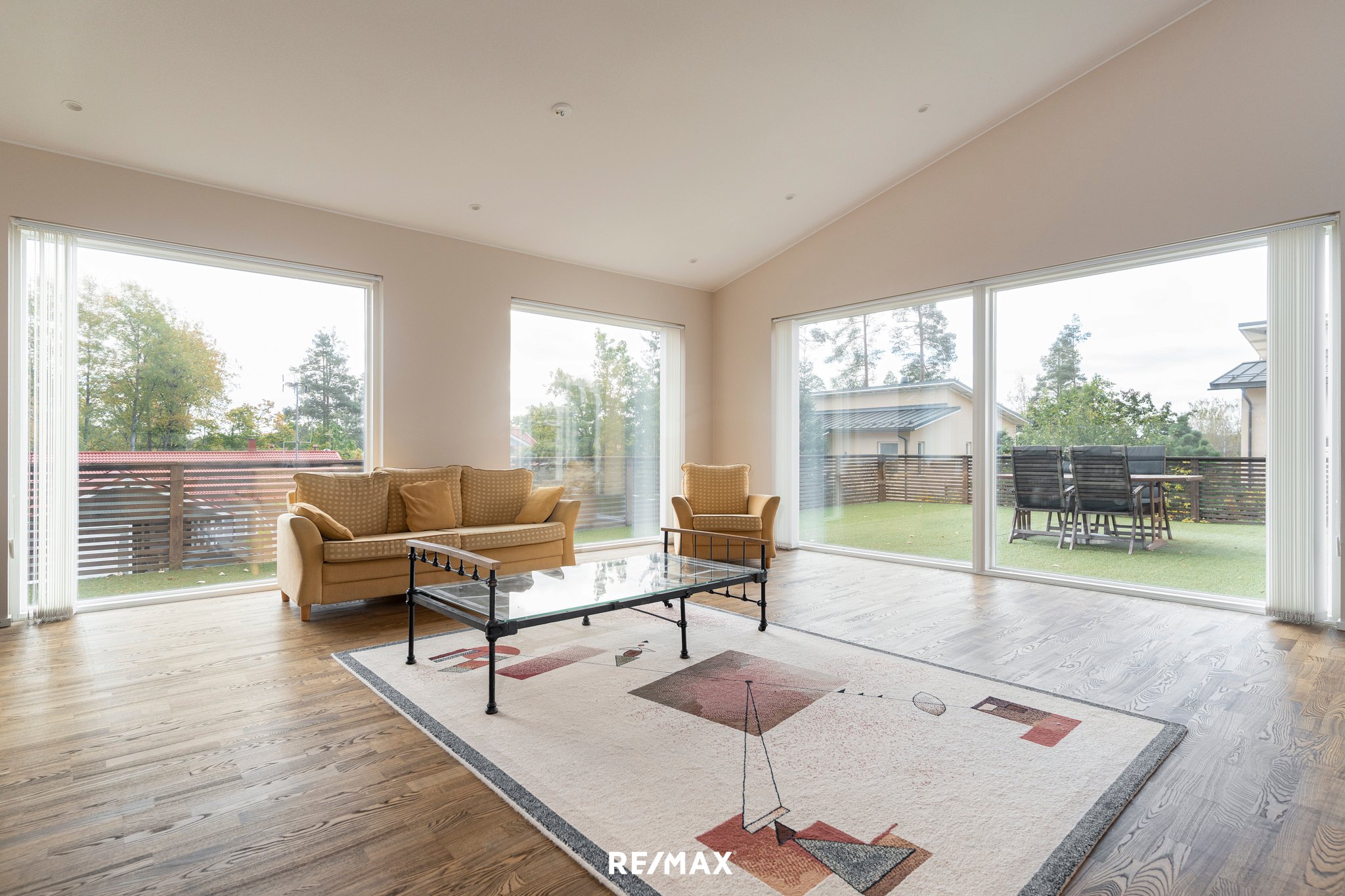Talo sijaitsee kadun korkeimmalla kohdalla ja sieltä avautuvat avarat ja vehreät maisemat. Iso olohuone huokuu ylellisyyttä lattiasta asti alkavien ikkunoiden ja korkean katon ansiosta. Keittiö ja ruokailutila ovat olohuoneesta erikseen, mutta avautuvat vinosti olohuoneen puolelle. Tyylikkäässä keittiössä on Puustellin kaapistot ja kestävät kivitasot. Keittiön saareke on siirrettävä ja tilassa hoituu niin arjen ruokailut kuin suuremmatkin juhlat. Keittiöstä aukeavat pariovet terassille.