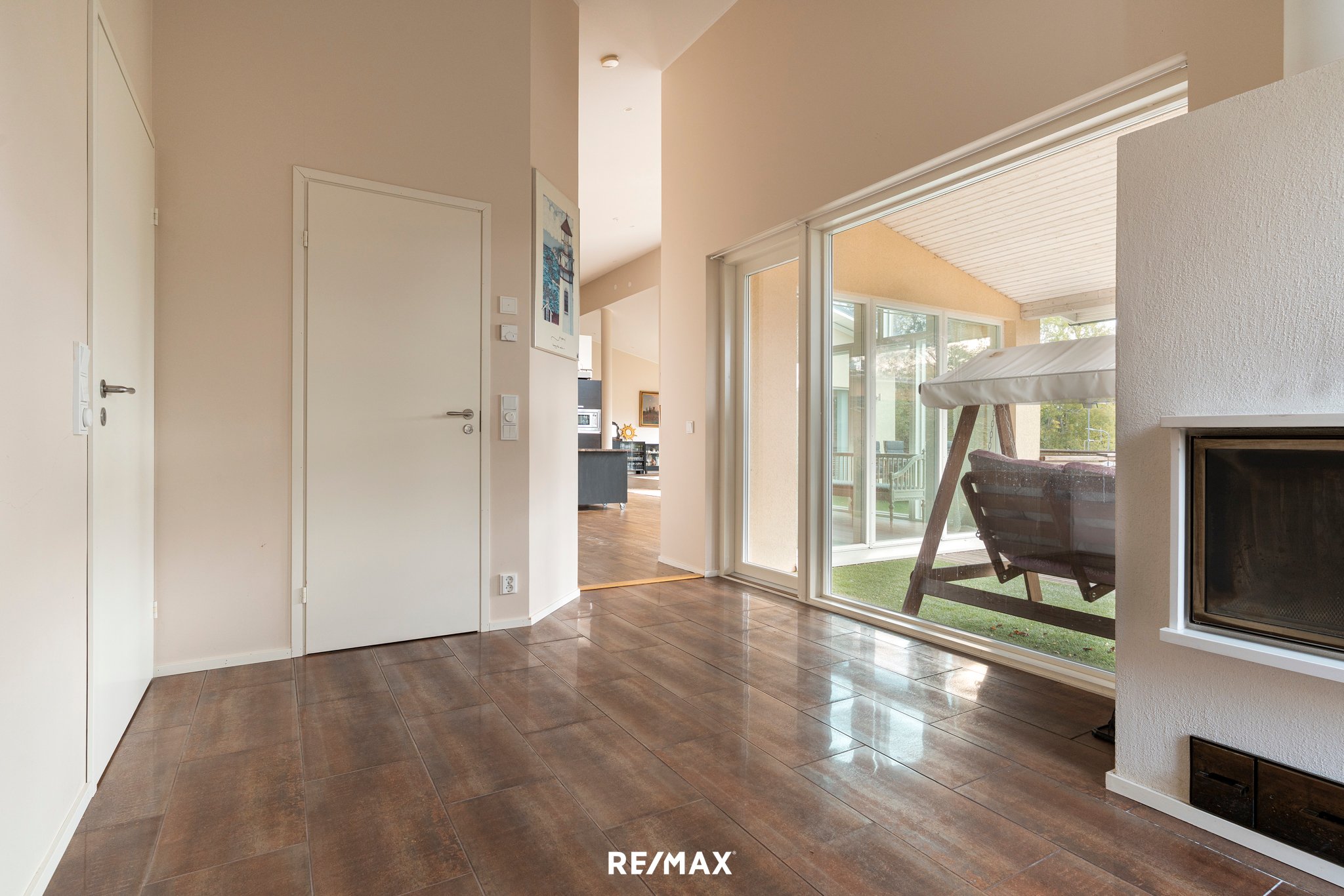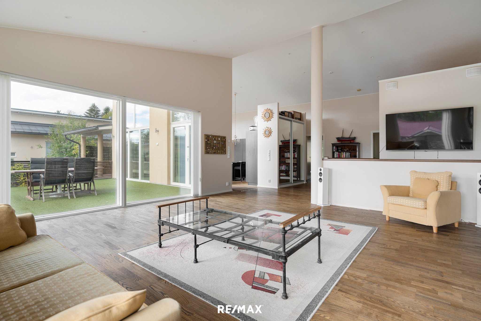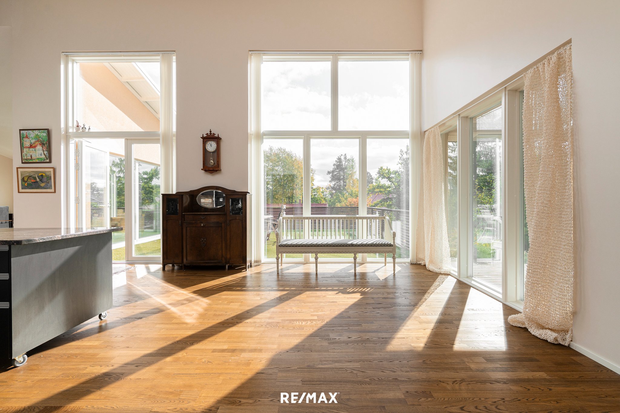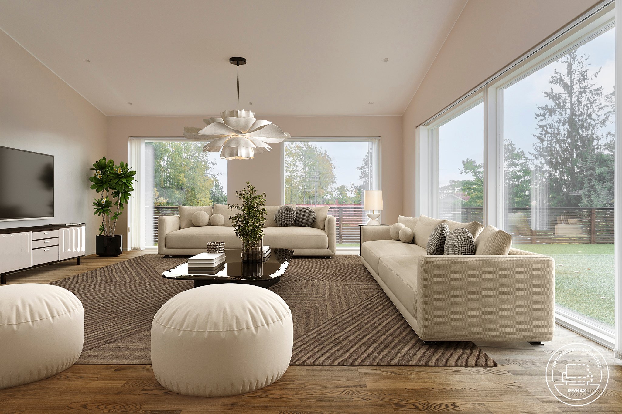 Talo sijaitsee kadun korkeimmalla kohdalla ja sieltä avautuvat avarat ja vehreät maisemat. Iso olohuone huokuu ylellisyyttä lattiasta asti alkavien ikkunoiden ja korkean katon ansiosta. Keittiö ja ruokailutila ovat olohuoneesta erikseen, mutta avautuvat vinosti olohuoneen puolelle. Tyylikkäässä keittiössä on Puustellin kaapistot ja kestävät kivitasot. Keittiön saareke on siirrettävä ja tilassa hoituu niin arjen ruokailut kuin suuremmatkin juhlat. Keittiöstä aukeavat pariovet terassille.