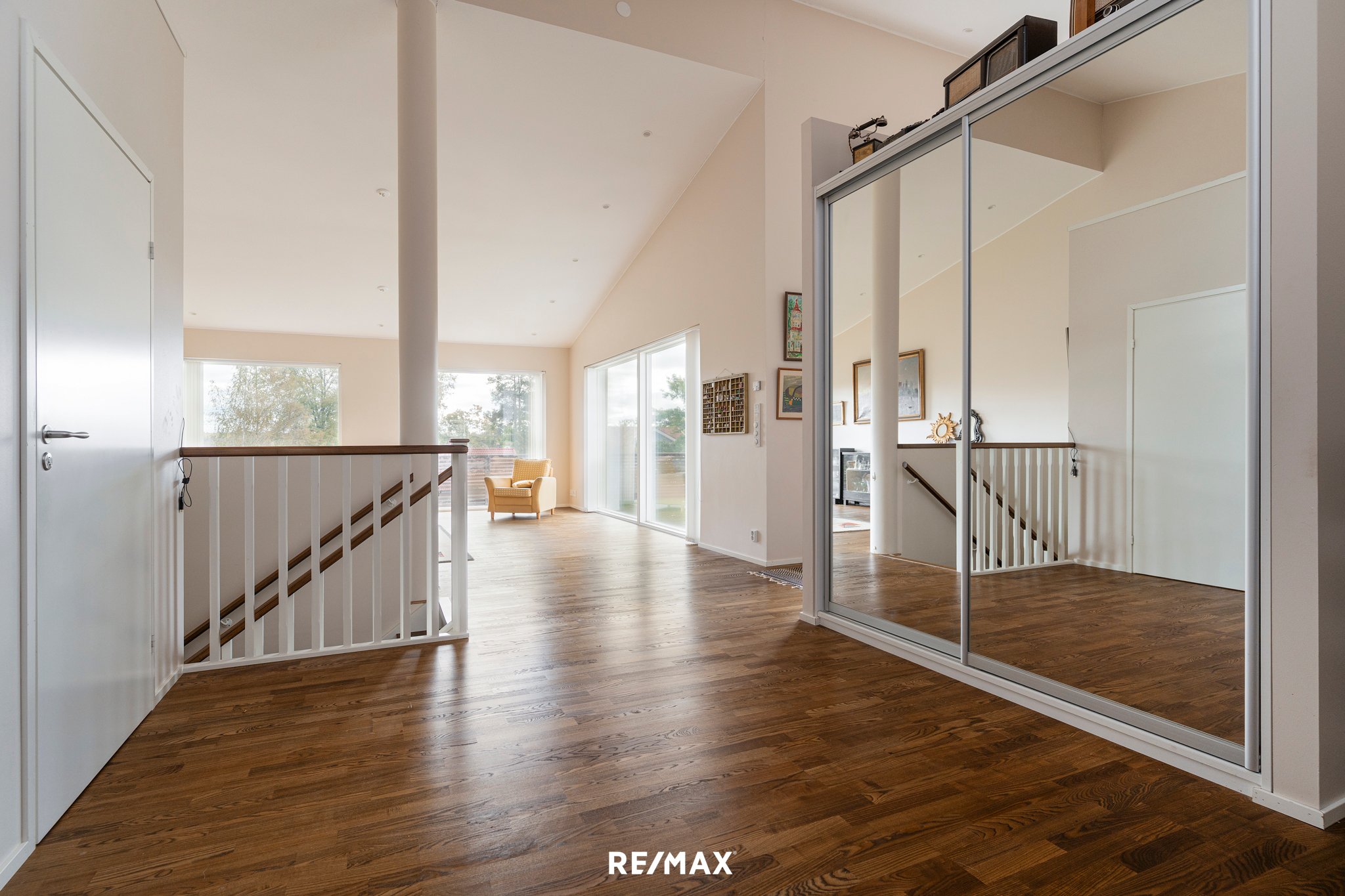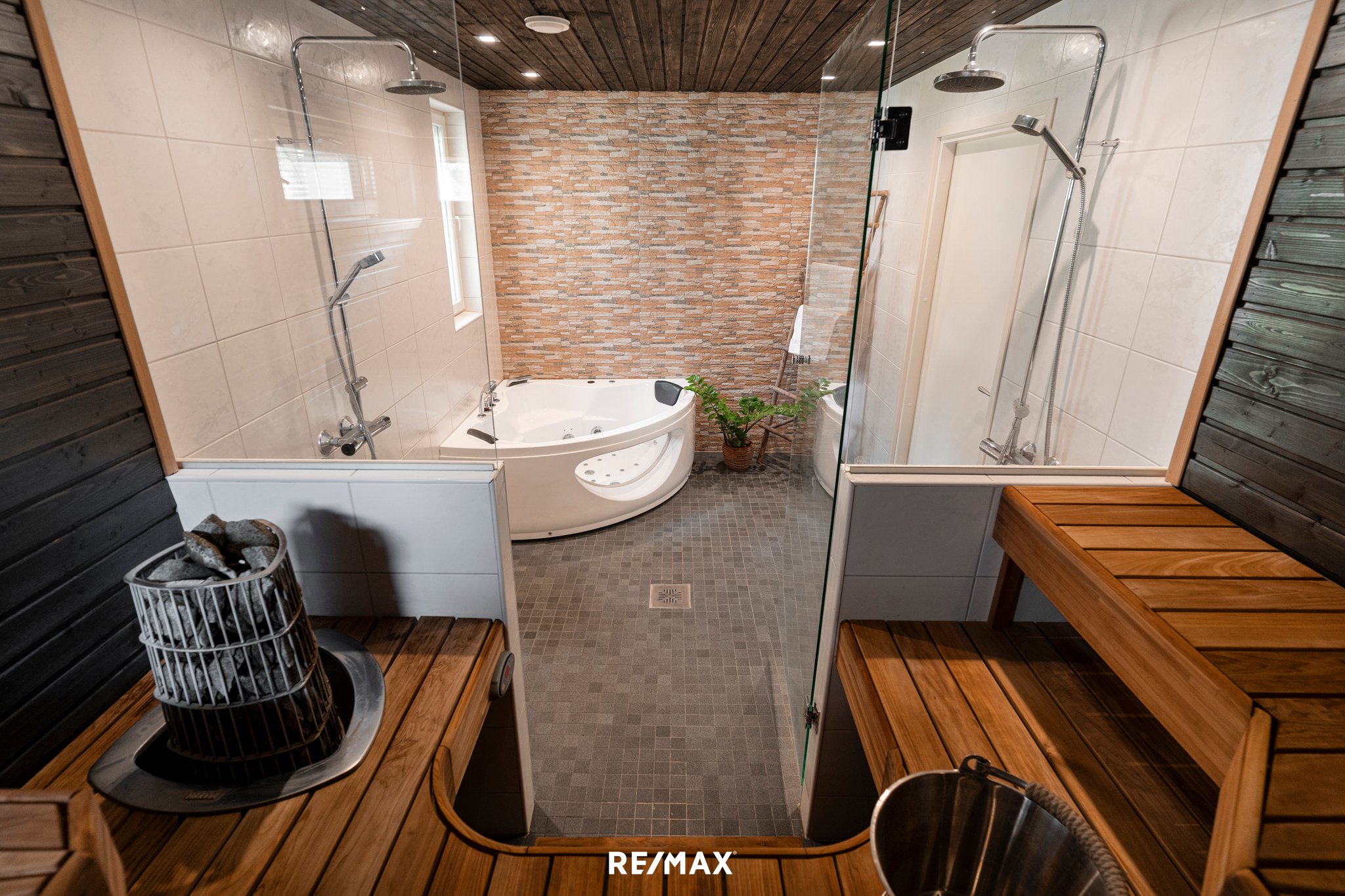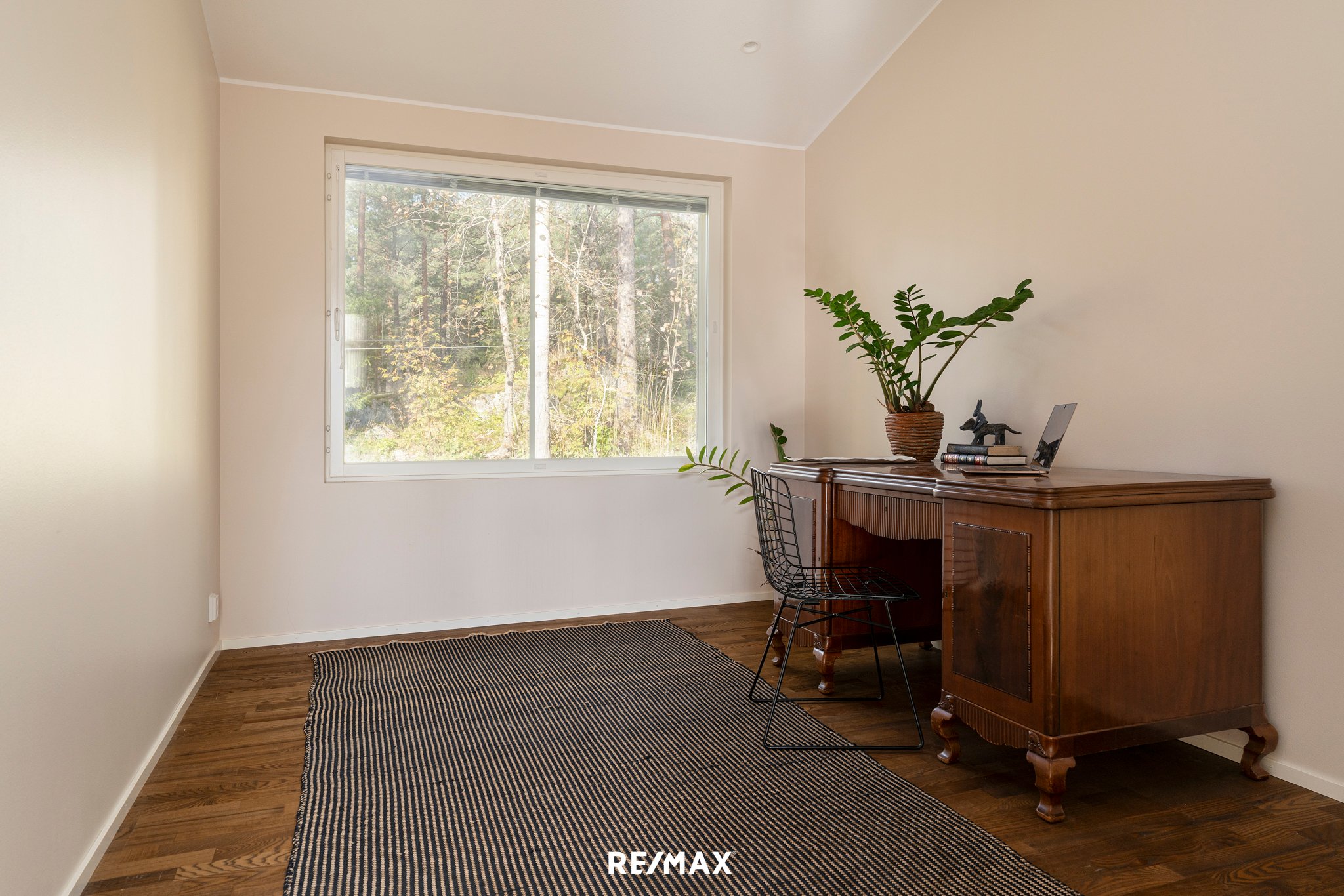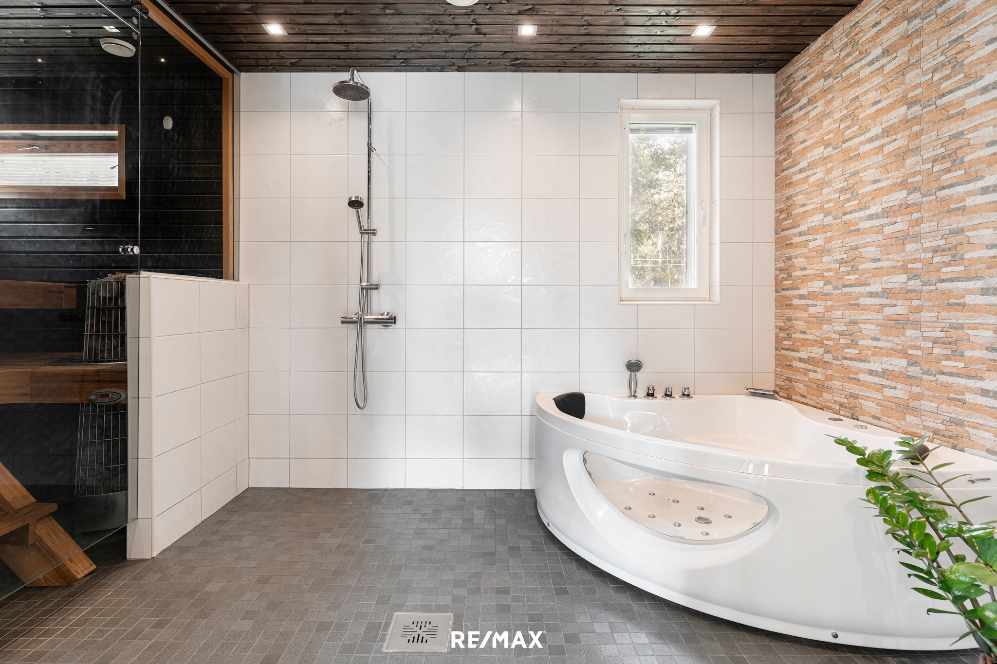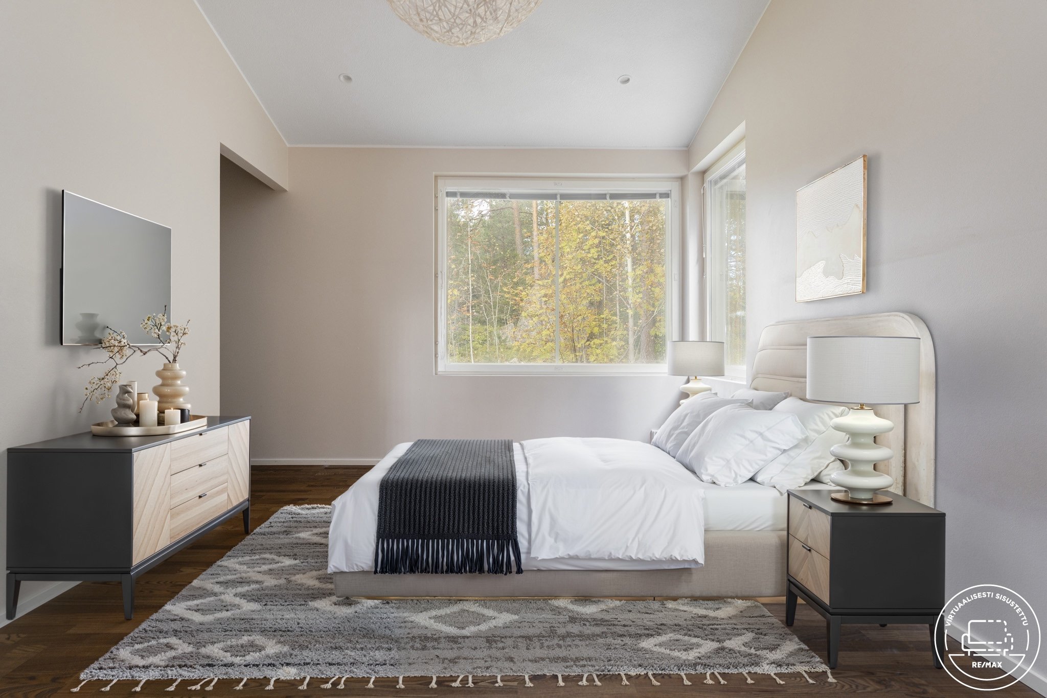Asuinkerroksesta löytyy lisäksi kolme makuuhuonetta. Kaikkien makuuhuoneiden ikkunat avautuvat metsän suuntaan ja kaikissa makuuhuoneissa on tilavat Puustellin liukuovikaapistot. Kylpyhuone ja sauna ovat harmoniset värimaailmaltaan. Kylpyhuoneessa arjen luksusta tarjoaa poreamme, jossa viihtyvät niin aikuiset kuin perheen pienimmätkin. Saunan jälkeen voit siirtyä talvella takkahuoneeseen tunnelmoimaan ja kesällä terassille vilvoittelemaan.