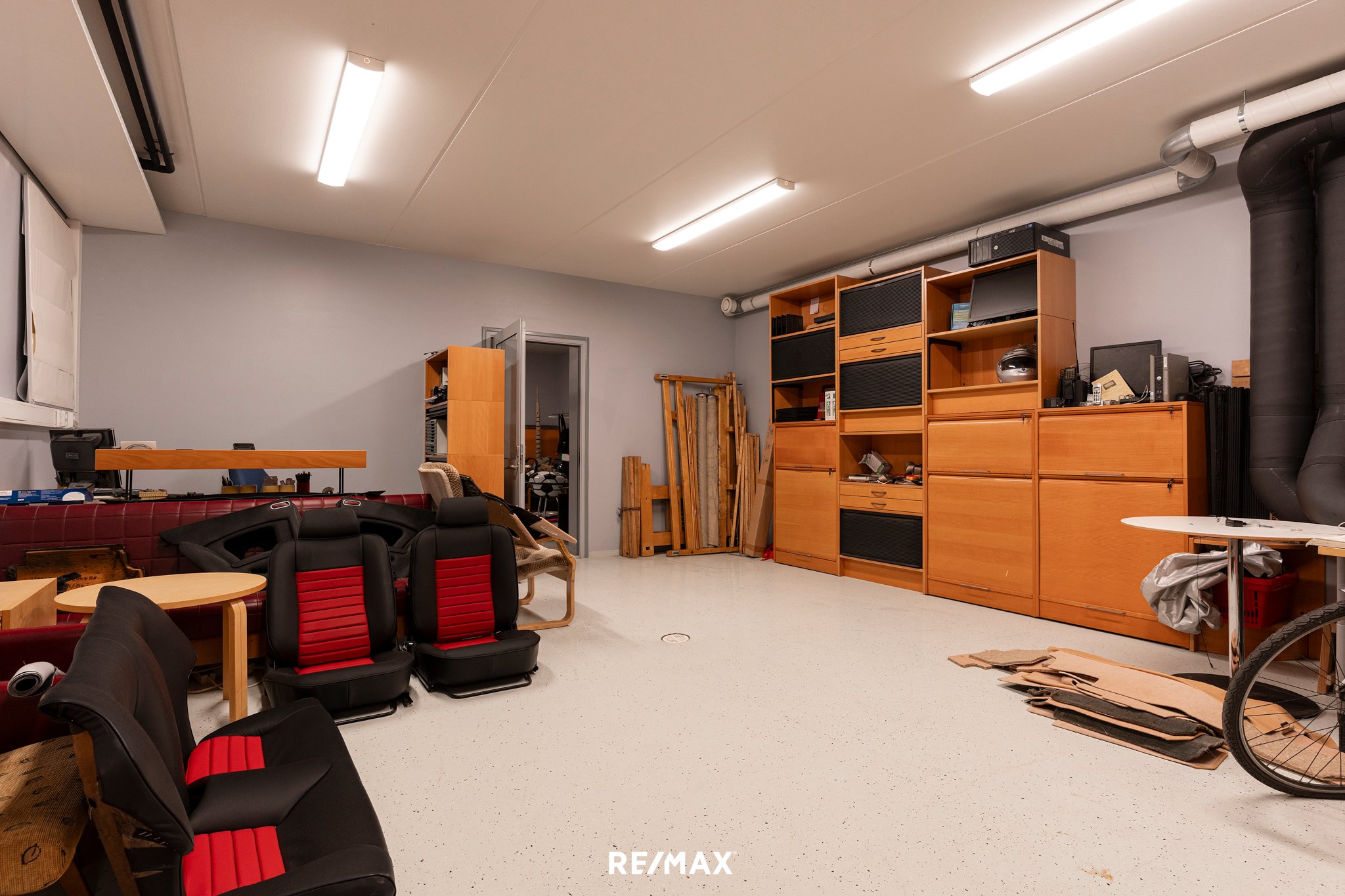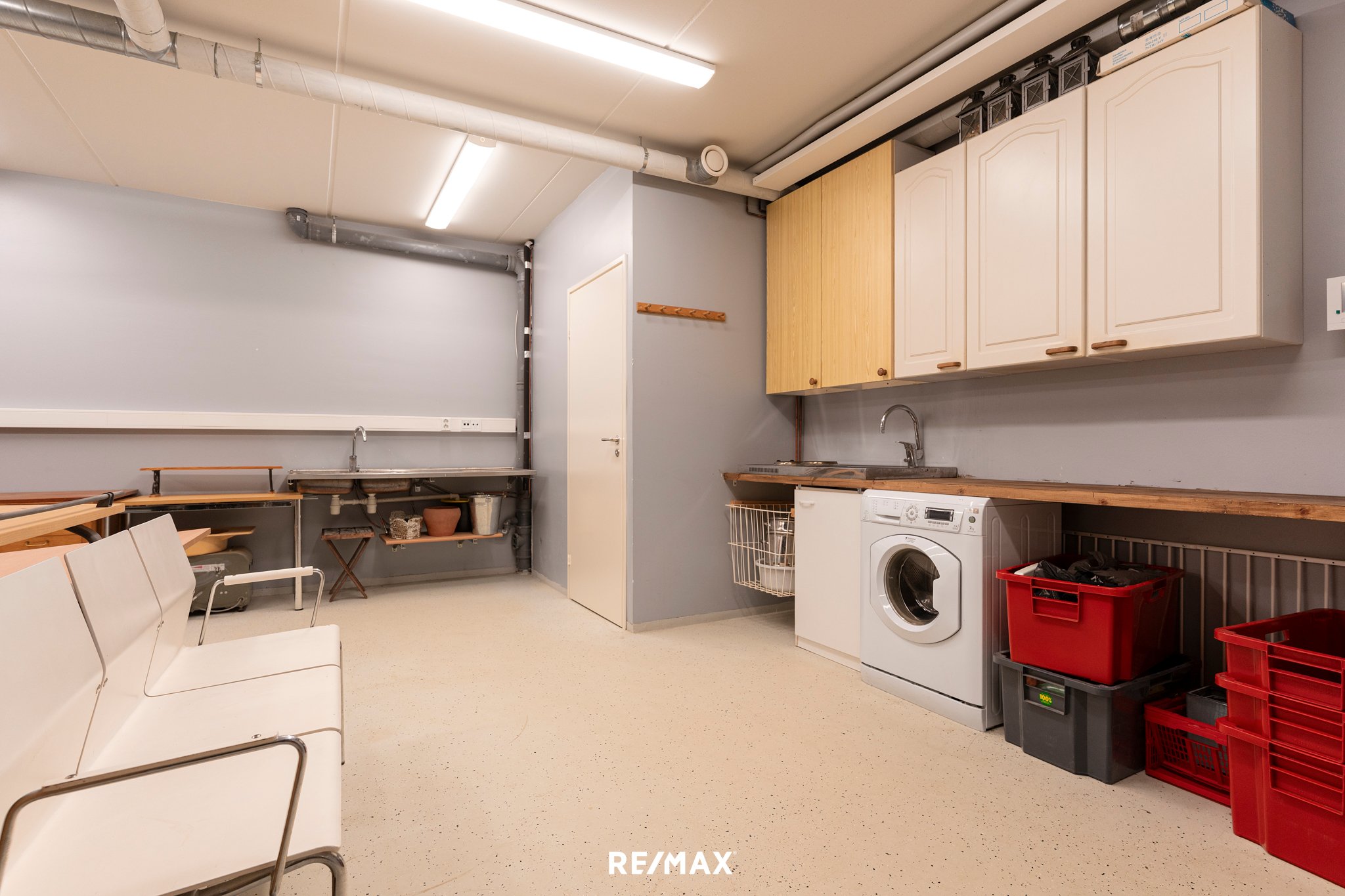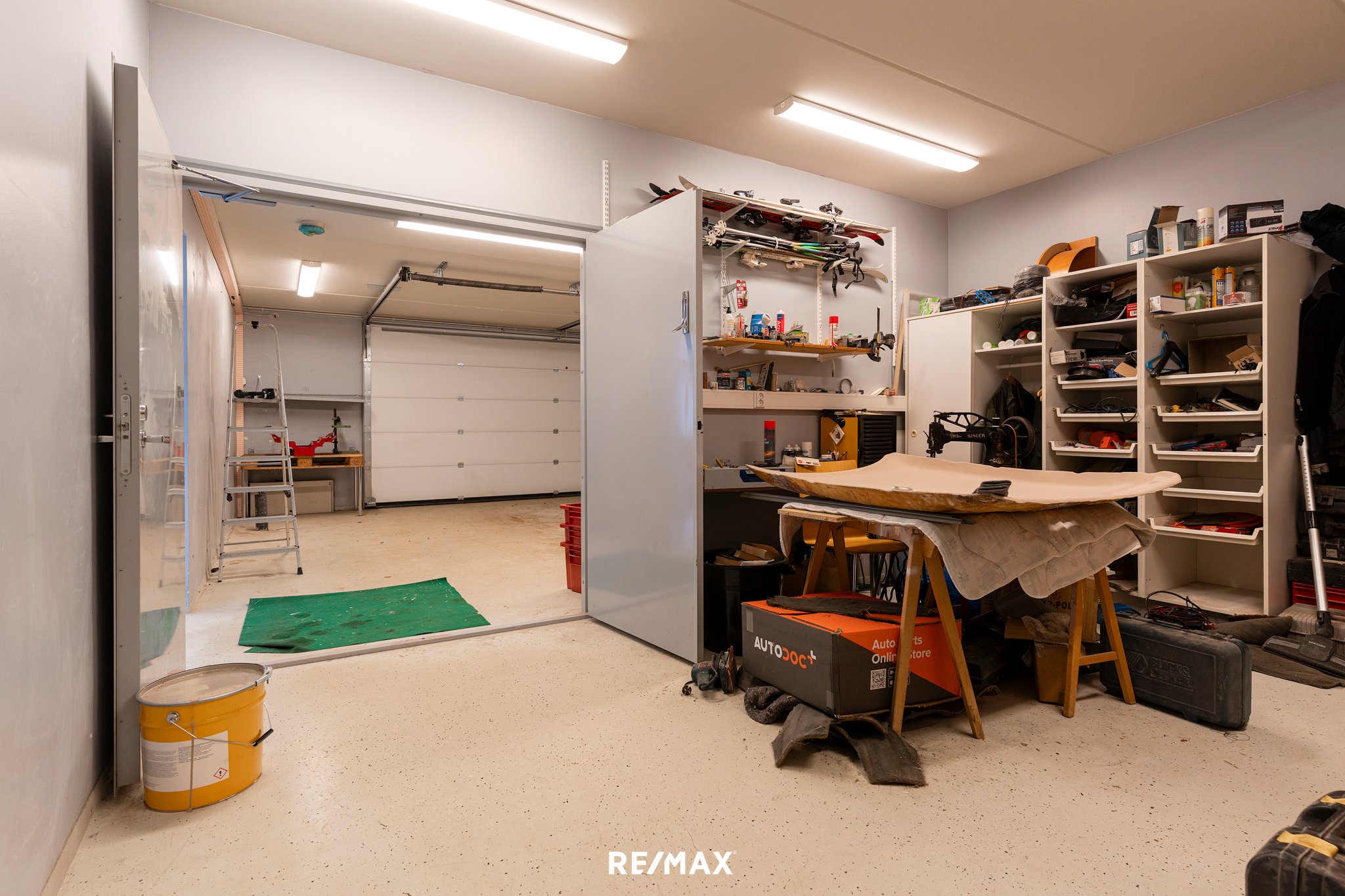 Kaikki asuintilat sijaitsevat samassa kerroksessa ja bonuksena on 186 m2 kellarikerros. Kellarikerroksen huonekorkeus on 2,7 metriä ja se soveltuukin monenlaiseen harrastukseen, säilytykseen ja toimintaan. Kerroksesta löytyy erillinen wc, jossa on suihkukaappi. Autotalleissa on lattiakaivot ja nosto-ovet. Autotalleista pääsee kulkemaan asuinkerrokseen portaita pitkin.