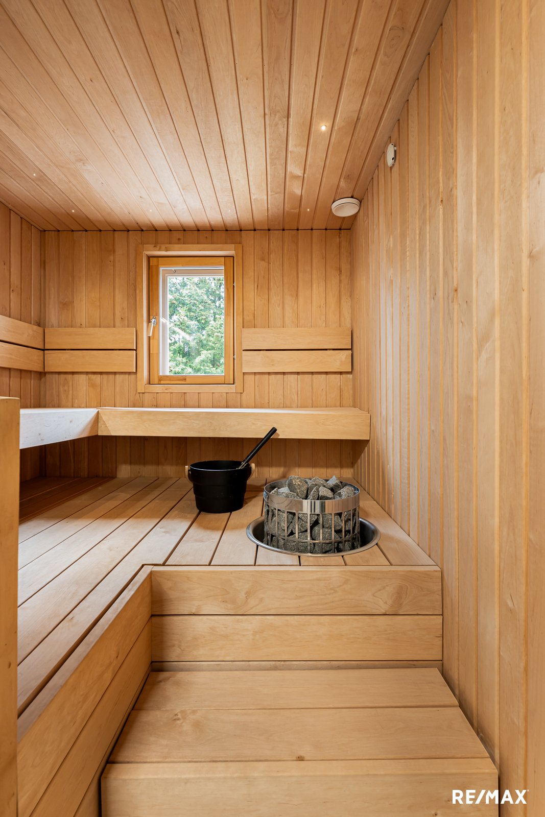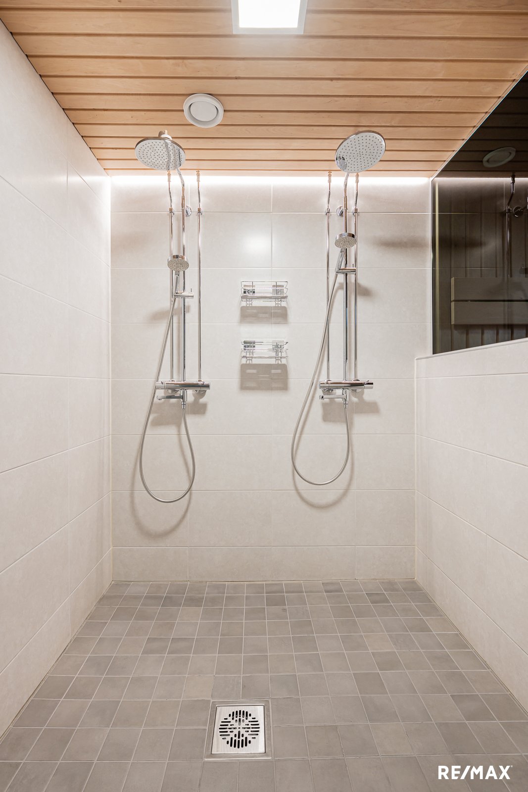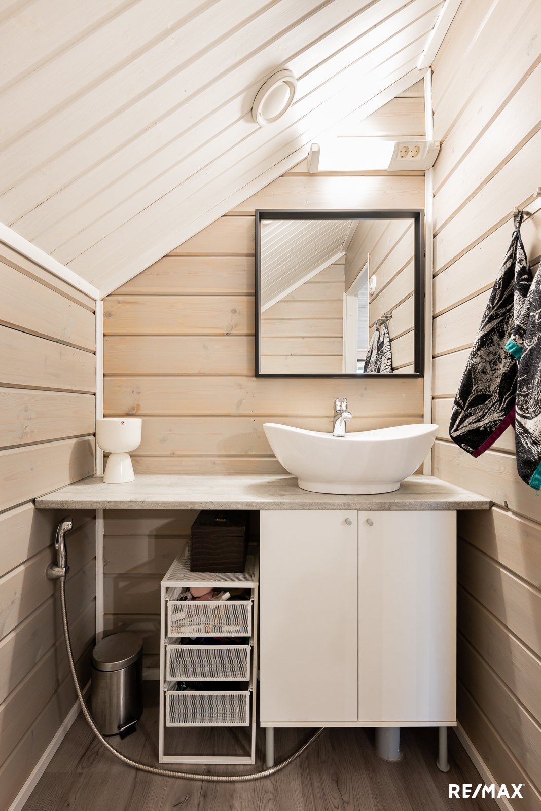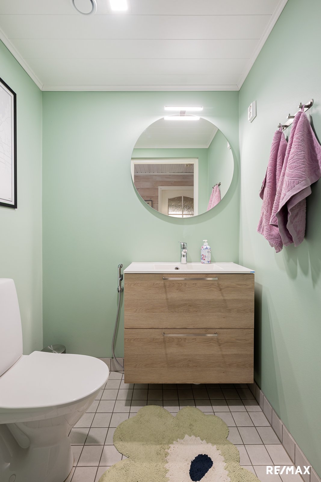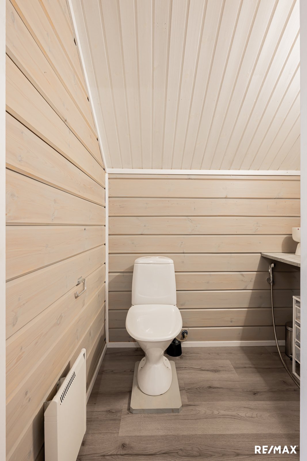 Alakerrassa on upeasti remontoidut erillinen wc, kodinhoitohuone, kylpyhuone, kodinhoitohuone, sauna ja pukuhuone ja uloskäynti talon sivustalle kuistille. Alakerrassa sijaitsee myös talon suurin makuuhuone.