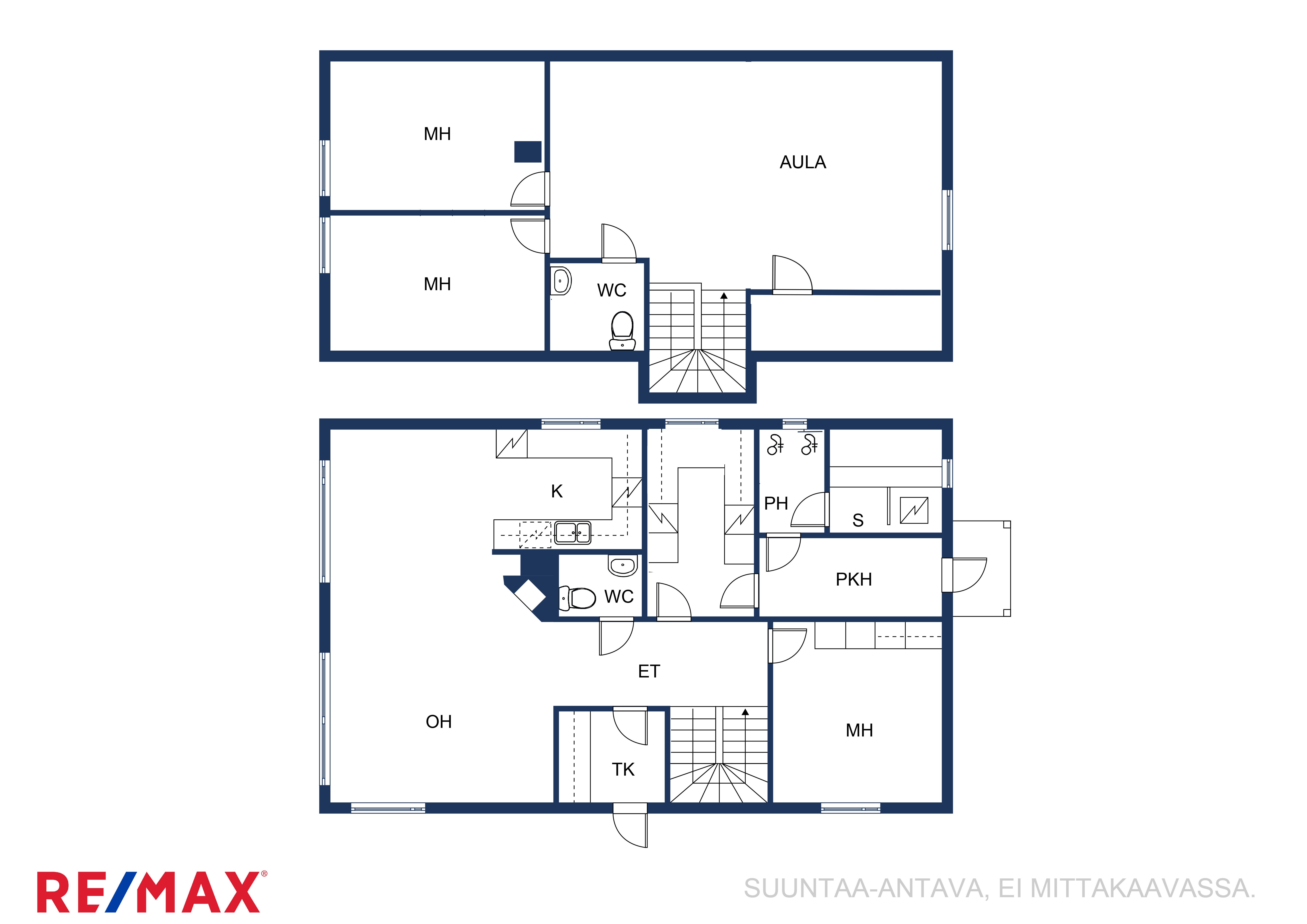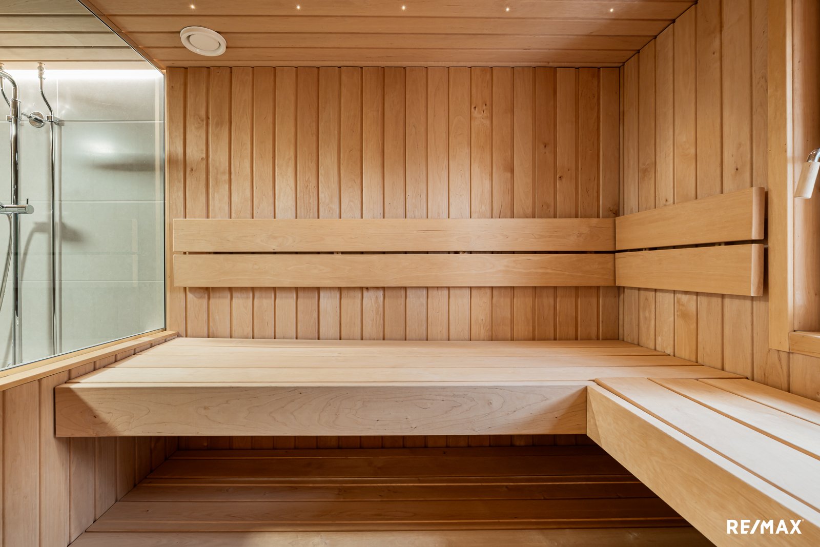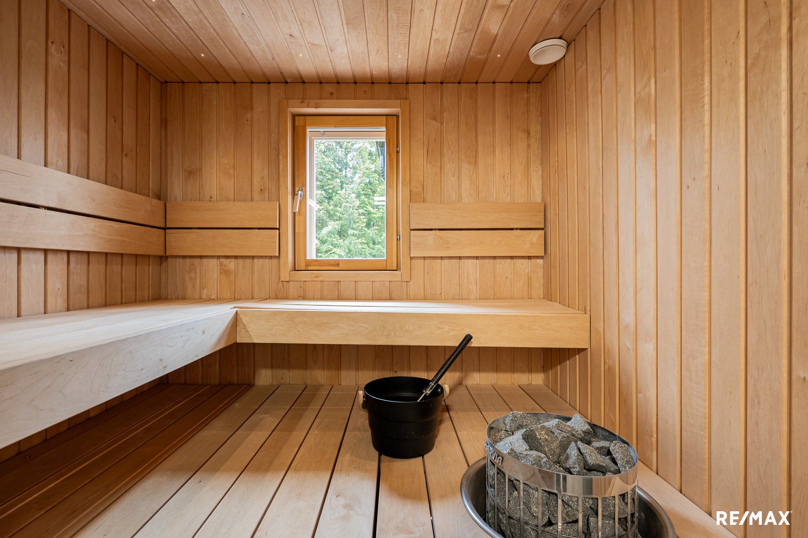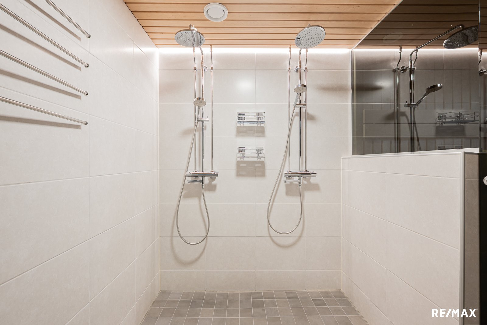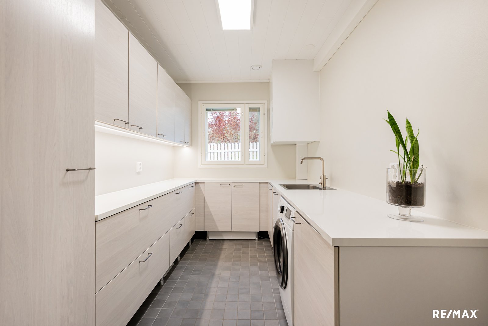 Alakerrassa on upeasti remontoidut erillinen wc, kodinhoitohuone, kylpyhuone, kodinhoitohuone, sauna ja pukuhuone ja uloskäynti talon sivustalle kuistille. Alakerrassa sijaitsee myös talon suurin makuuhuone.
