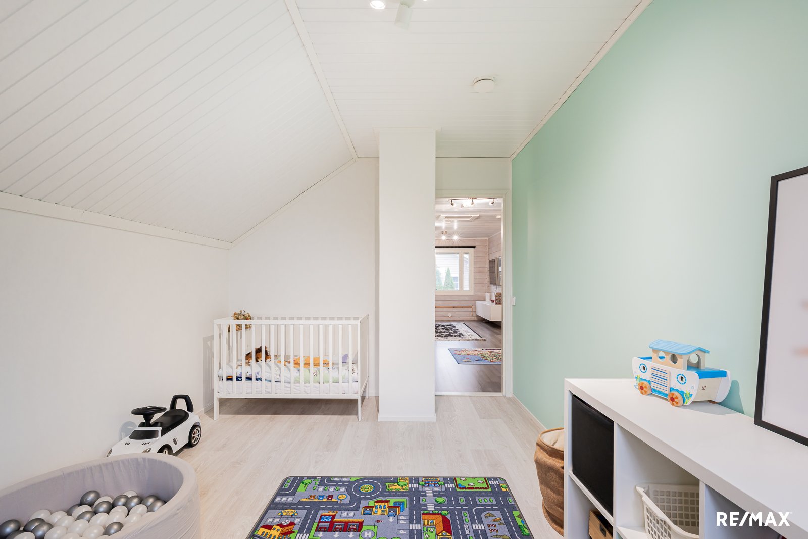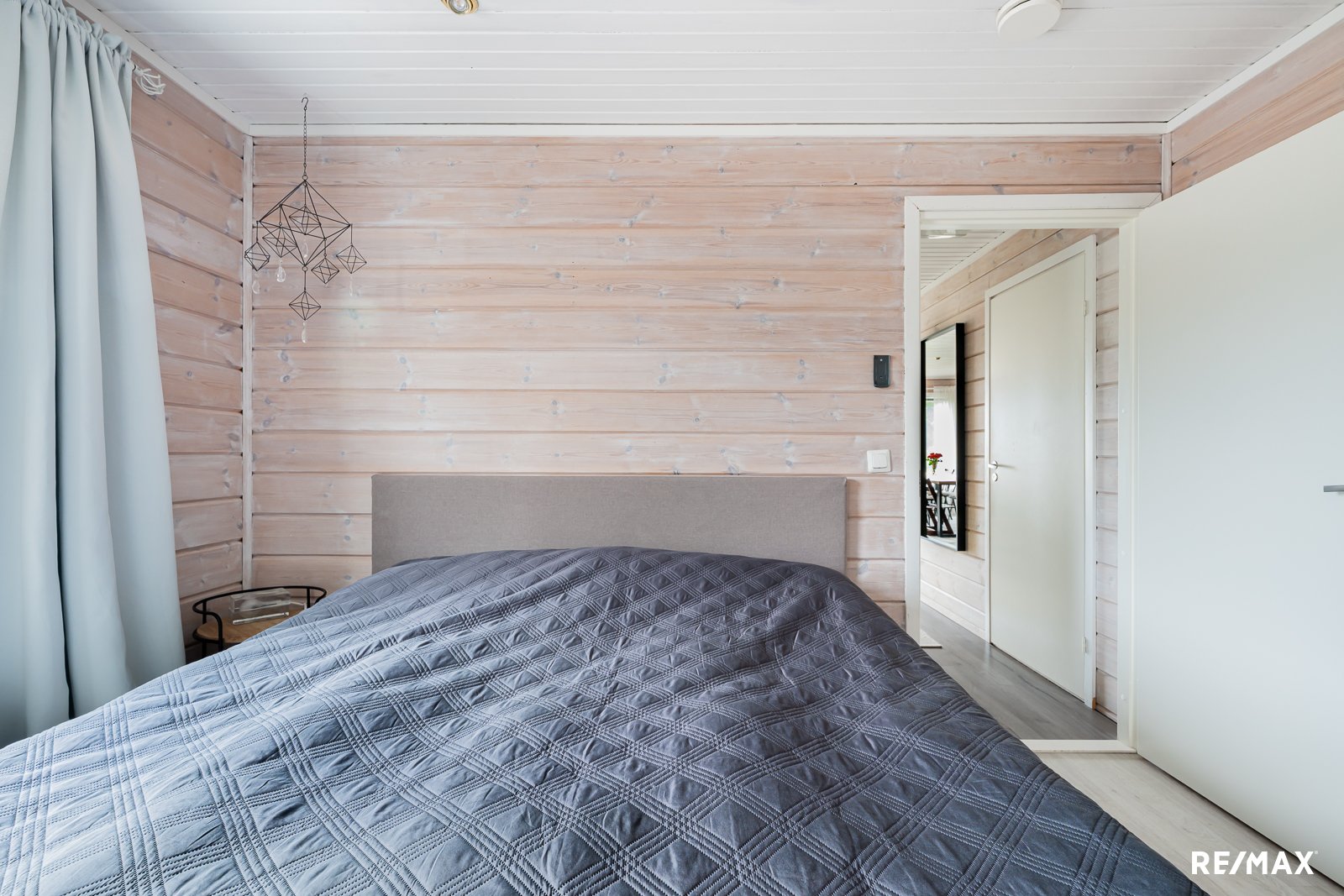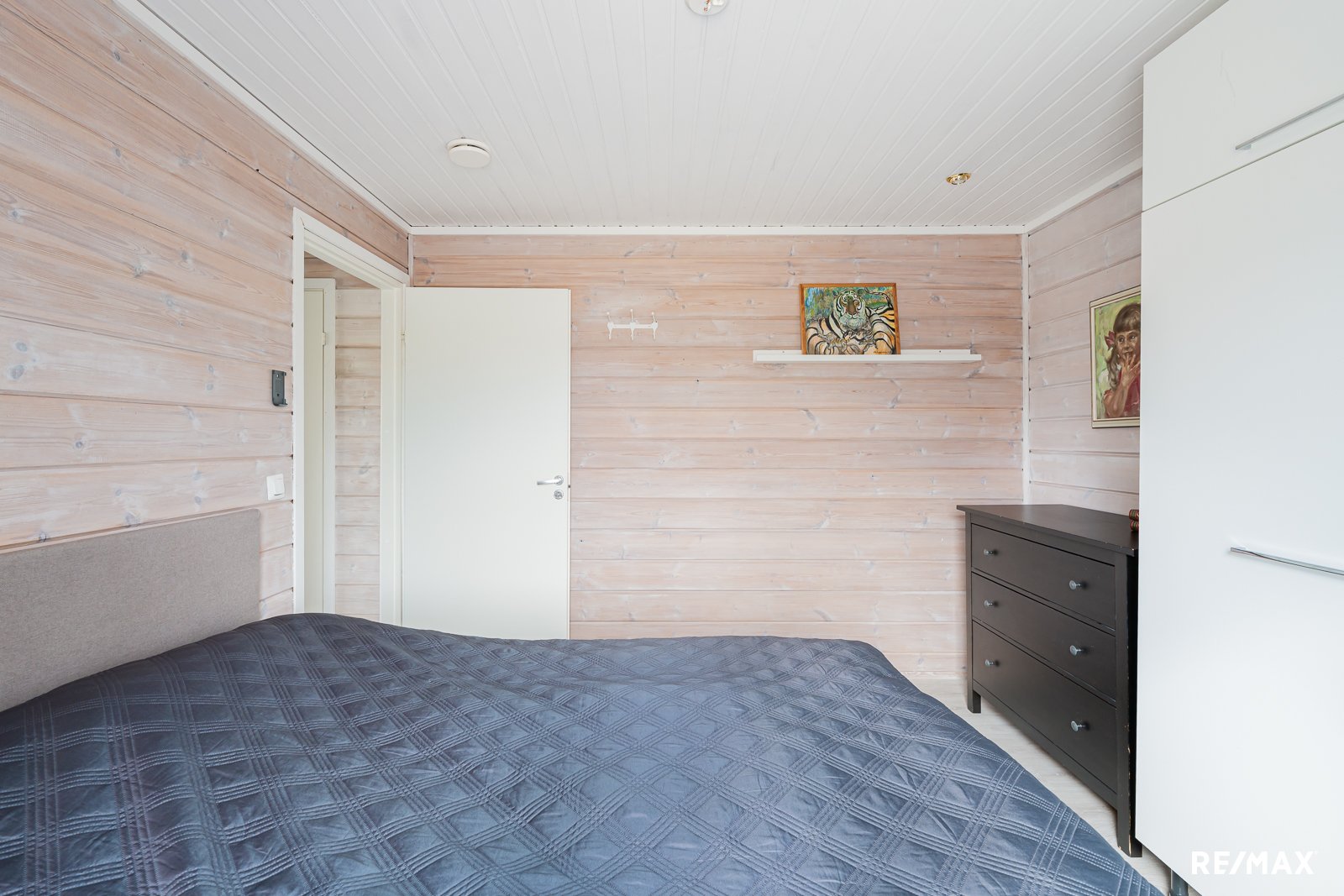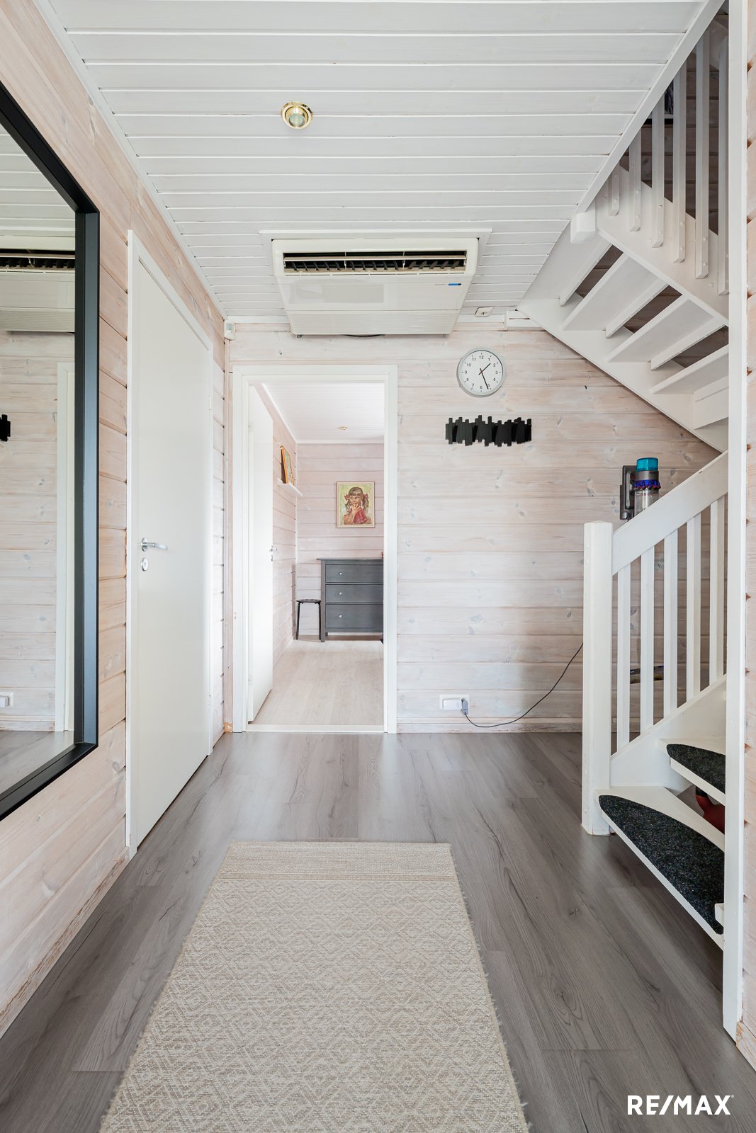 Yläkerrassa on kaksi makuuhuonetta, suuri aula, vaatehuone ja erillinen wc.