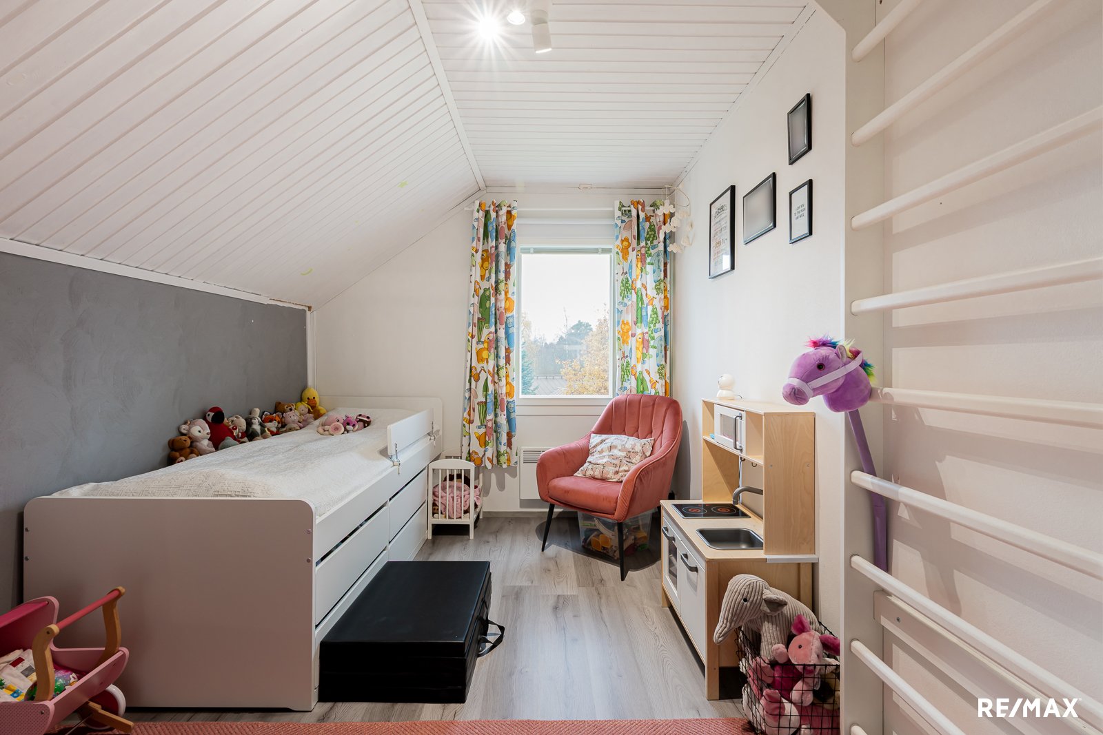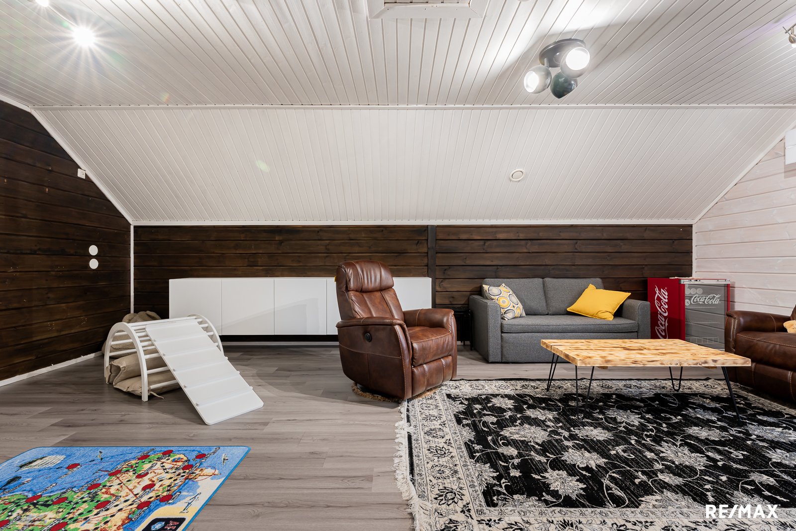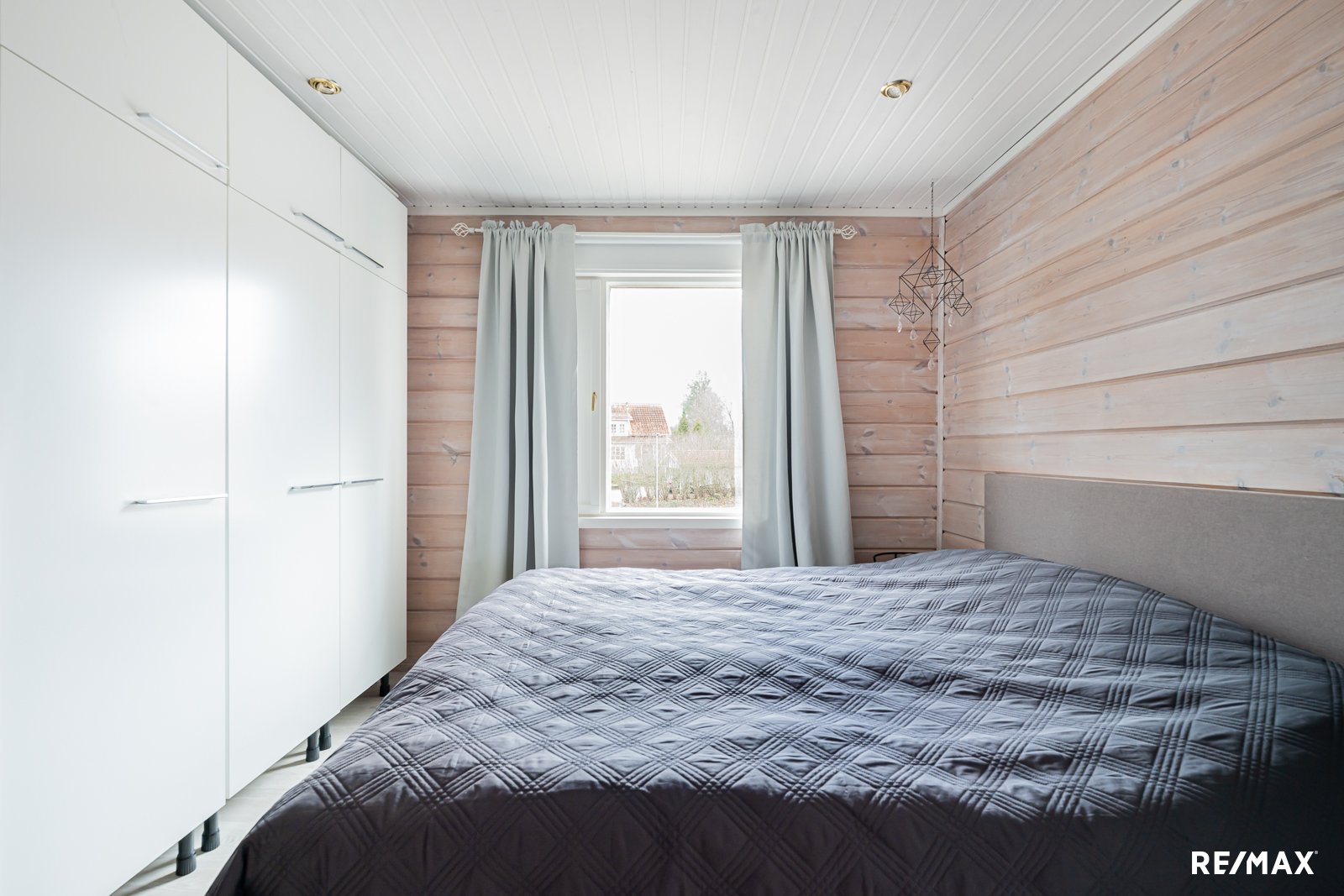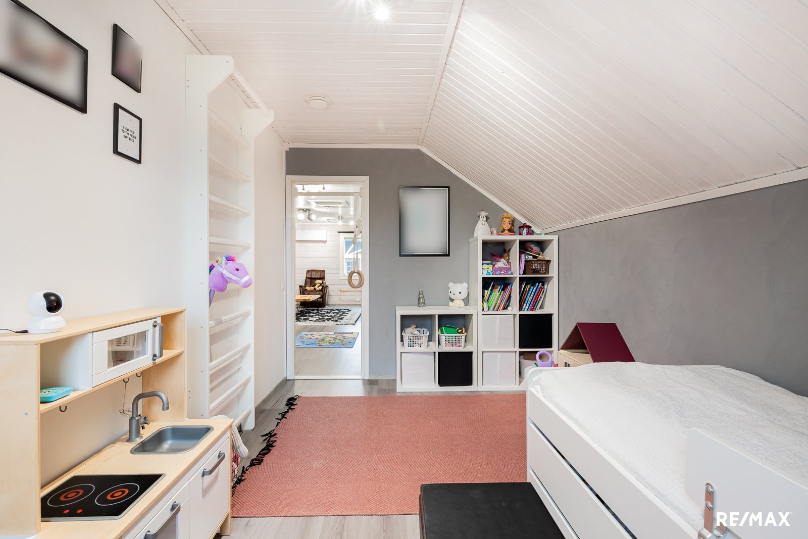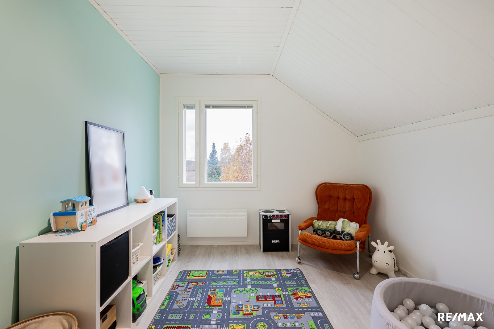 Yläkerrassa on kaksi makuuhuonetta, suuri aula, vaatehuone ja erillinen wc.