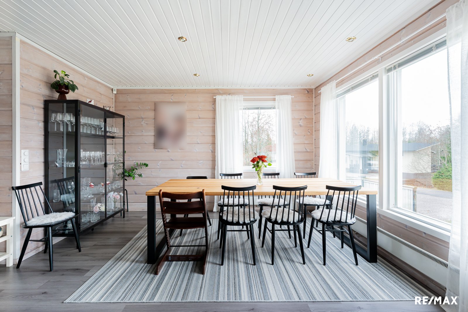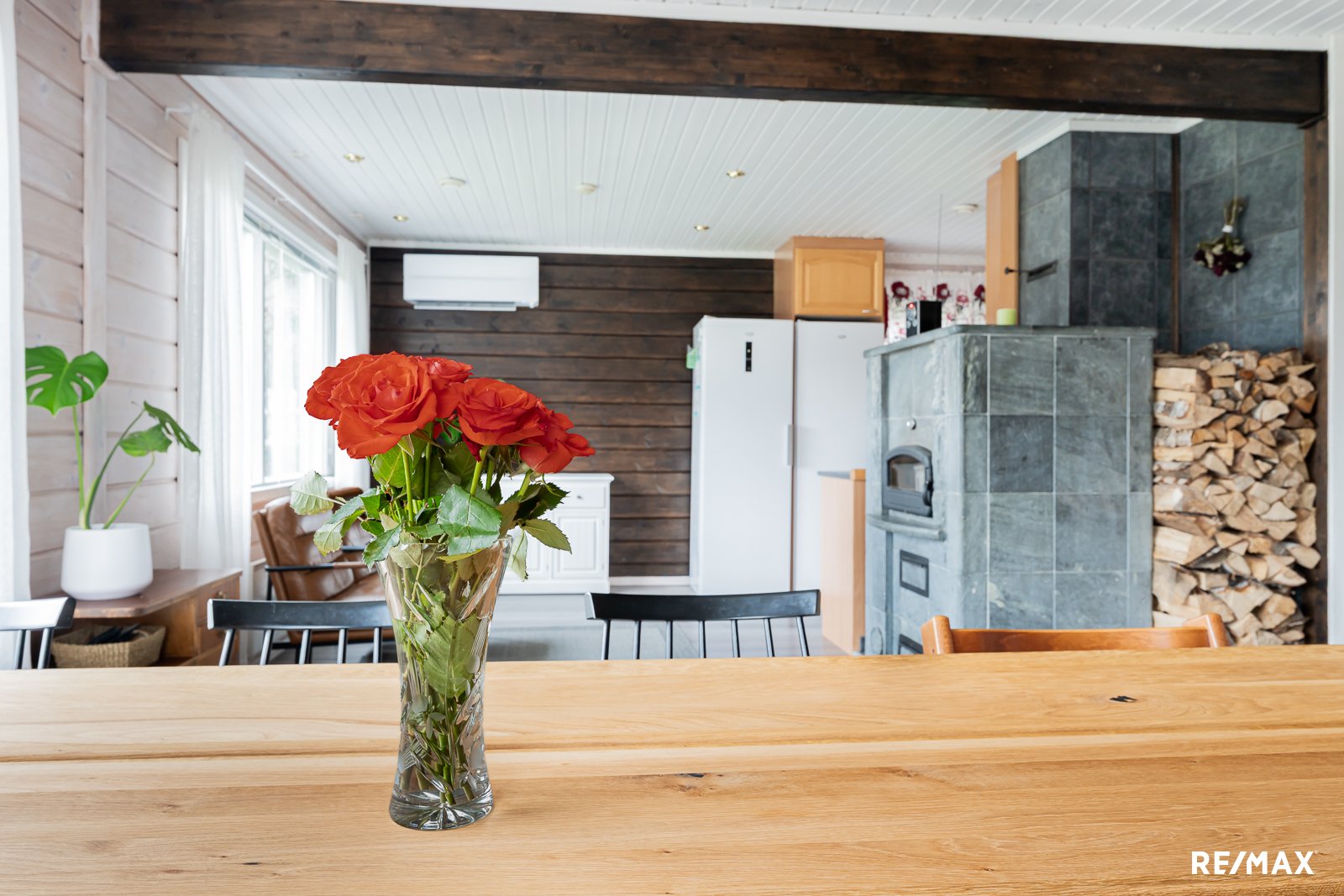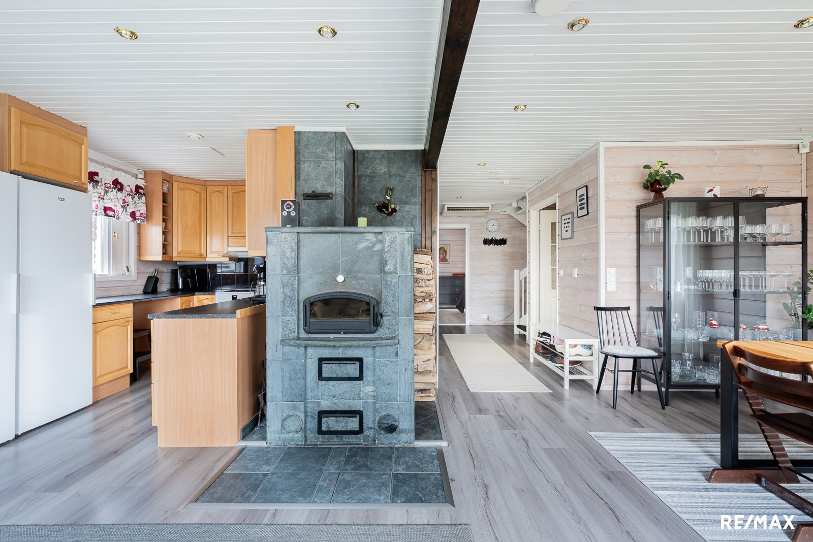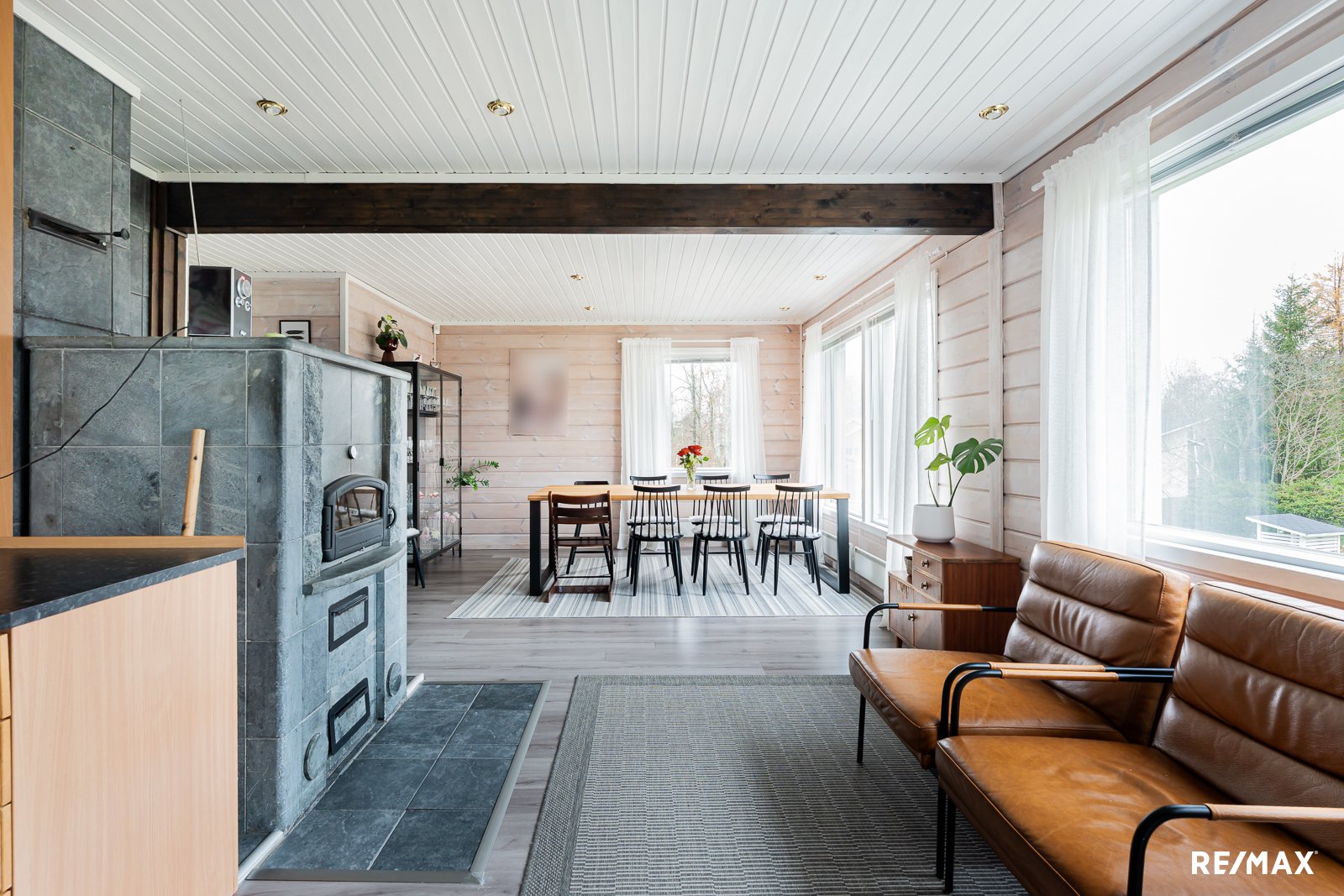 Omalla 1651m2 kulmatontilla sijaitsevan talon asuintilat jakautuvat kahteen kerrokseen ja alakerrassa on eteinen, olohuone, keittiö ja varaava takka leivinuunilla.