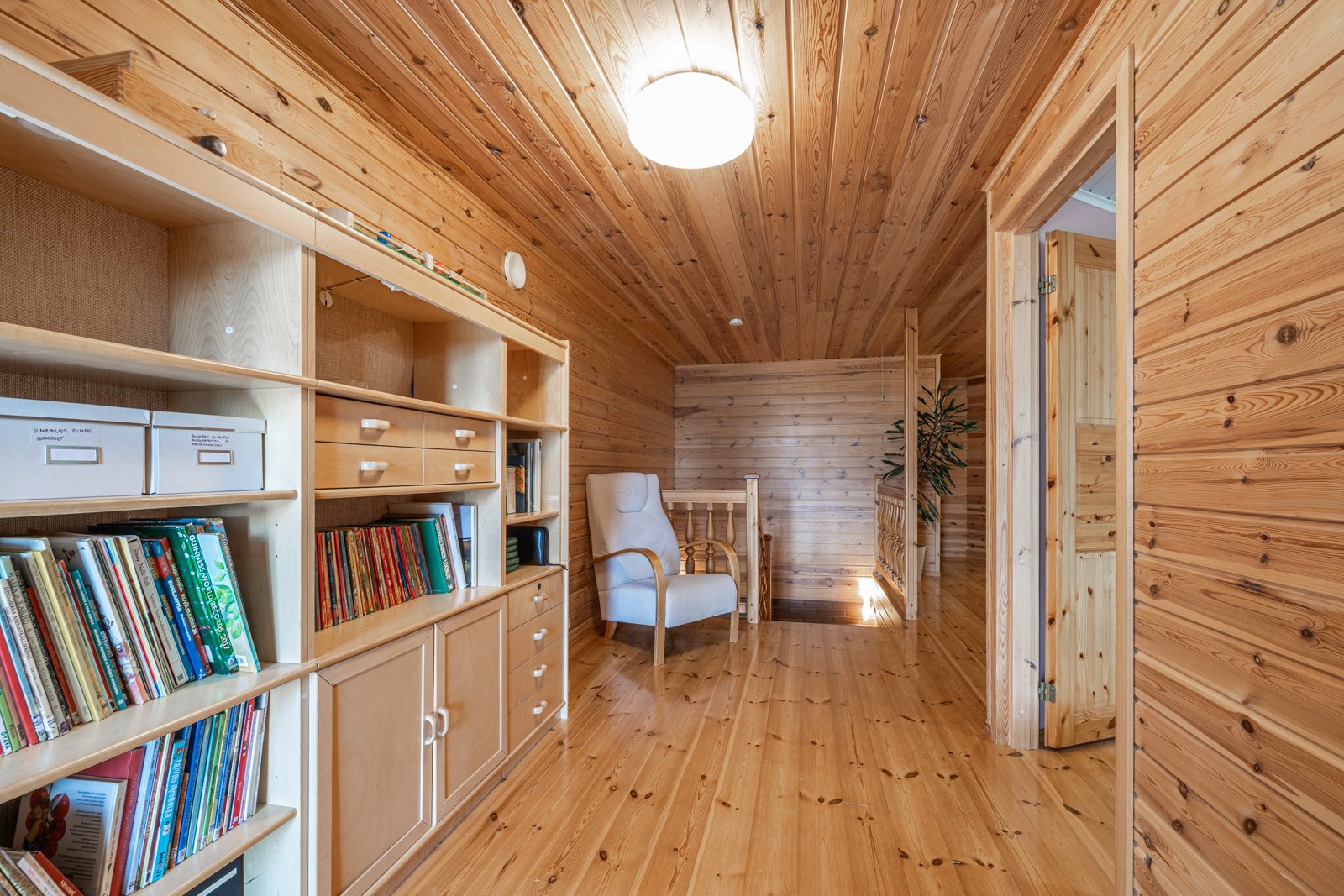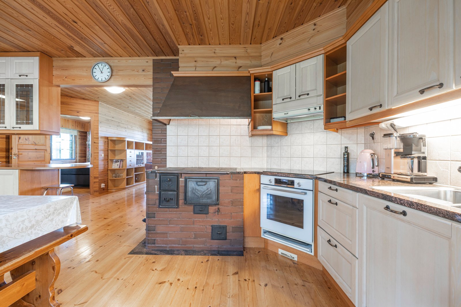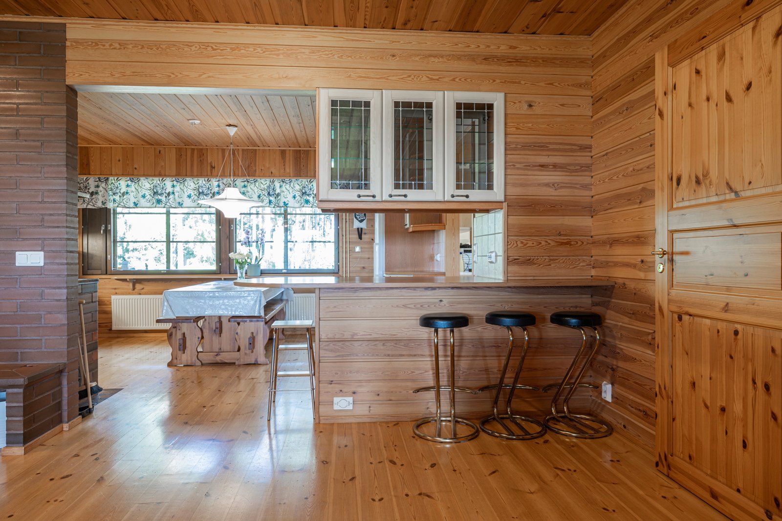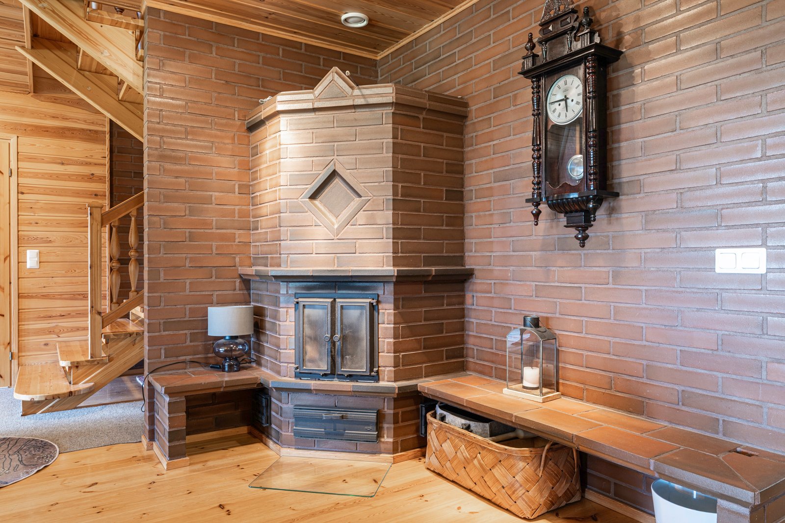 Kaksikerroksisessa talossa on keittiö, neljä makuuhuonetta, kodinhoitohuone ja saunaosasto. Olohuoneen lämpöä sekä tunnelmaa luo varaava takka, joka on oivallinen lisä talon puu- ja öljylämmitysjärjestelmään. Keittiö on varustettu laadukkailla kodinkoneilla, ja puuliesi tuo ripauksen perinteistä tunnelmaa ruoanlaittoon. Ilmanvaihto on koneellinen ja kiinteistölle tulee kunnan vesi.