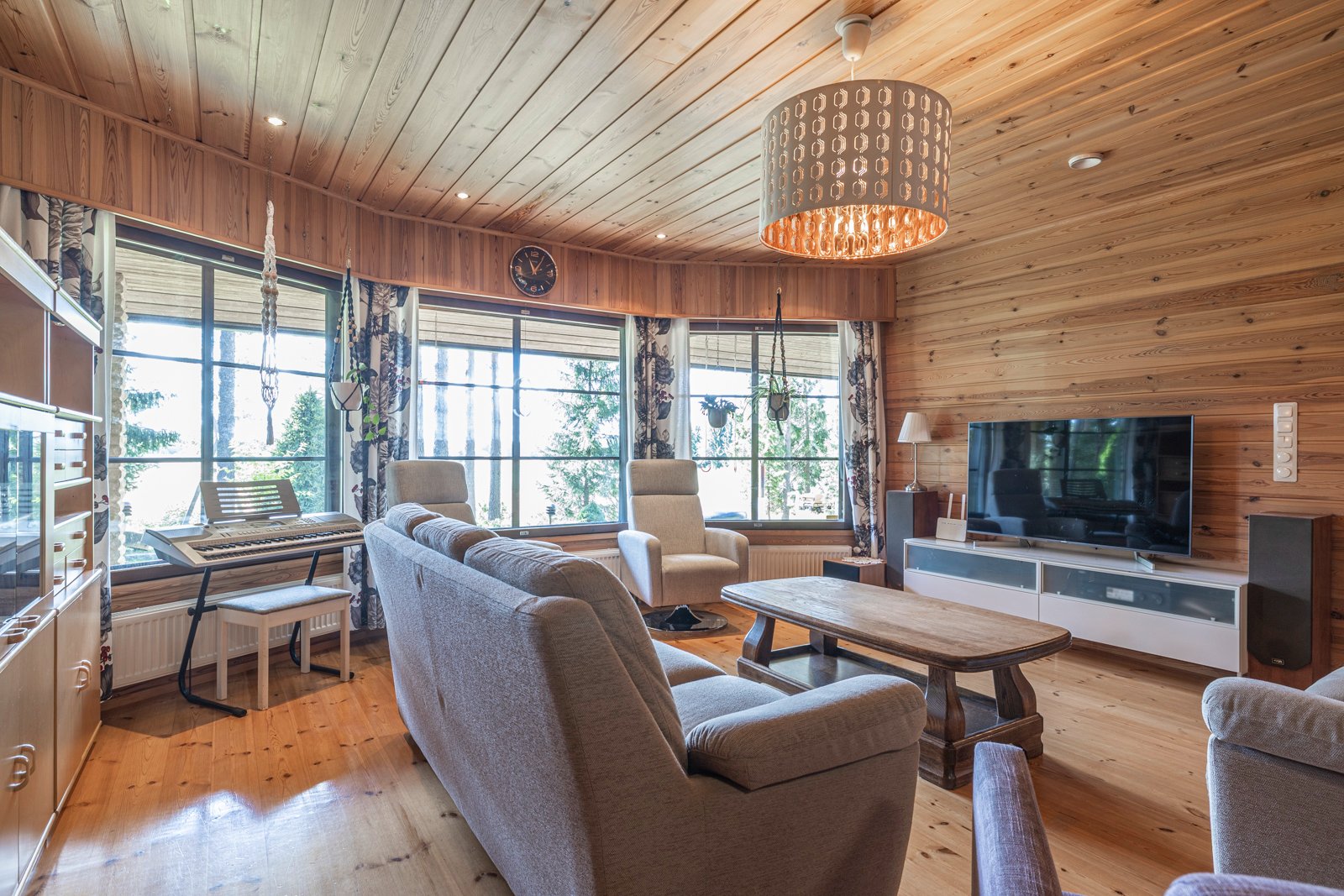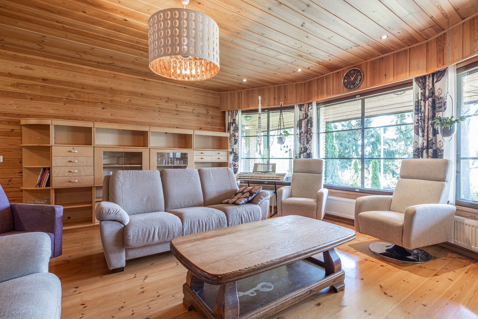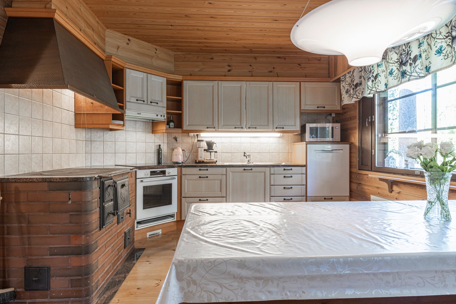Kaksikerroksisessa talossa on keittiö, neljä makuuhuonetta, kodinhoitohuone ja saunaosasto. Olohuoneen lämpöä sekä tunnelmaa luo varaava takka, joka on oivallinen lisä talon puu- ja öljylämmitysjärjestelmään. Keittiö on varustettu laadukkailla kodinkoneilla, ja puuliesi tuo ripauksen perinteistä tunnelmaa ruoanlaittoon. Ilmanvaihto on koneellinen ja kiinteistölle tulee kunnan vesi.