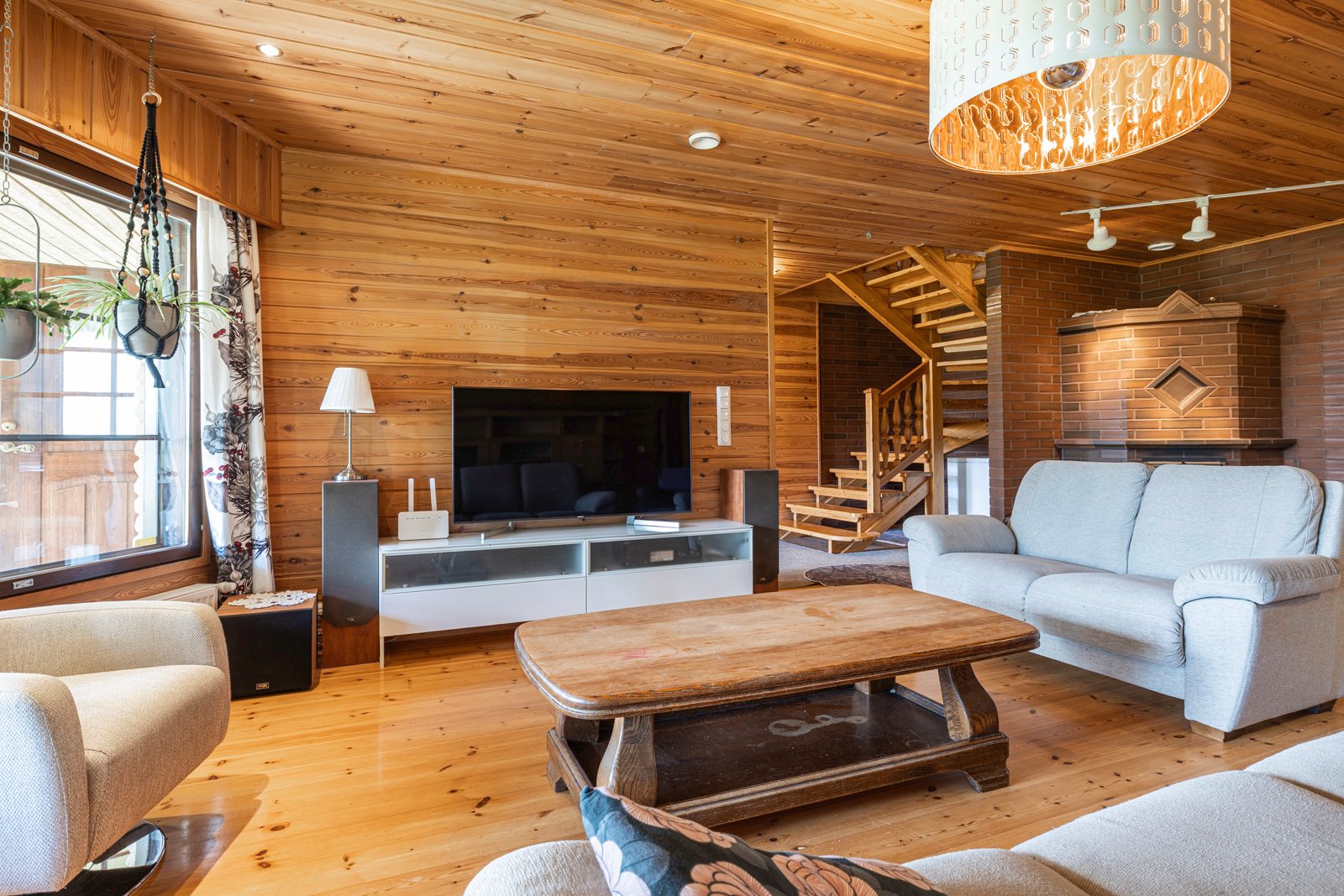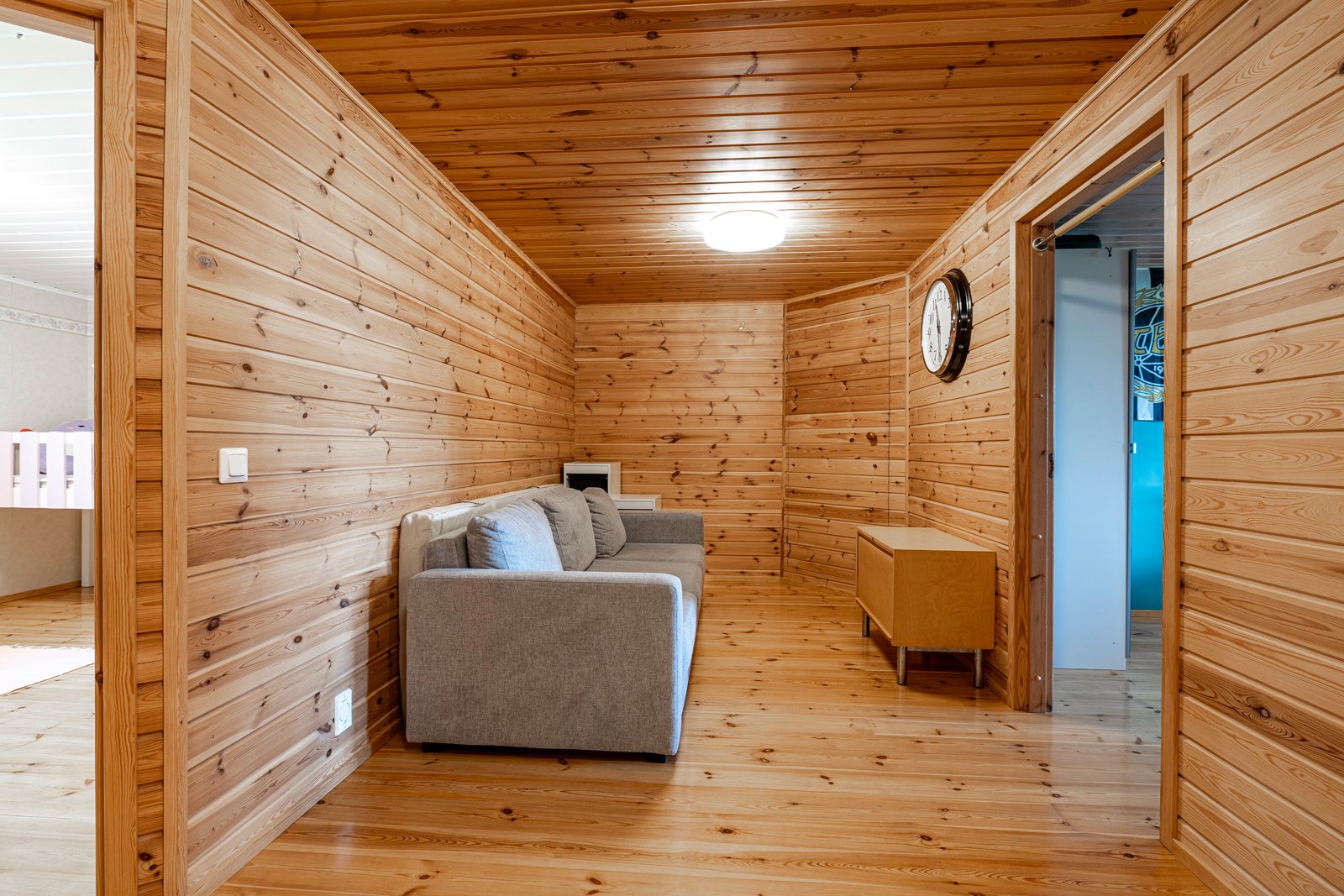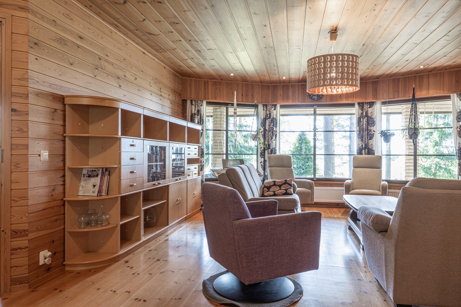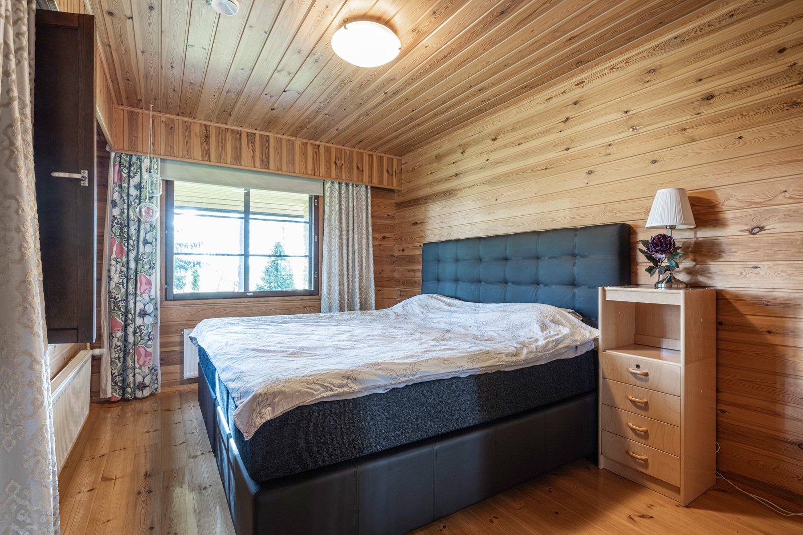 Kaksikerroksisessa talossa on keittiö, neljä makuuhuonetta, kodinhoitohuone ja saunaosasto. Olohuoneen lämpöä sekä tunnelmaa luo varaava takka, joka on oivallinen lisä talon puu- ja öljylämmitysjärjestelmään. Keittiö on varustettu laadukkailla kodinkoneilla, ja puuliesi tuo ripauksen perinteistä tunnelmaa ruoanlaittoon. Ilmanvaihto on koneellinen ja kiinteistölle tulee kunnan vesi.