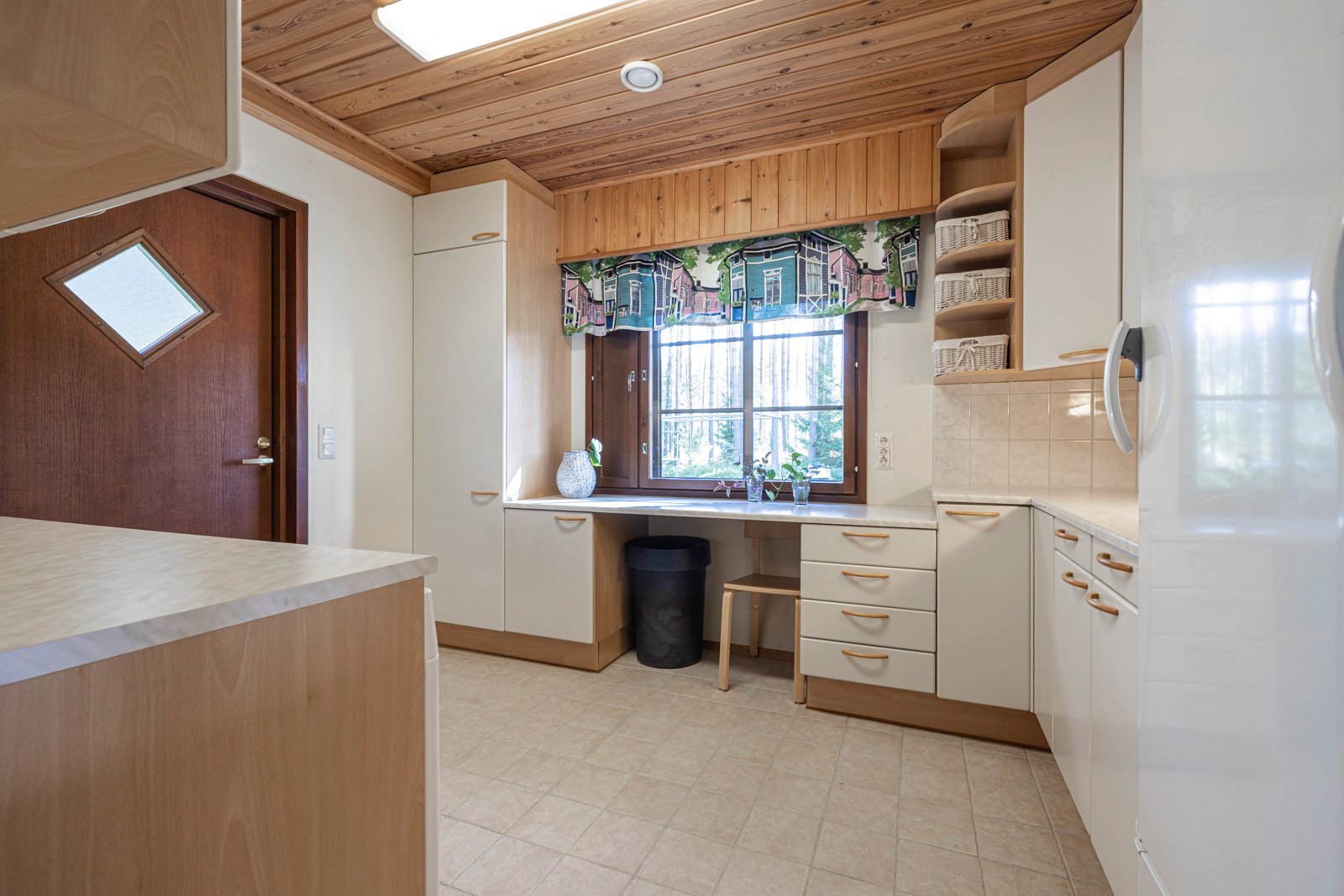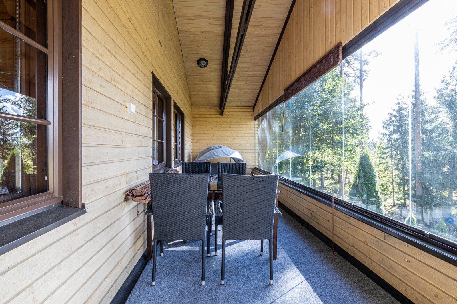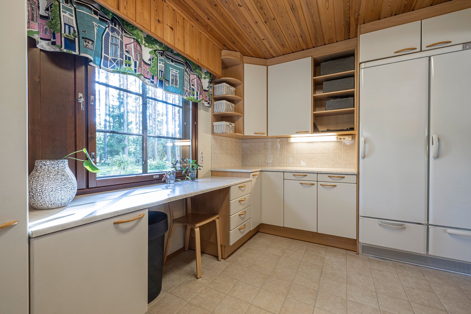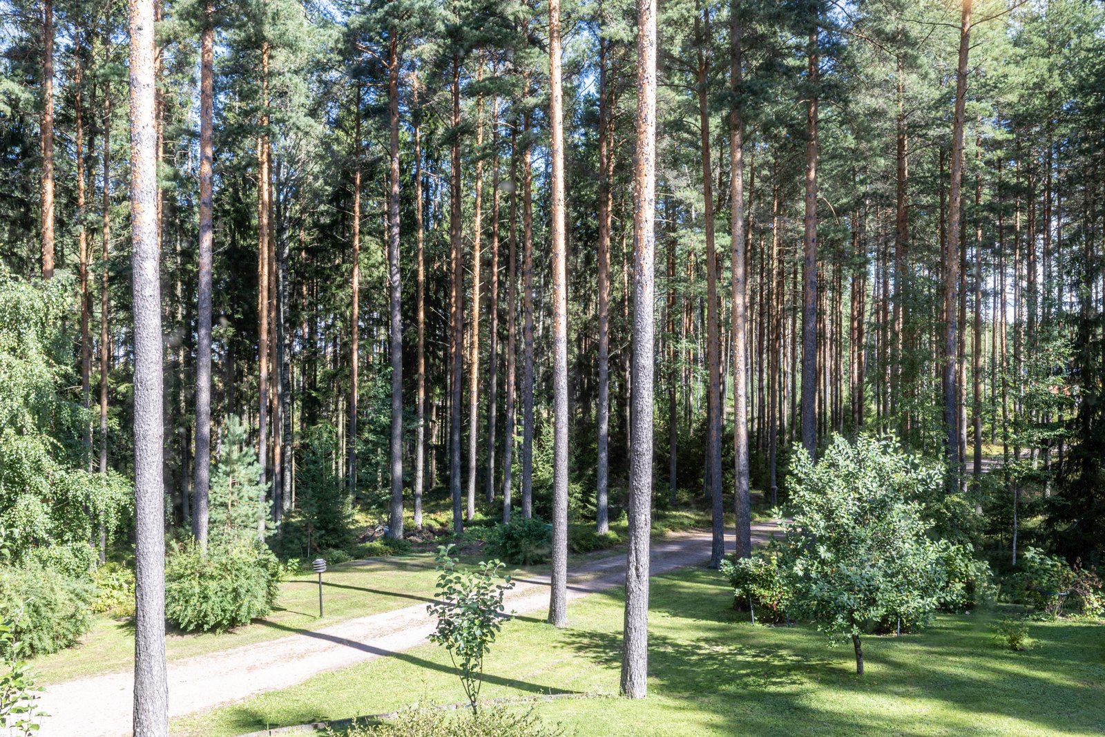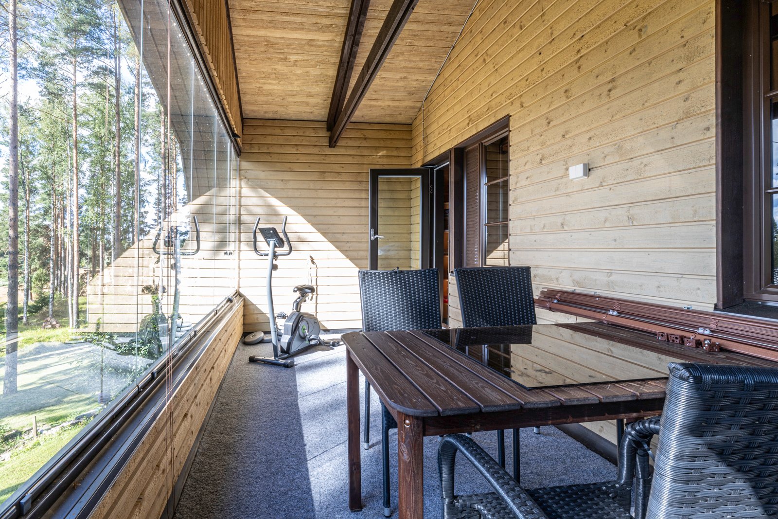 Etelään avautuva parveke tarjoaa oivan paikan nauttia auringosta ja kauniista metsämaisemista. Säilytystilaa on runsaasti, sillä talosta löytyy vaatehuone, kaapistot sekä autotalli.