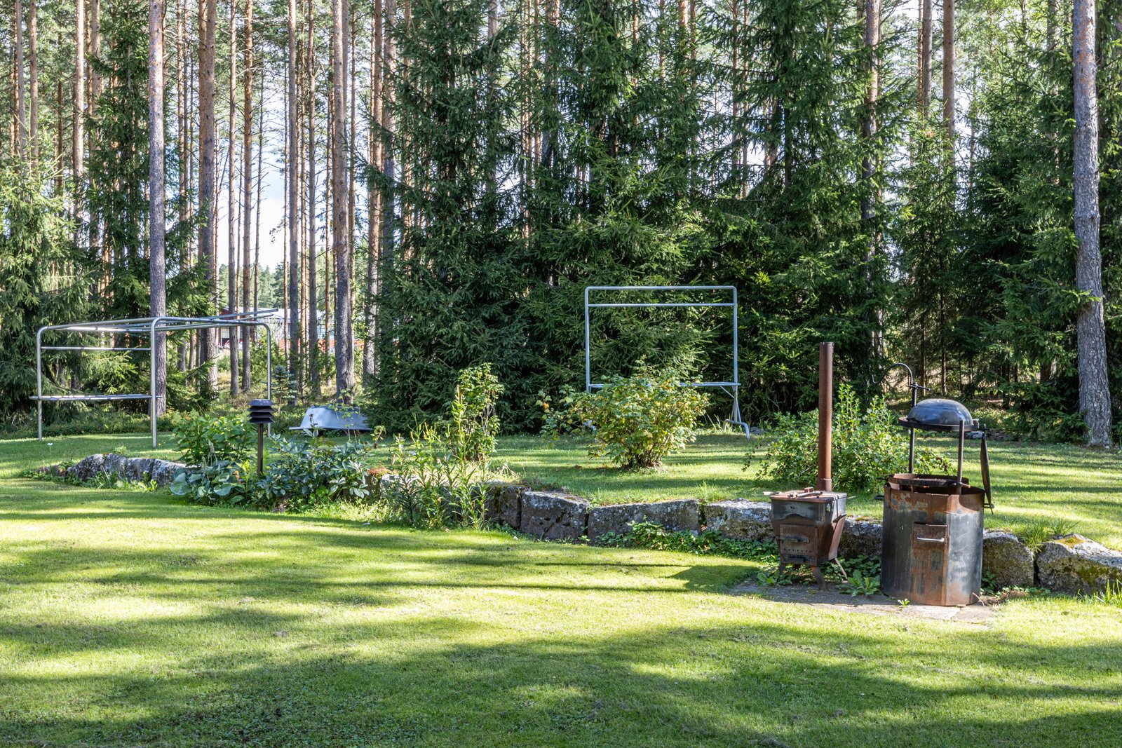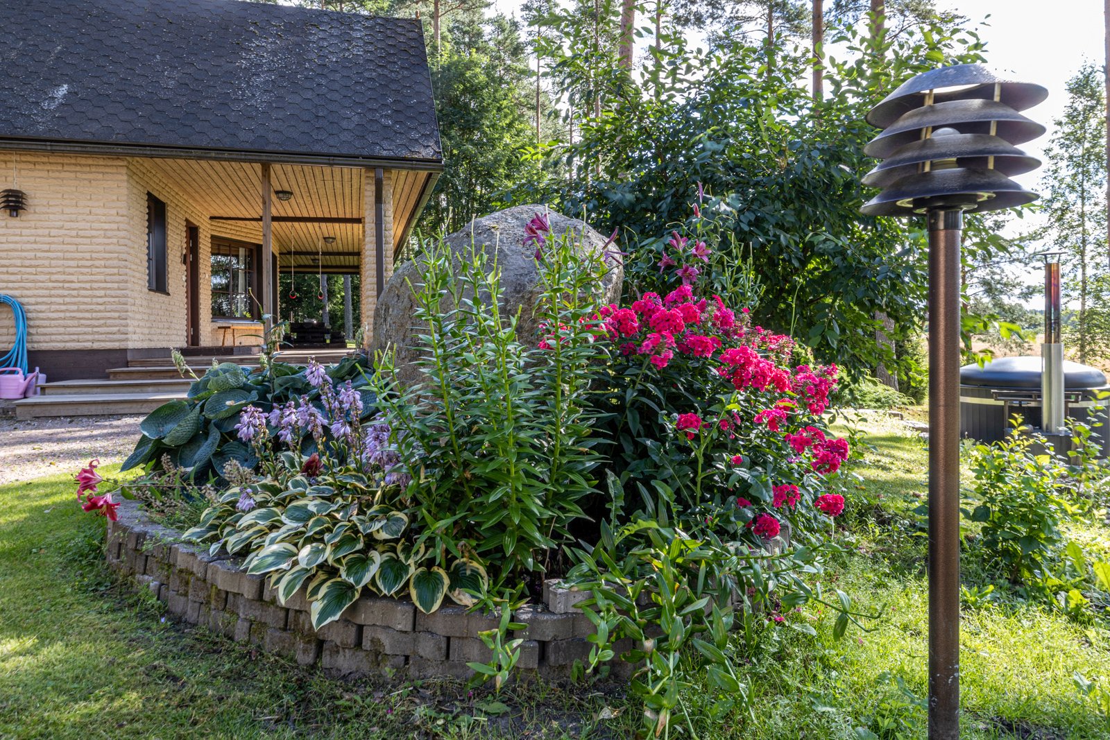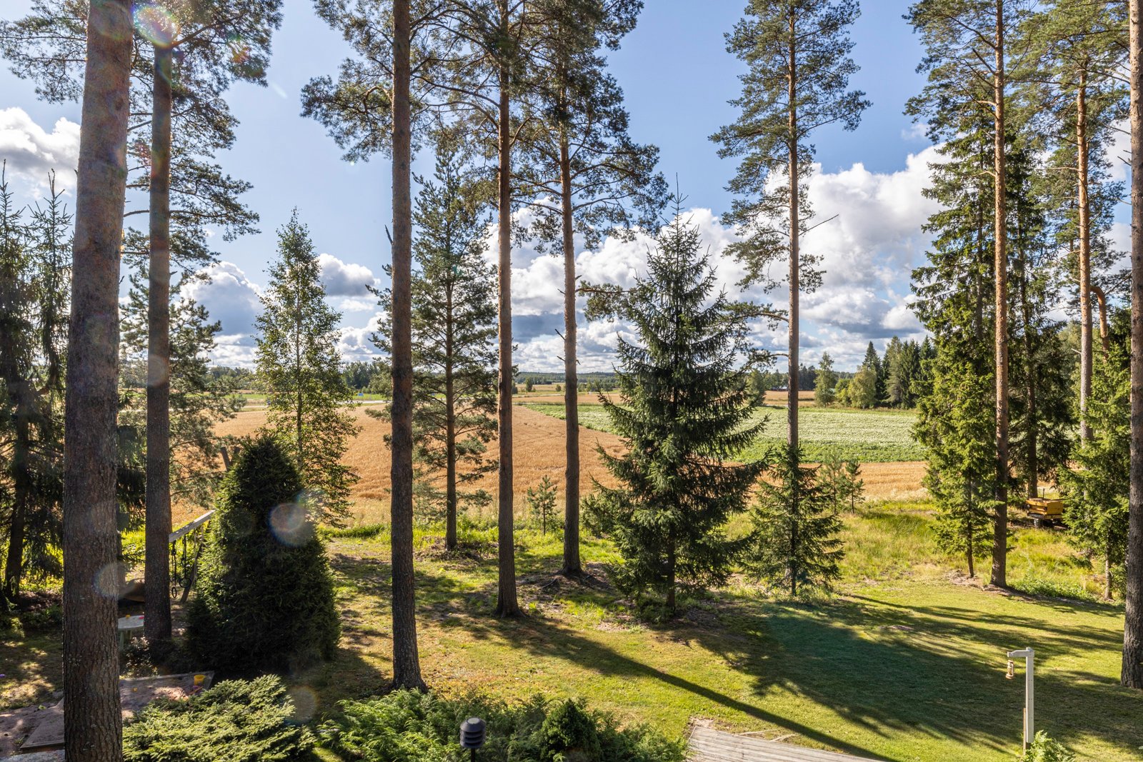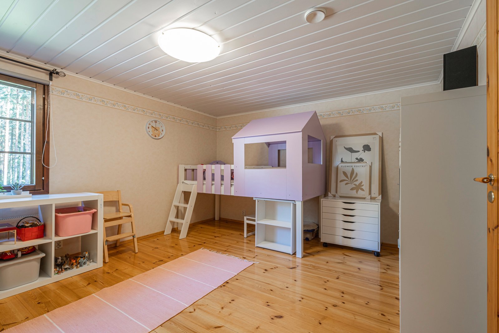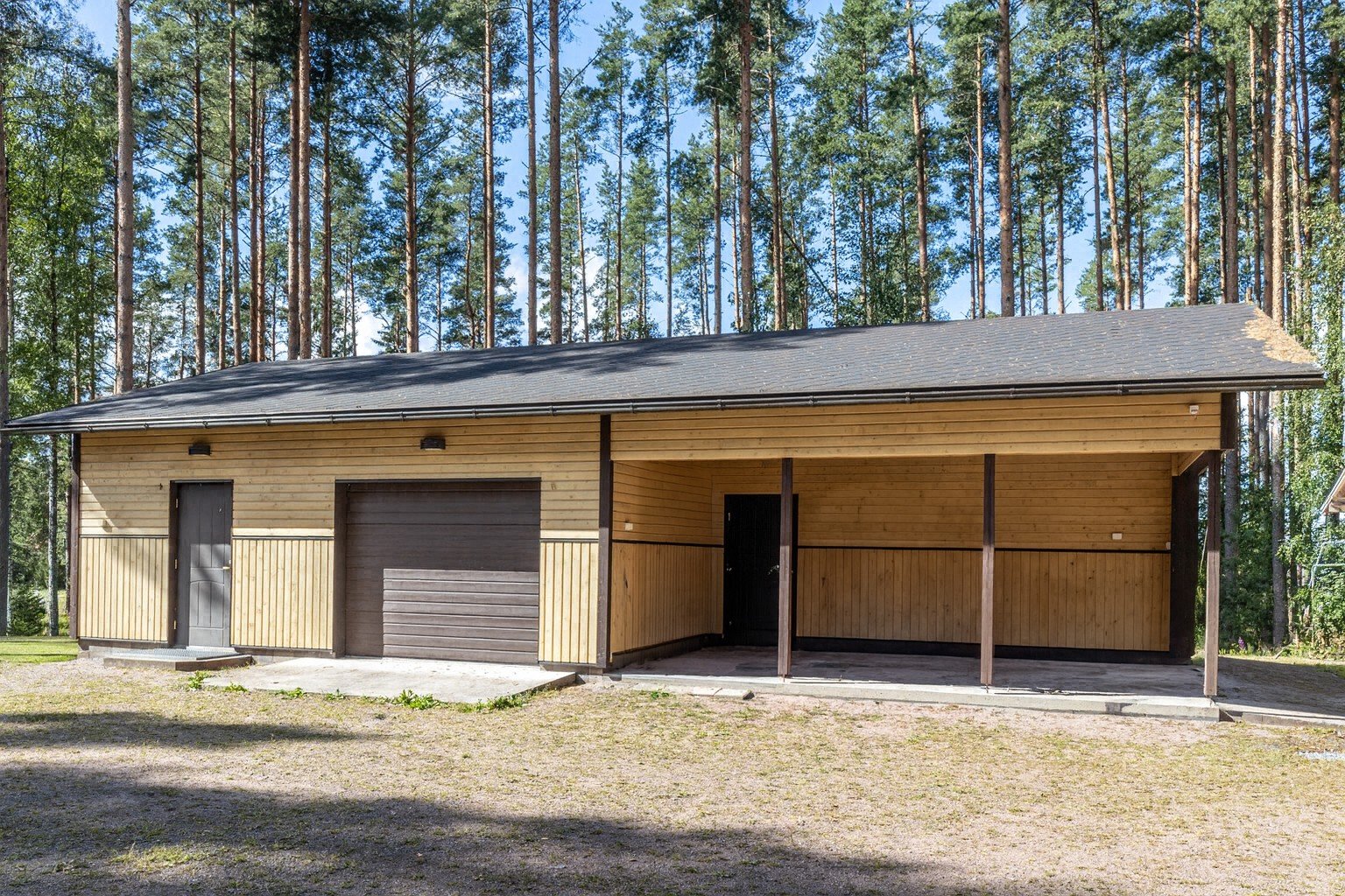 Etelään avautuva parveke tarjoaa oivan paikan nauttia auringosta ja kauniista metsämaisemista. Säilytystilaa on runsaasti, sillä talosta löytyy vaatehuone, kaapistot sekä autotalli.