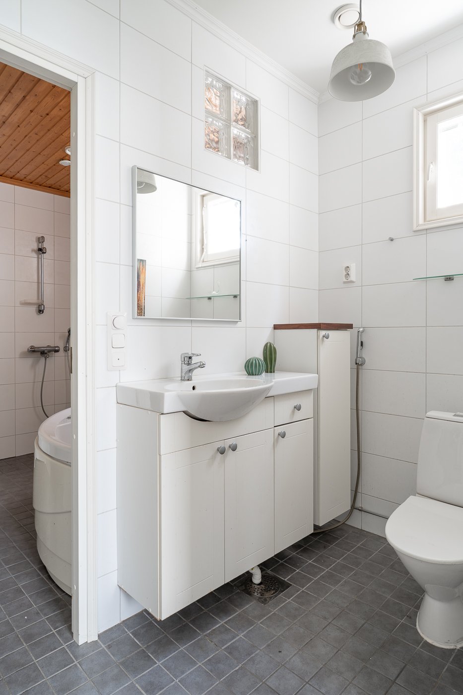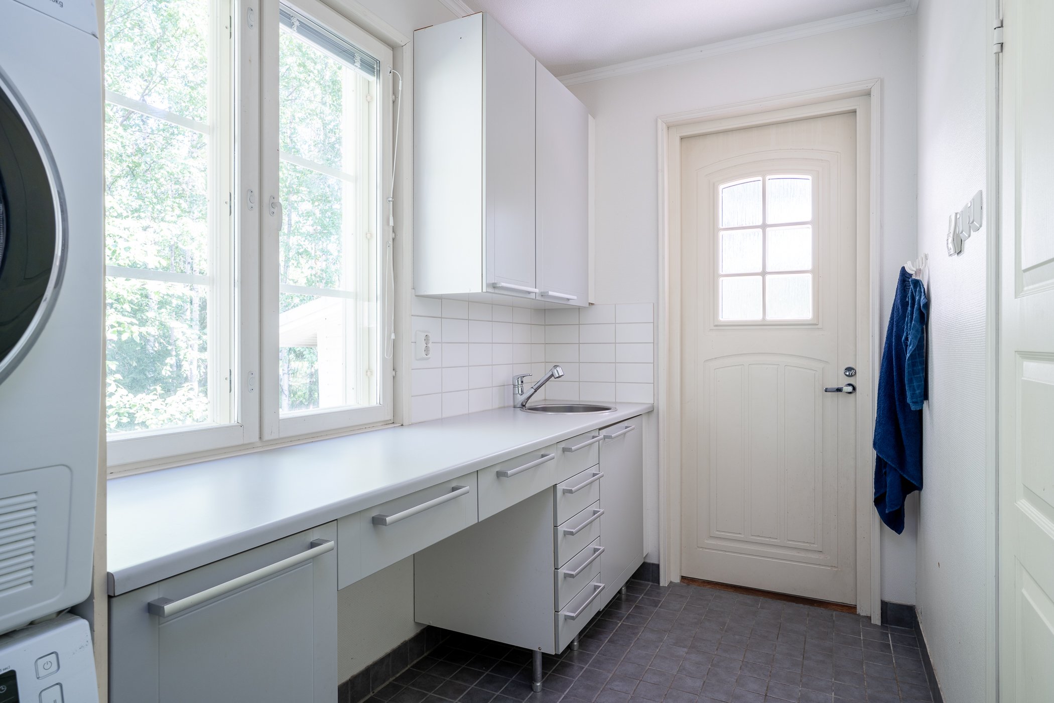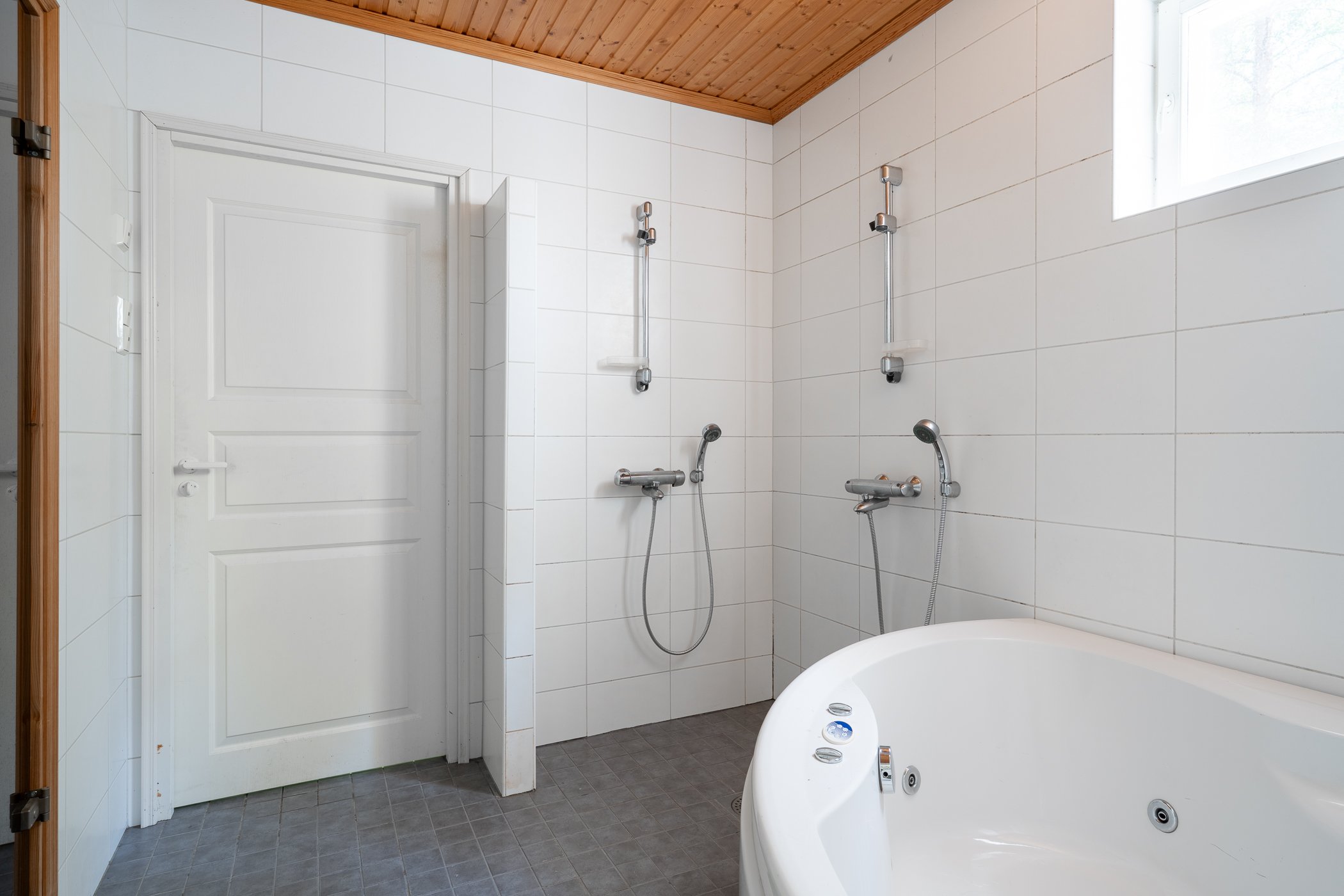 Keittiön jatkeena on näppärästi kodinhoitotila, josta pääsee myös pihalle, sekä kylpytiloihin. Kylpyhuoneosasto on avara ja se on varusteltu kolmella suihkulla, sekä poreammeella. Täällä pääsee nauttimaan myös oman saunan löylyistä. Arjen toimivuuteen talosta löytyy kaksi wc:tä. Säilytystilaa tarjoavat useat kaapistot, vaatehuone, tekninen tila/varasto, sekä autotalli.
