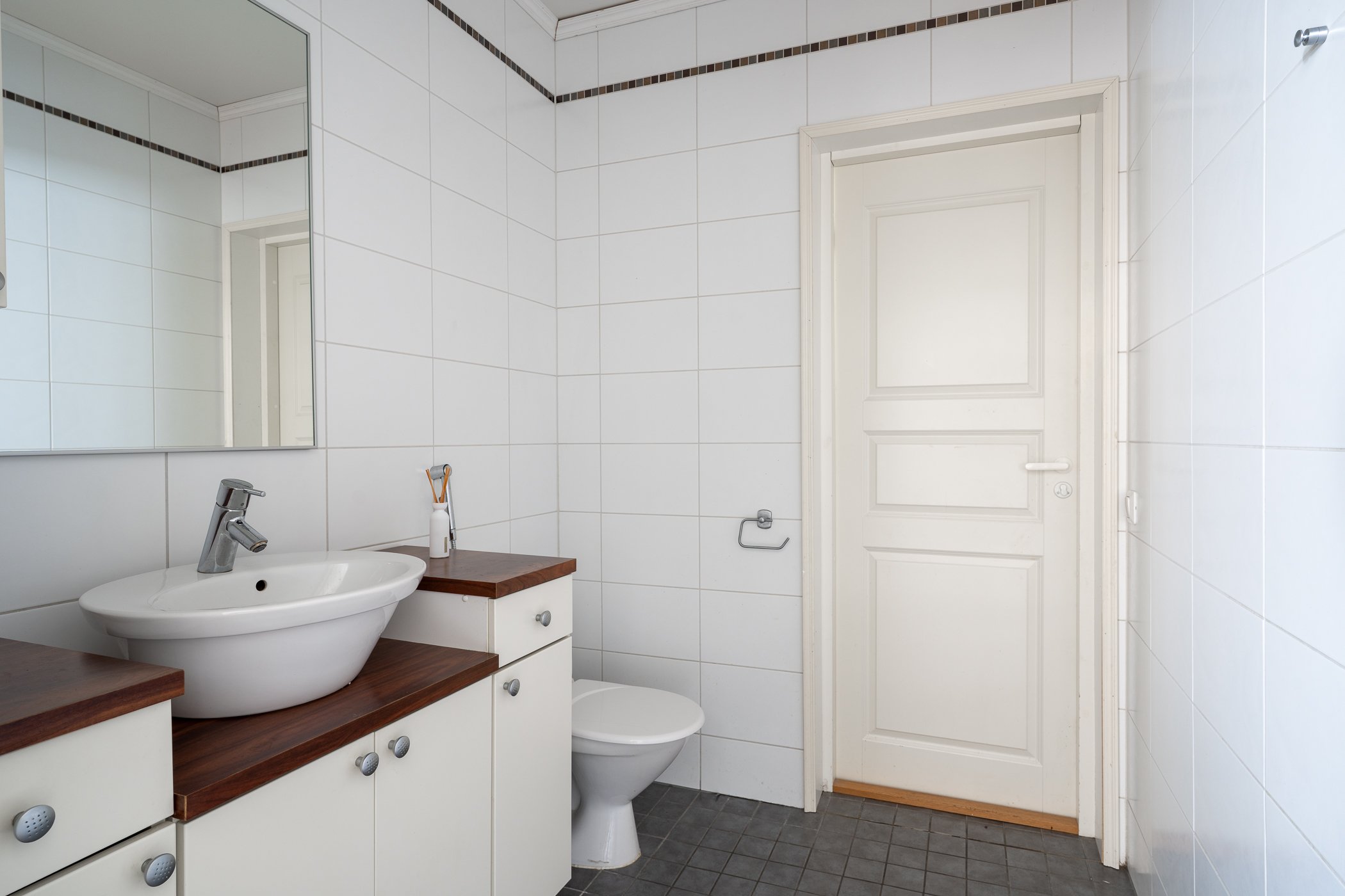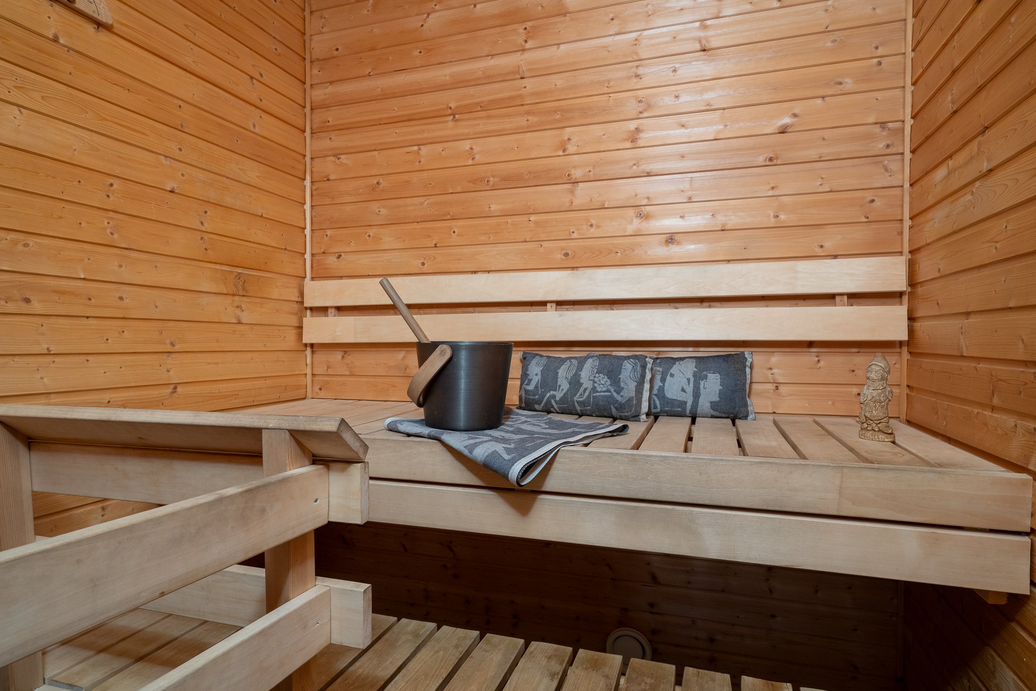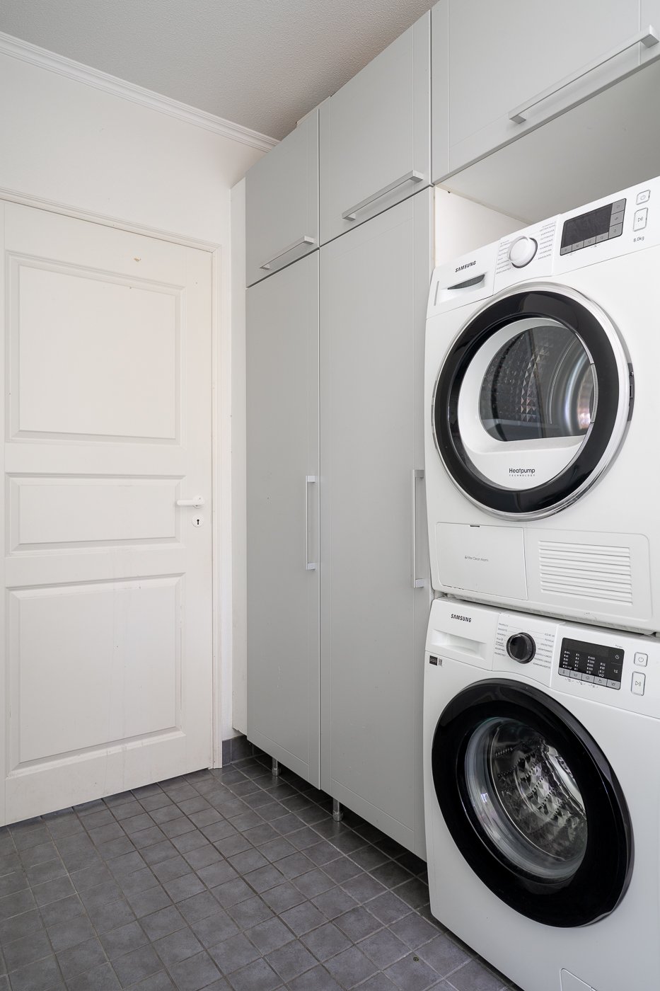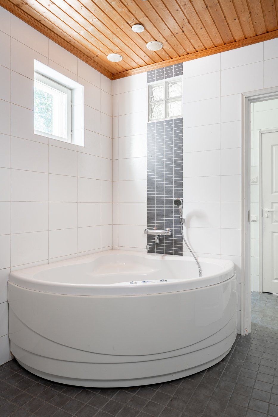 Keittiön jatkeena on näppärästi kodinhoitotila, josta pääsee myös pihalle, sekä kylpytiloihin. Kylpyhuoneosasto on avara ja se on varusteltu kolmella suihkulla, sekä poreammeella. Täällä pääsee nauttimaan myös oman saunan löylyistä. Arjen toimivuuteen talosta löytyy kaksi wc:tä. Säilytystilaa tarjoavat useat kaapistot, vaatehuone, tekninen tila/varasto, sekä autotalli.